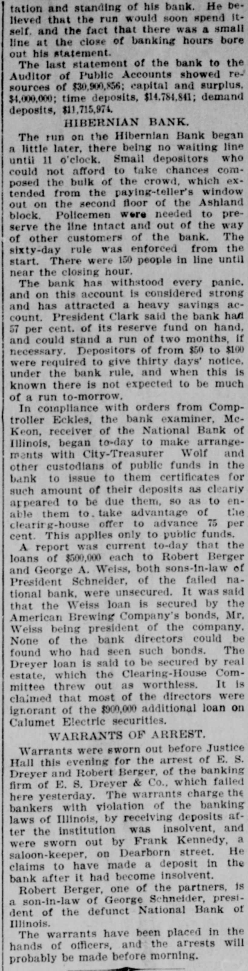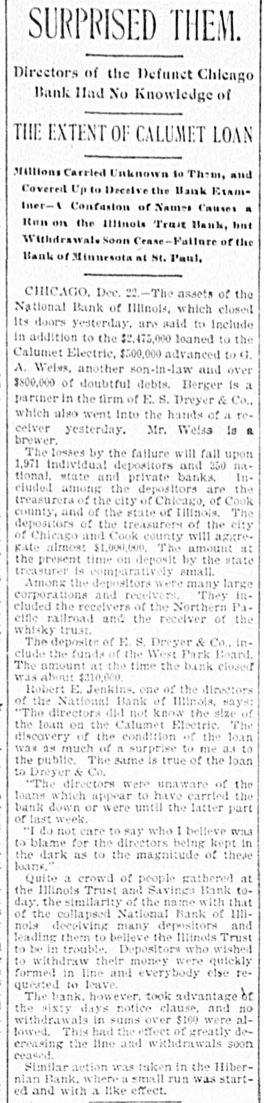SURPRISED THEM. Directors of the Defunct Chiengo Bank Had No Knowledge of THE EXTENT OF CALUMET LOAN Millions Carried Unknown 10 Them, and Covered Up to Deceive the Bank ExamIner-A Confaston of Names Causes n Run on the Illinois Trust Bank, but Withdrawal. Soon Cense-Fatture of the Bank of Minnesota at St. Paul, CHICAGO, Dec. 22.-The assets of the National Bank of Illinois, which closed Its doors yesterday, are said to include in addition to the $2,475,000 loaned to the Calumet Electric, $500,000 advanced to G. A. Welgs, another son-in-law and over $800,000 of doubtful debts. Berger is a partner in the firm of E. S. Dreyer & Co., which also went into the hands of a recelver yesterday. Mr. Weise is R brewer. The losses by the failure will fall upon 1,971 Individual depositors and 350 national, state and private banks Included among the depositors are the treasurera of the city of Chicago, of Cook county, and of the state of Illinois. The depositors of the treasurers of the city of Chicago and Cook county will aggregate almost $1,000,000. The amount at the present time on deposit by the state treasurer is comparatively small. Among the depositors were many large corporations and receivers. They included the receivers of the Northern Pacifle railroad and the receiver of the whisky trust. The deposits of E.S. Dreyer & Co., include the funds of the West Park Board. The amount at the time the bank closed was about $310,000. Robert E. Jenkins, one of the directors of the National Bank of Illinois, ways: "The directors did not know the size of the loan on the Calumet Electric. The discovery of the condition of the loan was as much of a surprise to me as to the public. The same is true of the loan to Dreyer & Co. "The directors were unaware of the loans which appear to have carried the bank down or were until the latter part of last week. "I do not care to say who I believe was to blame for the directors being kept in the dark as to the magnitude of these loans. Quite a crowd of people gathered at the Illinois Trust and Savings Bank today, the similarity of the name with that of the collapsed National Bank of IIIInois deceiving many depositors and leading them to believe the Illinois Trust to be in trouble. Depositors who wished to withdraw their money were quickly formed in line and everybody else requested to leave. The bank. however, took advantage of the sixty days notice clause, and no withdrawals in sums over $100 were allowed. This had the effect of greatly decreasing the line and withdrawals soon ceased. Similar action was taken in the Hibernian Bank. where a small run was started and with a like effect.
