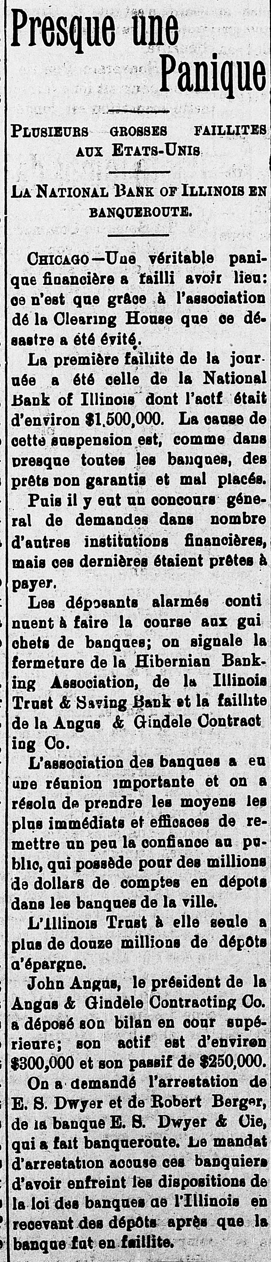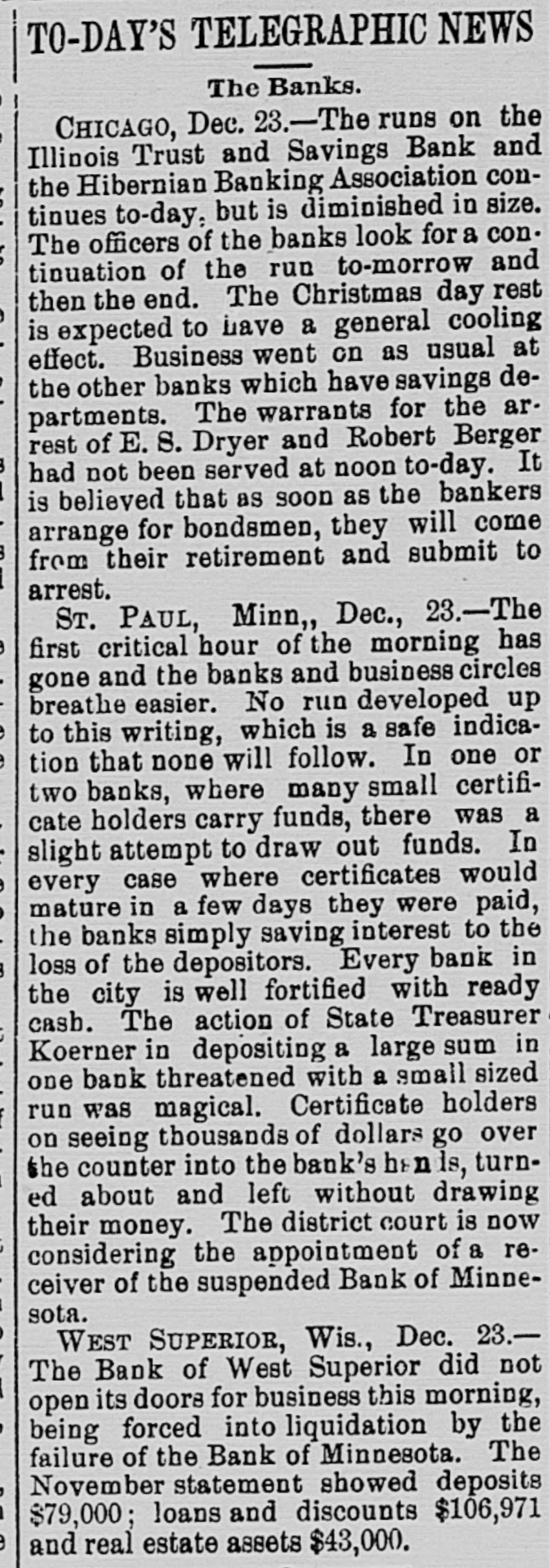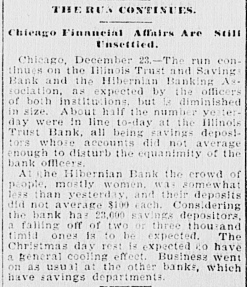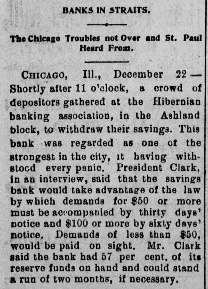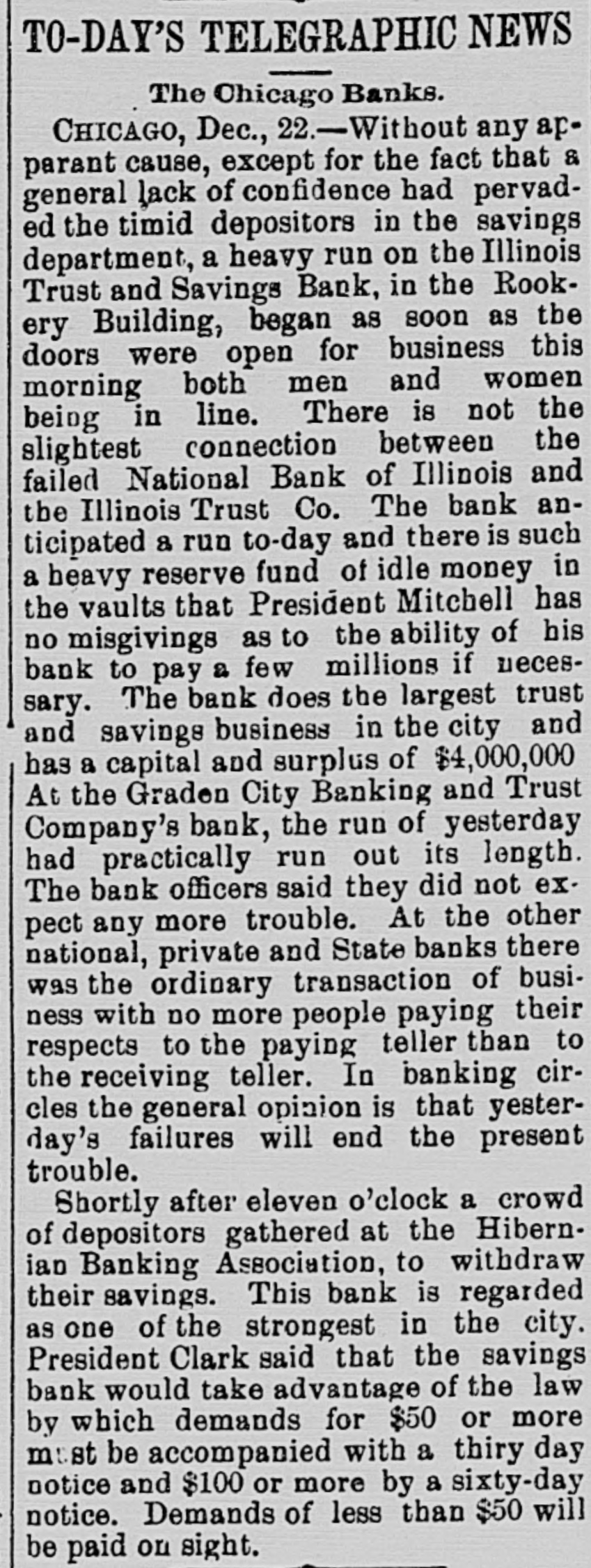 But Small Depositors Cause a Run on Some of Chicago's Institutions. Unexpected Failure of the Bank of Minnesota, but Creditors Will Be Paid in Full. CHICAGO, ILL., Dec. 22.-A steady run of savings depositors on the Hibernian Banking Association and the Illinois Trust and Savings Bank and the failure of the Angus & Gindele Contracting Company, which is credited with getting a loan of $250,000 from the failed National Bank of Illinois, comprised the developments of to-day in connection with the financial flurry. The associated banks have taken prompt, thorough and conservative action to avoid a serious scare on the part of the public, which has millions of dollars in savings accounts deposited with city banks. The Illinois Trust leads all the local banks in its savings deposits, having nearly $12,000,000. The Hiberaian Bank has less than $3,400,000 of such accounts. The solid showing made by the banks which did not lean on the collapsed National bank had a reassuring effect on the public to-day when the morning papers were perused, and the general feeling in the banking community was that the worst was over so far as those institutions were concerned. At a conference of the savings banks of the city, which was held when the runs began at the Hibernian and Illinois Trust banks, it was unanimously agreed to adopt an unusual means toward checking what might become an epidemic of apprehension. Instead of attempting to allay the scare by paying all demands in full on the spot, which has proven to be an unwise policy in the past, the banks decided to stand upon their statutory rights and demand notice of sixty days in case of all withdrawals exceeding $100. John Angus, president of the Angus & Gindele Contracting Company, appeared in the Superior Court this afternoon with a bill petitioning for the appointment of a receiver. He made George A. Gindele, secretary and treasurer of the company, defendant for the purpose of obtaining a receivership, and substantially the same allegations were made as in the DreyerWasmansdorff case yesterday. The financial condition of the company was said to be such that a receiver was needed at once to conserve the assets and protect all interests. The answer filed by Gindele admitted the substance of the petition and Judge Horton did not hesitate to appoint William Hill receiver. According to the statement made by the attorneys for the company the assets are estimated to be worth $300,000, and liabilities are placed at $250,000. These figures are believed to be largely guesswork, however, and exaggerated in case of the assets. It is said the firm owes the National Bank of Illinois alone $250,000 for money borrowed, and the security is said to be of a class which will be slow to realize on. The present partnership was formed in 1888. The company had a large contract on the drainage canal, and was the principal owner of the Security building at Madison street and Fith avenue, which was built by the firm. Mr. Angus 18 president of the Security Deposit Company, which owns the building, and Mr. Gindele is the treasurer. The capital stock of the building company is $500,000. There is a mortgage for $180,000 on it, and it is bonded for $150,000, secured by second mortgage. This building is believed to be the bestrasset of the contracting company. It has been in financial trouble for a long time. Part of the Lake-street Elevated Railroad was built by the firm. The only reason which can be thought of by the officers of the Illinois Trust and Savings Bank for the run on that bank, apart from the general one of conagious timidity, is that ignorant people, hearing or reading of the failure of the National Bank of Illinois, got it confounded with the only other bank of the city which has the word Illinois in its title. In fact, many money-seeking depositors who hurried from their homes admitted, when they reached the waiting line, that they had heard the bank had failed, while money was being paid out and received under their eyes. Meddlesome busybodies and fool friends, who had wrought on the fears of depositors and had even accompanied them to the bank, were ordered by police officers and bank detectives to await their friends outside. The line of men and women who wanted their money numbered 200 during most of the five hours the bank was open, and the curious crowd of spectators added to the excitement. Where deposits exceeded $100 that amount only was paid and the sixty days' notice enforced as to the remainder. While President John J. Mitchell said the \bank had money enough to pay all depositors in full he declared the sixtyday rule decision would not be misinterknew the reputation