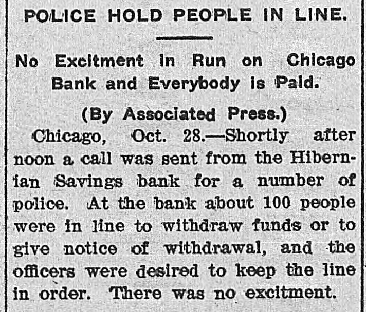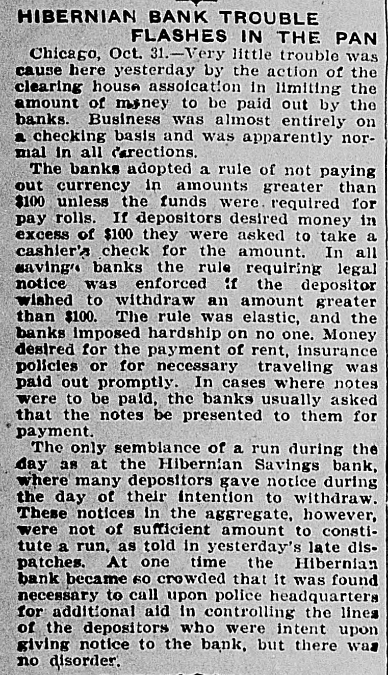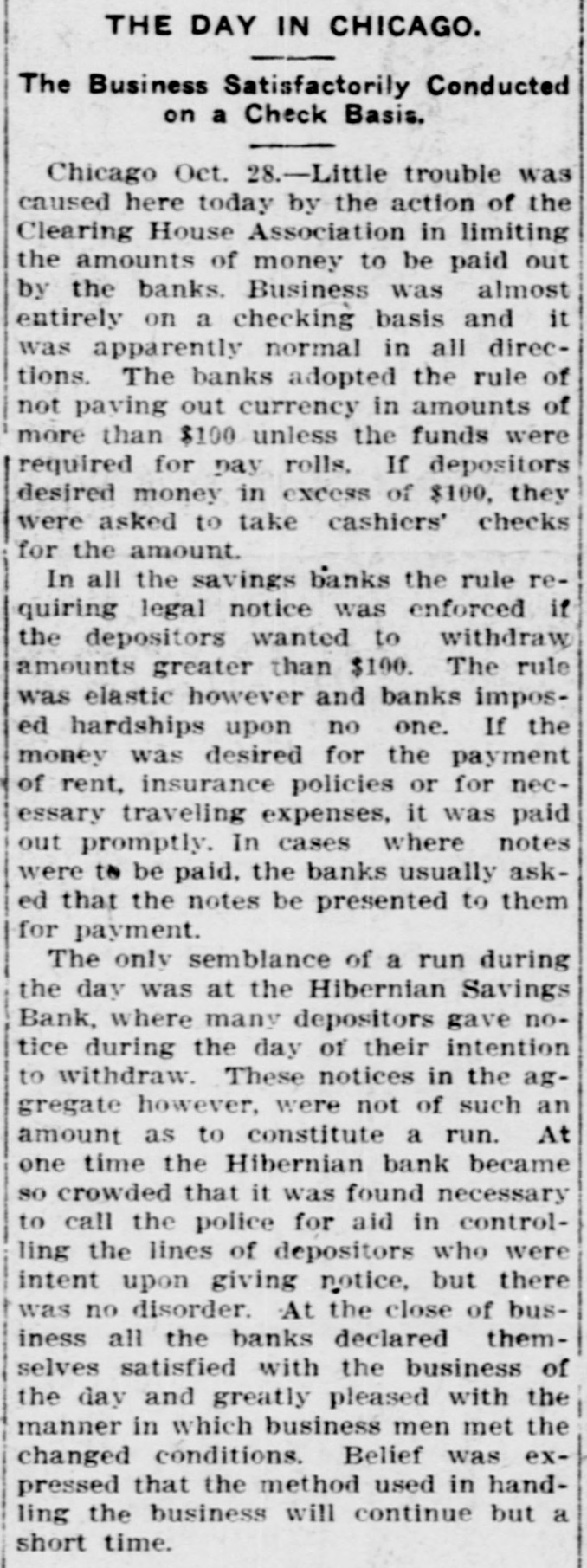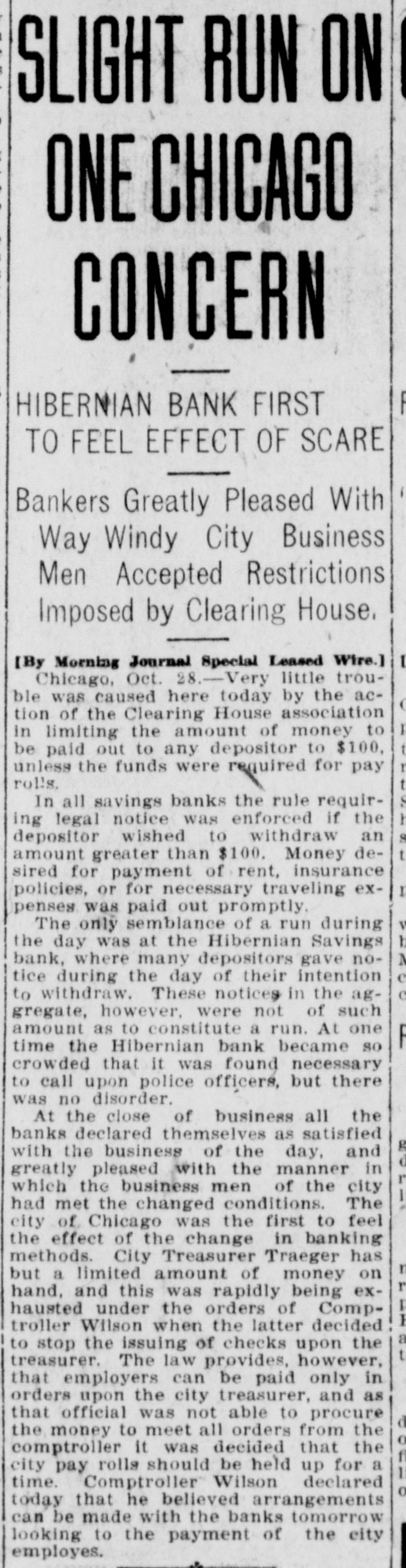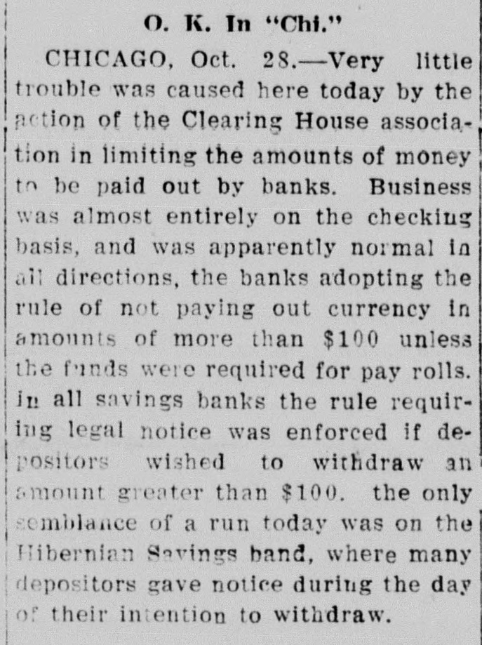 Few Wish to Withdraw. Out of 400,000 savings depositors in Chicago only 1,500 made application for withdrawals of their accounts, or gave notice of a desire to withdraw. The clearing house issued to its members $8,000,000 in certificates. The debit balances which had to be settled with the certificates were far smaller than usual, approximating barely $1,500,000. John J. Mitchell, president of the Illinois Trust & Savings bank, which has the largest number of savings accounts in the city, said today: "We are pleased and satisfied over the turn affairs took yesterday. This bank received notice from 809 depositors who wanted cash. As an offset to that we received 89 savings deposits, aggregating a sum far in excess of the amount for which withdrawal orders were received. Under the circumstances I think the situation is surprisingly strong." Excitement Had Vanished. The day opened quietly at the Hibernian Savings bank, which yesterday had the only trace of excitement in the banking situation. A few depositors were at the door when the bank opened, but a number of them went away without giving a notice of a desire to withdraw funds. All the other banks in the city which had savings accounts business appeared to be on an adequately normal basis, there being no more people around than usual. At all of the national banks the officers reported that the check and certificate system had worked in a satisfactory manner and no trouble of any kind was anticipated. Throughout the west generally it was reported that the financial condition is sound and that there is no appearance of a run upon a bank anywhere. At a meeting of the Chicago clearing house association it was decided that the situation was generally satisfactory, and it was agreed that the policy of paying large amounts in checks should be continued for a few days. Gold for Chicago. James B. Forgan, president of the First National bank, said the most singular event he ever heard of in relation to the financial outlook was the notification by London agents that $2,000,000 in gold had been started for Chicago. This gold was in payment for shipping from Chicago of cattle, grain and provisions. "For a few days Europe did not respond with cash," said Mr. Forgan, "but today our London agents cabled that $2,000,000 in gold had been turned over to them and, that it had been started for Chicago. The fact that gold is coming in such large quantities and that merchandise and provisions are en route to the European markets in such heavy lots is indicative of a big advance. On Sunday I understand the National City bank of New York received $3,500,000 in gold, and now that the First National of Chicago is getting an allotment, the indications are that the tension is much relieved. This gold, when it reaches our bank, will be used to expedite other shipments abroad. The foreign markets for our foodstuffs are good, and fairly high prices are ruling. Other shipments of gold are promised and while they will not be of daily occurrence, they will come our way pretty steadily." J. Ogden Armour said that the gold shipment from London was the most encouraging feature of the day's developments. "Cattle, grain and provisions are being moved to Europe," he said, "and today's shipment of $2,000,000 in gold toward Chicago is in payment for some of Chicago's goods. Money is flowing our way, and that is suggestive of better feeling all around. It is well to add that prices for grain and foodstuffs are strong. My grain company, I was informed this afternoon. is sending large amounts to Europe. Corn, too, is high and the farmers never were more prosperous."