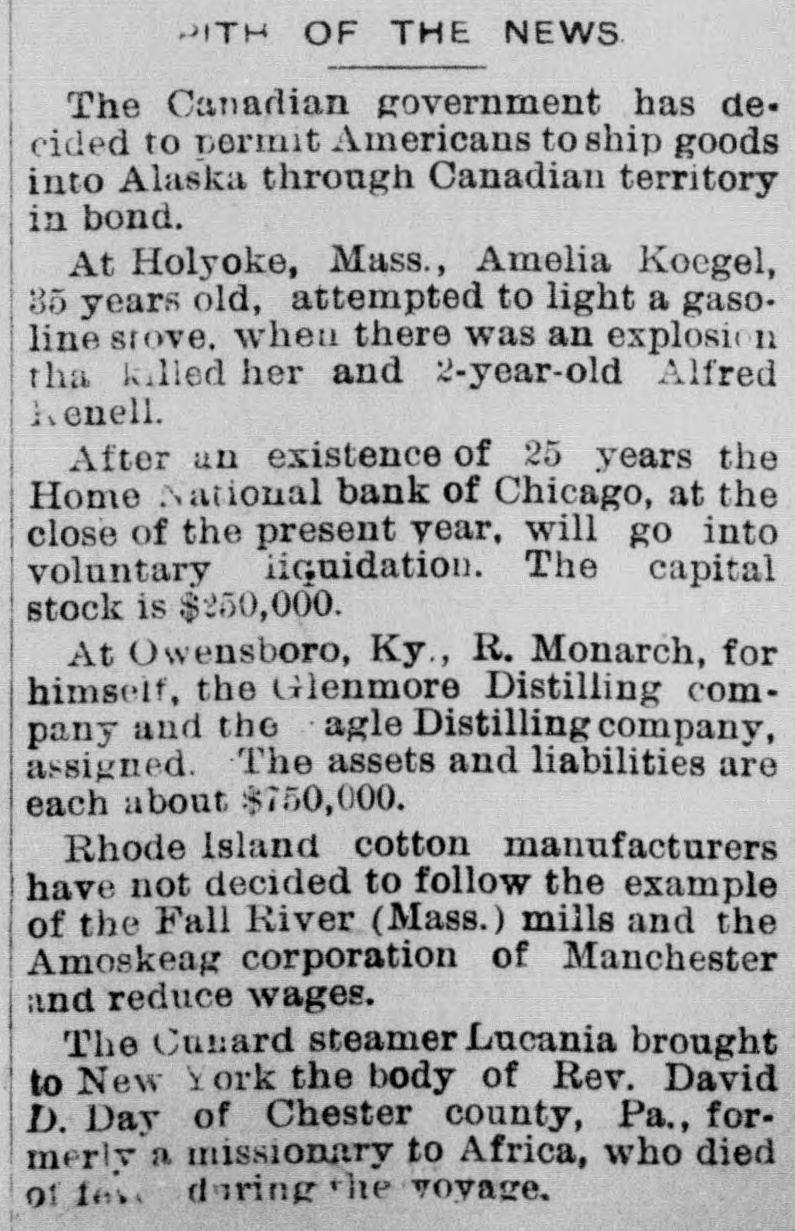 PITH OF THE NEWS The Canadian government has decided to permit Americans to ship goods into Alaska through Canadian territory in bond. At Holyoke, Mass., Amelia Koegel, 35 years old, attempted to light a gaso. line srove. when there was an explosion tha killed her and 2-year-old Alfred Renell. After an existence of 25 years the Home National bank of Chicago, at the close of the present year, will go into voluntary liquidation. The capital stock is $250,000. At Owensboro, Ky., R. Monarch, for himself, the Glenmore Distilling company and the agle Distilling company, assigned. The assets and liabilities are each about $750,000. Rhode Island cotton manufacturers have not decided to follow the example of the Fall River (Mass.) mills and the Amoskeag corporation of Manchester and reduce wages. The Cunard steamer Lucania brought to New York the body of Rev. David D. Day of Chester county, Pa., formerly a missionary to Africa, who died of fest during the voyage.
