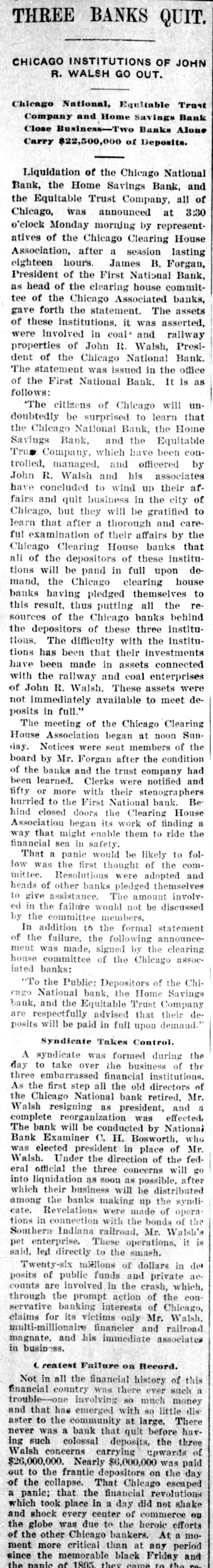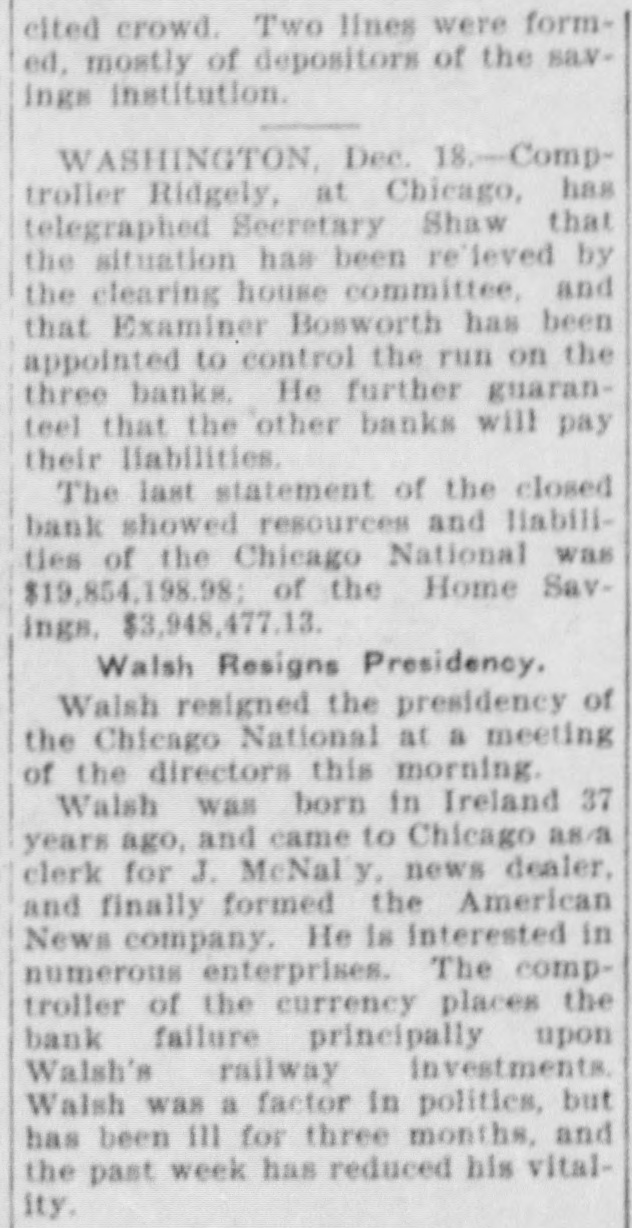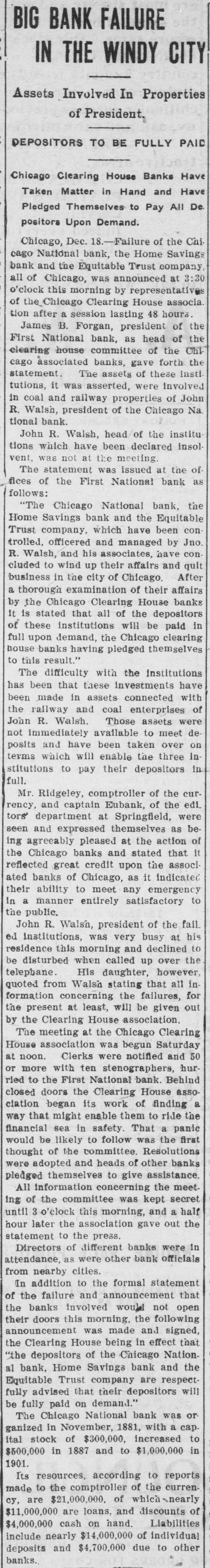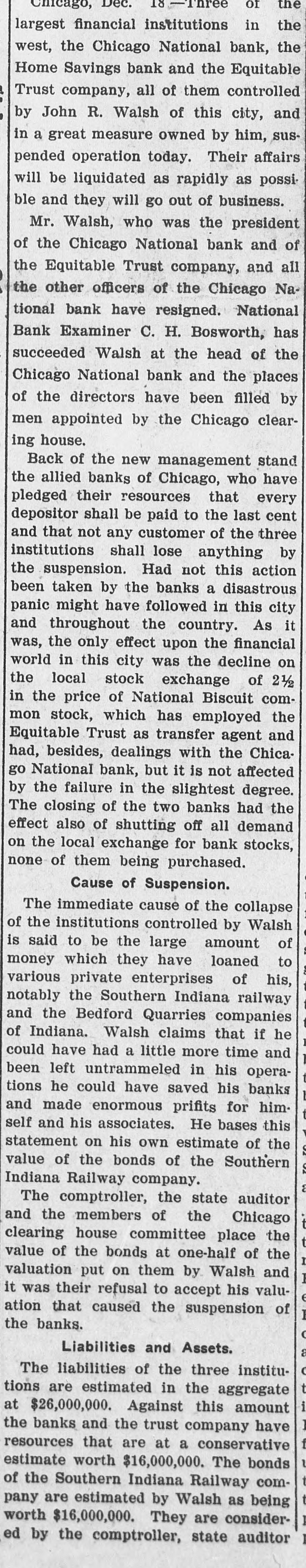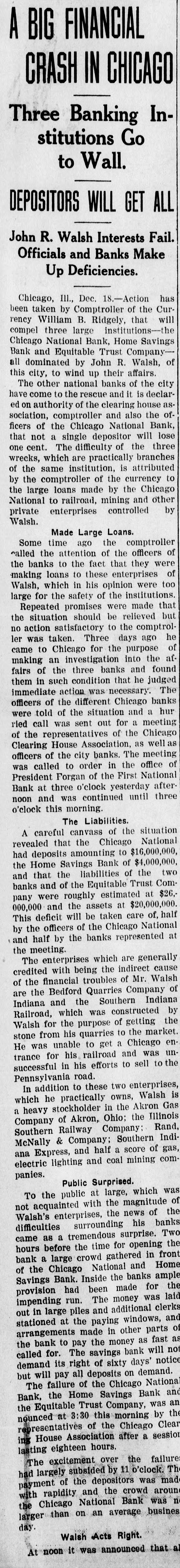 A BIG FINANCIAL CRASH IN CHICAGO Three Banking Institutions Go to Wall. DEPOSITORS WILL GET ALL John R. Walsh Interests Fail. Officials and Banks Make Up Deficiencies. has Chicago, Ill., Dec. 18.-Action been taken by Comptroller of the Currency William B. Ridgely, that will compel three large institutions-the Chicago National Bank, Home Savings Bank and Equitable Trust Companyof all dominated by John R. Walsh, this city, to wind up their affairs. The other national banks of the city have come to the rescue and it is declared on authority of the clearing house association, comptroller and also the officers of the Chicago National Bank, that not a single depositor will lose one cent. The difficulty of the three which are practically institution, is wrecks, of the same attributed branches by the comptroller of the currency to the large loans made by the Chicago National to railroad, mining and other by private enterprises controlled Walsh. Made Large Loans. Some time ago the comptroller called the attention of the officers of the banks to the fact that they were making loans to these enterprises of which in his too for the of the large Walsh, safety opinion institutions. made were promises were that should be no to the the Repeated action situation satisfactory relieved comptrol- but he ler taken. Three days ago to Chicago for the an into making came was investigation purpose and the found af of fairs of the three banks them in such condition that he judged immediate action was necessary. The officers of the different Chicago banks were told of the situation and a hur ried call was sent out for a meeting of the representatives of the Chicago Clearing House Association, as well as officers of the city banks. The meeting was called to order in the office of President Forgan of the First National Bank at three o'clock yesterday after noon and was continued until three o'clock this morning. The Liabilities. careful canvass of the situation that the Chicago revealed A $16,000,000, National had deposits amounting to the Home Savings Bank of $4,000,000, and that the liabilities of the two banks and of the Equitable Trust Comwere roughly estimated at $26, and the assets at 000,000 pany $20,000,000. of, half This deficit will be taken care by the officers of the Chicago National and half by the banks represented at the meeting. The enterprises which are generally credited with being the indirect cause of the financial troubles of Mr. Walsh of Bedford Quarries Company and the are Indiana the Southern constructed Indiana Railroad, which was by for the purpose of from his quarries to Walsh stone getting Chicago the market. the He was unable to get a entrance for his railroad and was the unsuccessful in his efforts to sell to Pennsylvania road. to these two he practically owns, which In addition enterprises, Akron Walsh Gas is heavy stockholder in the a Company of Akron, Ohio: the Illinois Rand, Southern Railway Company McNally & Company Southern IndiExpress, and half a score of gas, electric ana lighting and coal mining com panies. Public Surprised. To the public at large, which was of not acquainted with the magnitude the Walsh's enterprises, the news of banks difficulties surrounding his Two came as a tremendous surprise. hours before the time for opening the bank a large crowd gathered in Home front National and Bank. Inside the had been made Savings of provision the Chicago banks was for ample laid the run. The money in large piles and at the paying stationed out impending additional windows, parts clerks and of made in bank to pay the money as called for. The savings bank arrangements the other will fast notice not as its right of sixty days' will pay all deposits on failure of the Chicago but demand The demand. Bank National the Home Savings and Trust Company, at 3:30 this nounced the Bank, Equitable morning was by Clear the an of the Chicago House Association after a ing representatives hours. session lasting eighteen The excitement over the failure largely subsided by 11 o'clock. Th payment had of the depositors was mad with rapidity and the crowd around Chicago National Bank was n the larger than on an average business day. Walsh Acts Right. At noon it was announced that a