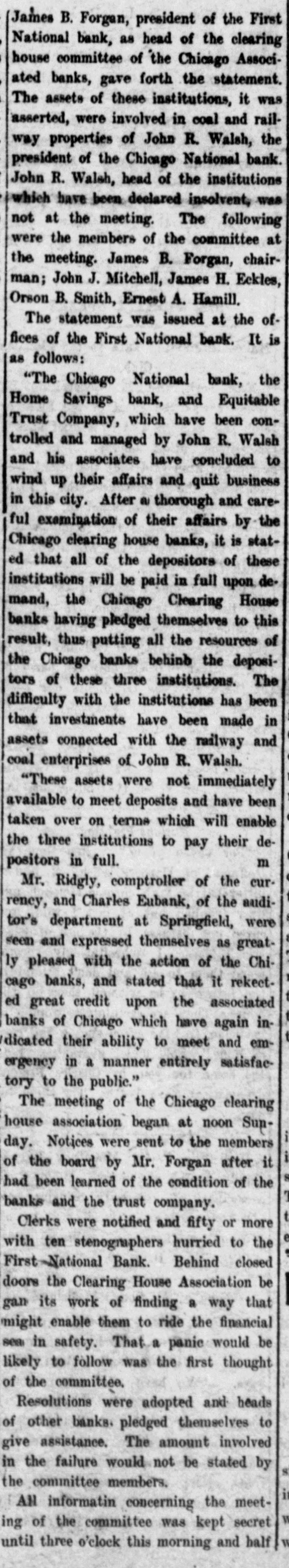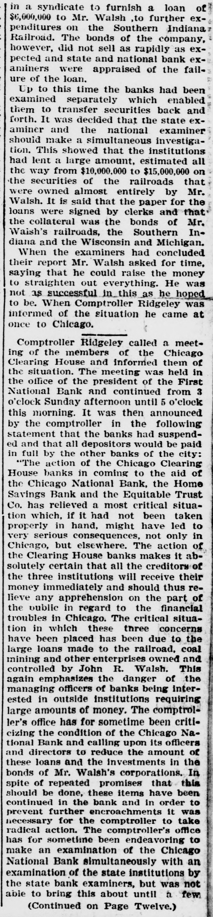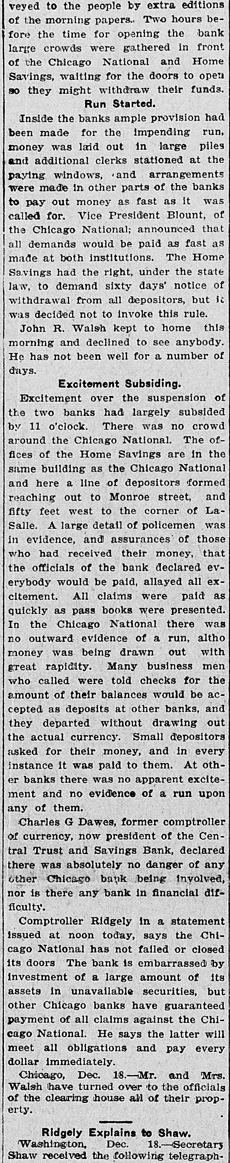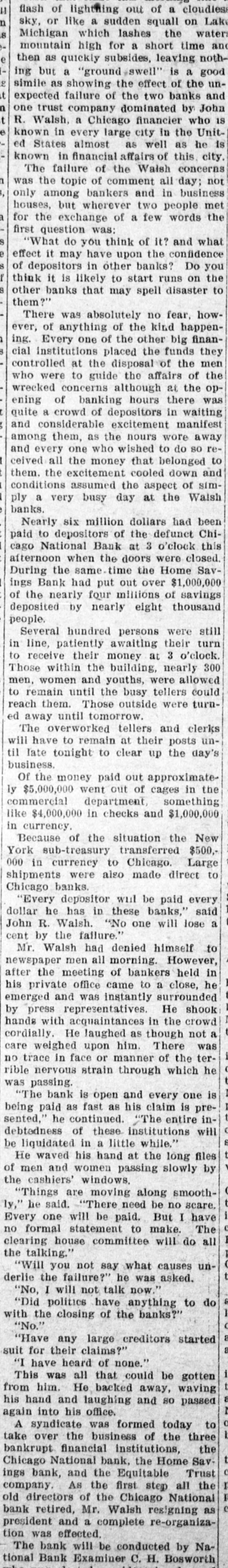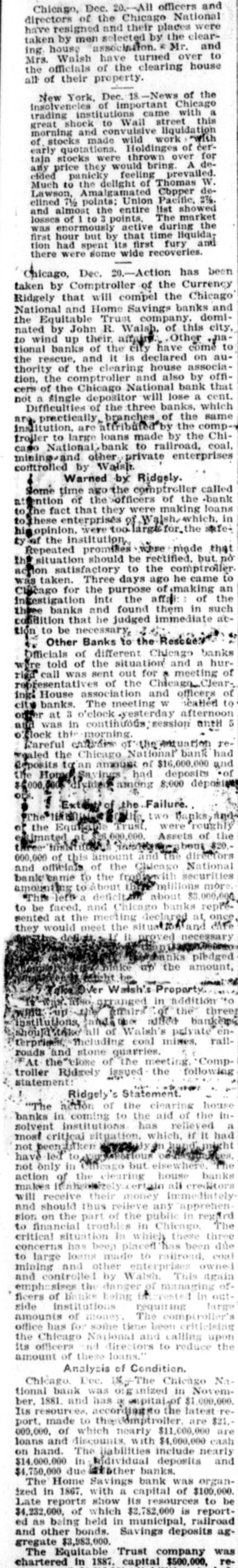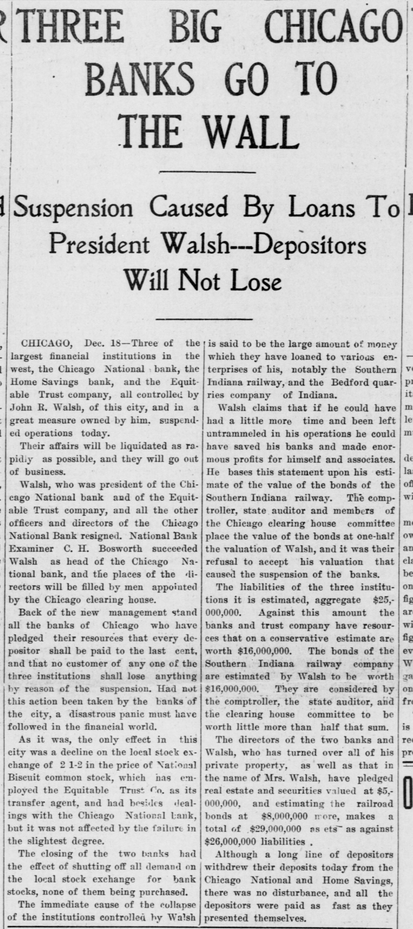 A BIG FINANCIAL CRASH IN CHICAGO Three Banking Institutions Go to Wall. DEPOSITORS WILL GET ALL John R. Walsh Interests Fail. Officials and Banks Make Up Deficiencies. has Chicago, Ill., Dec. 18.-Action been taken by Comptroller of the Currency William B. Ridgely, that will compel three large institutions-the Chicago National Bank, Home Savings Bank and Equitable Trust Companyof all dominated by John R. Walsh, this city, to wind up their affairs. The other national banks of the city have come to the rescue and it is declared on authority of the clearing house association, comptroller and also the officers of the Chicago National Bank, that not a single depositor will lose one cent. The difficulty of the three which are practically institution, is wrecks, of the same attributed branches by the comptroller of the currency to the large loans made by the Chicago National to railroad, mining and other by private enterprises controlled Walsh. Made Large Loans. Some time ago the comptroller called the attention of the officers of the banks to the fact that they were making loans to these enterprises of which in his too for the of the large Walsh, safety opinion institutions. made were promises were that should be no to the the Repeated action situation satisfactory relieved comptrol- but he ler taken. Three days ago to Chicago for the an into making came was investigation purpose and the found af of fairs of the three banks them in such condition that he judged immediate action was necessary. The officers of the different Chicago banks were told of the situation and a hur ried call was sent out for a meeting of the representatives of the Chicago Clearing House Association, as well as officers of the city banks. The meeting was called to order in the office of President Forgan of the First National Bank at three o'clock yesterday after noon and was continued until three o'clock this morning. The Liabilities. careful canvass of the situation that the Chicago revealed A $16,000,000, National had deposits amounting to the Home Savings Bank of $4,000,000, and that the liabilities of the two banks and of the Equitable Trust Comwere roughly estimated at $26, and the assets at 000,000 pany $20,000,000. of, half This deficit will be taken care by the officers of the Chicago National and half by the banks represented at the meeting. The enterprises which are generally credited with being the indirect cause of the financial troubles of Mr. Walsh of Bedford Quarries Company and the are Indiana the Southern constructed Indiana Railroad, which was by for the purpose of from his quarries to Walsh stone getting Chicago the market. the He was unable to get a entrance for his railroad and was the unsuccessful in his efforts to sell to Pennsylvania road. to these two he practically owns, which In addition enterprises, Akron Walsh Gas is heavy stockholder in the a Company of Akron, Ohio: the Illinois Rand, Southern Railway Company McNally & Company Southern IndiExpress, and half a score of gas, electric ana lighting and coal mining com panies. Public Surprised. To the public at large, which was of not acquainted with the magnitude the Walsh's enterprises, the news of banks difficulties surrounding his Two came as a tremendous surprise. hours before the time for opening the bank a large crowd gathered in Home front National and Bank. Inside the had been made Savings of provision the Chicago banks was for ample laid the run. The money in large piles and at the paying stationed out impending additional windows, parts clerks and of made in bank to pay the money as called for. The savings bank arrangements the other will fast notice not as its right of sixty days' will pay all deposits on failure of the Chicago but demand The demand. Bank National the Home Savings and Trust Company, at 3:30 this nounced the Bank, Equitable morning was by Clear the an of the Chicago House Association after a ing representatives hours. session lasting eighteen The excitement over the failure largely subsided by 11 o'clock. Th payment had of the depositors was mad with rapidity and the crowd around Chicago National Bank was n the larger than on an average business day. Walsh Acts Right. At noon it was announced that a