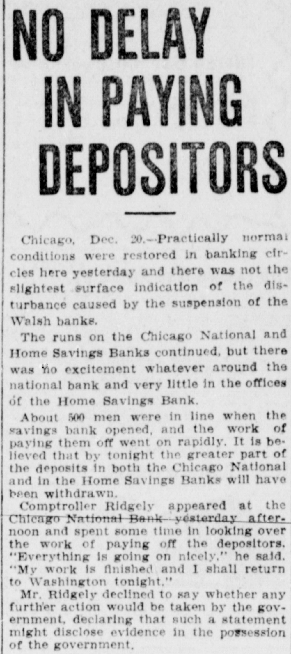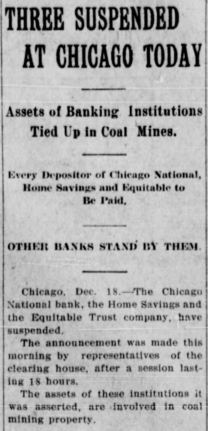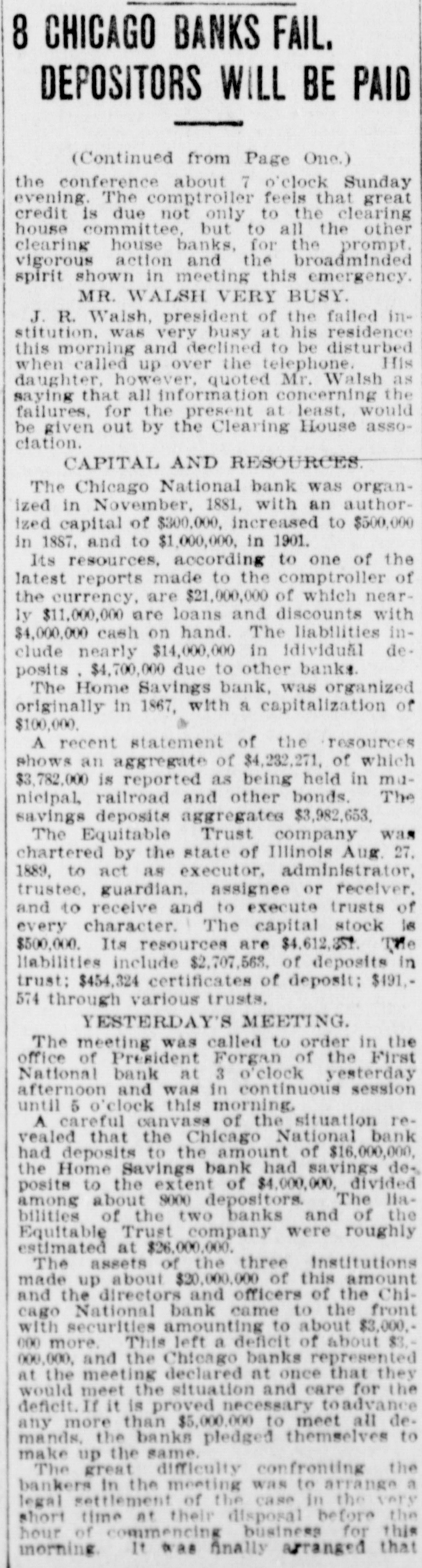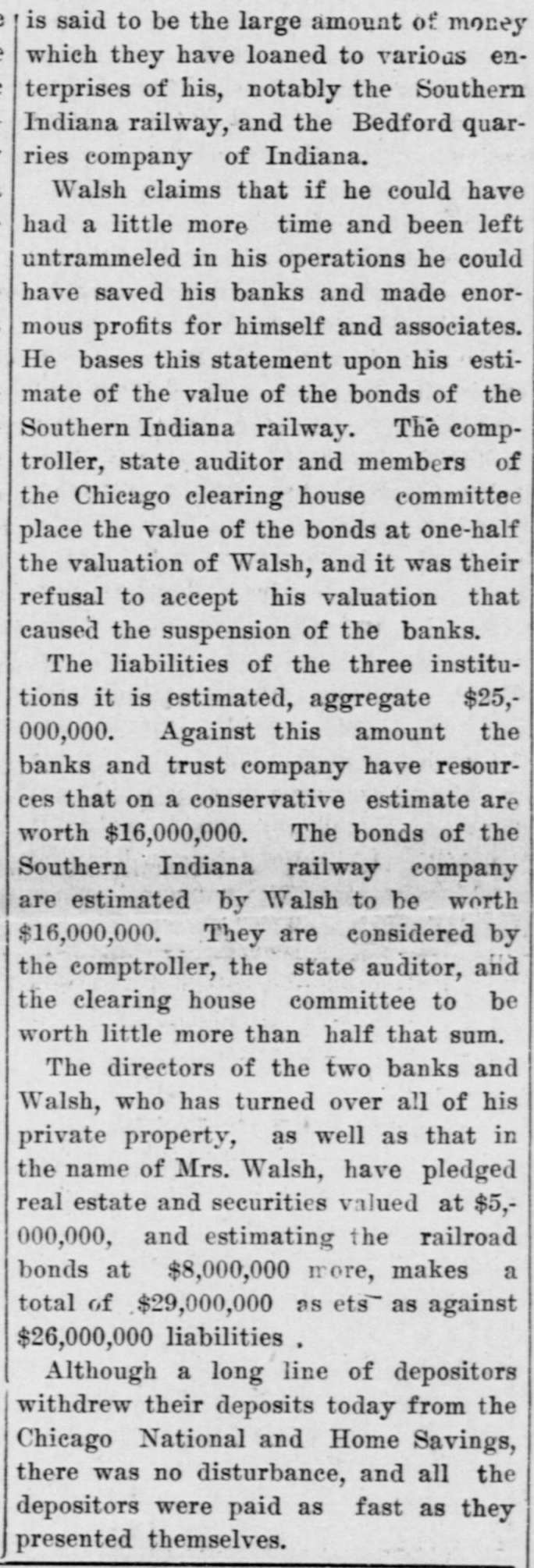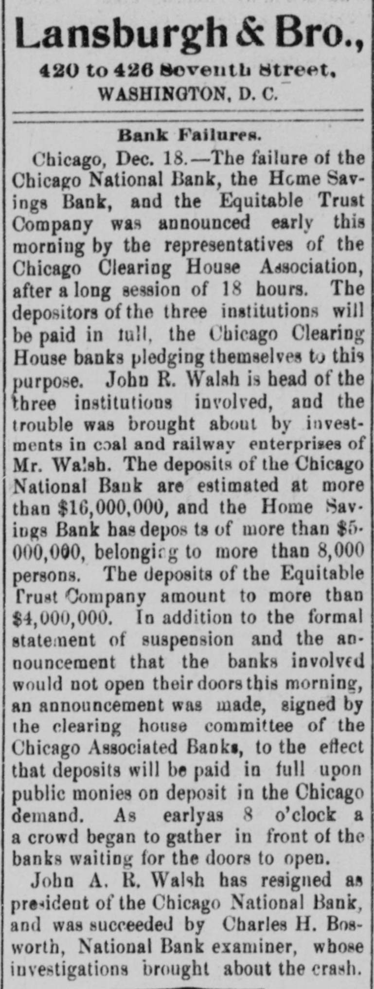 A BIG FINANCIAL CRASH IN CHICAGO Three Banking Institutions Go to Wall. DEPOSITORS WILL GET ALL John R. Walsh Interests Fail. Officials and Banks Make Up Deficiencies. has Chicago, Ill., Dec. 18.-Action been taken by Comptroller of the Currency William B. Ridgely, that will compel three large institutions-the Chicago National Bank, Home Savings Bank and Equitable Trust Companyof all dominated by John R. Walsh, this city, to wind up their affairs. The other national banks of the city have come to the rescue and it is declared on authority of the clearing house association, comptroller and also the officers of the Chicago National Bank, that not a single depositor will lose one cent. The difficulty of the three which are practically institution, is wrecks, of the same attributed branches by the comptroller of the currency to the large loans made by the Chicago National to railroad, mining and other by private enterprises controlled Walsh. Made Large Loans. Some time ago the comptroller called the attention of the officers of the banks to the fact that they were making loans to these enterprises of which in his too for the of the large Walsh, safety opinion institutions. made were promises were that should be no to the the Repeated action situation satisfactory relieved comptrol- but he ler taken. Three days ago to Chicago for the an into making came was investigation purpose and the found af of fairs of the three banks them in such condition that he judged immediate action was necessary. The officers of the different Chicago banks were told of the situation and a hur ried call was sent out for a meeting of the representatives of the Chicago Clearing House Association, as well as officers of the city banks. The meeting was called to order in the office of President Forgan of the First National Bank at three o'clock yesterday after noon and was continued until three o'clock this morning. The Liabilities. careful canvass of the situation that the Chicago revealed A $16,000,000, National had deposits amounting to the Home Savings Bank of $4,000,000, and that the liabilities of the two banks and of the Equitable Trust Comwere roughly estimated at $26, and the assets at 000,000 pany $20,000,000. of, half This deficit will be taken care by the officers of the Chicago National and half by the banks represented at the meeting. The enterprises which are generally credited with being the indirect cause of the financial troubles of Mr. Walsh of Bedford Quarries Company and the are Indiana the Southern constructed Indiana Railroad, which was by for the purpose of from his quarries to Walsh stone getting Chicago the market. the He was unable to get a entrance for his railroad and was the unsuccessful in his efforts to sell to Pennsylvania road. to these two he practically owns, which In addition enterprises, Akron Walsh Gas is heavy stockholder in the a Company of Akron, Ohio: the Illinois Rand, Southern Railway Company McNally & Company Southern IndiExpress, and half a score of gas, electric ana lighting and coal mining com panies. Public Surprised. To the public at large, which was of not acquainted with the magnitude the Walsh's enterprises, the news of banks difficulties surrounding his Two came as a tremendous surprise. hours before the time for opening the bank a large crowd gathered in Home front National and Bank. Inside the had been made Savings of provision the Chicago banks was for ample laid the run. The money in large piles and at the paying stationed out impending additional windows, parts clerks and of made in bank to pay the money as called for. The savings bank arrangements the other will fast notice not as its right of sixty days' will pay all deposits on failure of the Chicago but demand The demand. Bank National the Home Savings and Trust Company, at 3:30 this nounced the Bank, Equitable morning was by Clear the an of the Chicago House Association after a ing representatives hours. session lasting eighteen The excitement over the failure largely subsided by 11 o'clock. Th payment had of the depositors was mad with rapidity and the crowd around Chicago National Bank was n the larger than on an average business day. Walsh Acts Right. At noon it was announced that a