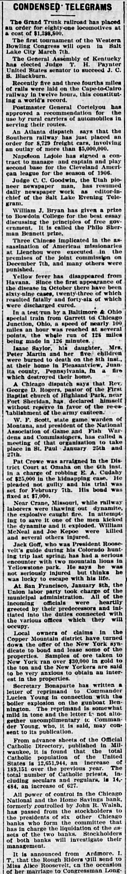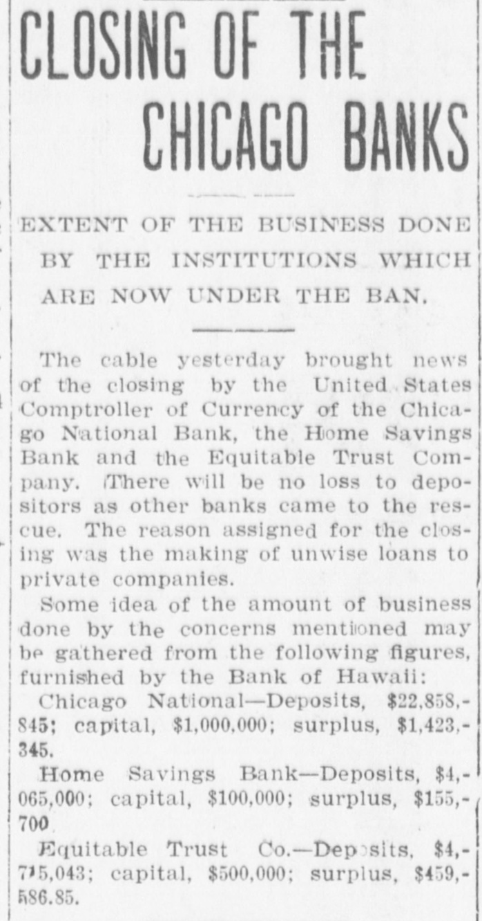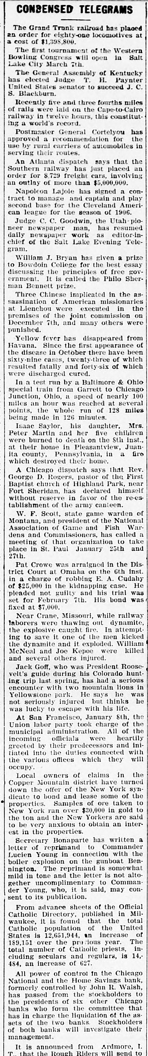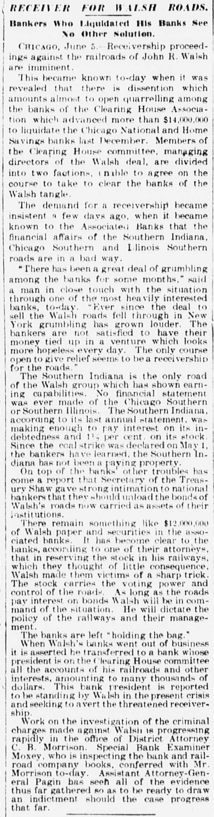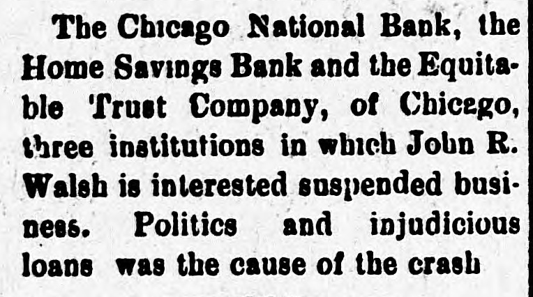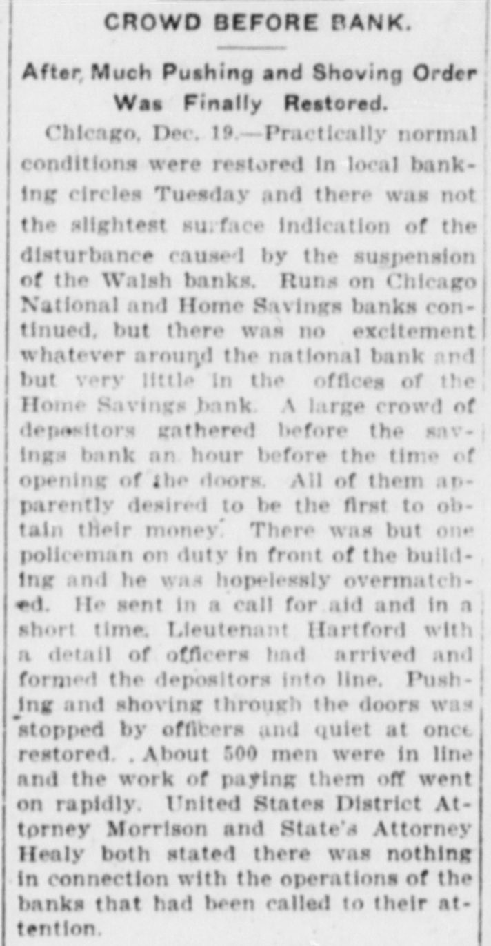 A BIG FINANCIAL CRASH IN CHICAGO Three Banking Institutions Go to Wall. DEPOSITORS WILL GET ALL John R. Walsh Interests Fail. Officials and Banks Make Up Deficiencies. has Chicago, Ill., Dec. 18.-Action been taken by Comptroller of the Currency William B. Ridgely, that will compel three large institutions-the Chicago National Bank, Home Savings Bank and Equitable Trust Companyof all dominated by John R. Walsh, this city, to wind up their affairs. The other national banks of the city have come to the rescue and it is declared on authority of the clearing house association, comptroller and also the officers of the Chicago National Bank, that not a single depositor will lose one cent. The difficulty of the three which are practically institution, is wrecks, of the same attributed branches by the comptroller of the currency to the large loans made by the Chicago National to railroad, mining and other by private enterprises controlled Walsh. Made Large Loans. Some time ago the comptroller called the attention of the officers of the banks to the fact that they were making loans to these enterprises of which in his too for the of the large Walsh, safety opinion institutions. made were promises were that should be no to the the Repeated action situation satisfactory relieved comptrol- but he ler taken. Three days ago to Chicago for the an into making came was investigation purpose and the found af of fairs of the three banks them in such condition that he judged immediate action was necessary. The officers of the different Chicago banks were told of the situation and a hur ried call was sent out for a meeting of the representatives of the Chicago Clearing House Association, as well as officers of the city banks. The meeting was called to order in the office of President Forgan of the First National Bank at three o'clock yesterday after noon and was continued until three o'clock this morning. The Liabilities. careful canvass of the situation that the Chicago revealed A $16,000,000, National had deposits amounting to the Home Savings Bank of $4,000,000, and that the liabilities of the two banks and of the Equitable Trust Comwere roughly estimated at $26, and the assets at 000,000 pany $20,000,000. of, half This deficit will be taken care by the officers of the Chicago National and half by the banks represented at the meeting. The enterprises which are generally credited with being the indirect cause of the financial troubles of Mr. Walsh of Bedford Quarries Company and the are Indiana the Southern constructed Indiana Railroad, which was by for the purpose of from his quarries to Walsh stone getting Chicago the market. the He was unable to get a entrance for his railroad and was the unsuccessful in his efforts to sell to Pennsylvania road. to these two he practically owns, which In addition enterprises, Akron Walsh Gas is heavy stockholder in the a Company of Akron, Ohio: the Illinois Rand, Southern Railway Company McNally & Company Southern IndiExpress, and half a score of gas, electric ana lighting and coal mining com panies. Public Surprised. To the public at large, which was of not acquainted with the magnitude the Walsh's enterprises, the news of banks difficulties surrounding his Two came as a tremendous surprise. hours before the time for opening the bank a large crowd gathered in Home front National and Bank. Inside the had been made Savings of provision the Chicago banks was for ample laid the run. The money in large piles and at the paying stationed out impending additional windows, parts clerks and of made in bank to pay the money as called for. The savings bank arrangements the other will fast notice not as its right of sixty days' will pay all deposits on failure of the Chicago but demand The demand. Bank National the Home Savings and Trust Company, at 3:30 this nounced the Bank, Equitable morning was by Clear the an of the Chicago House Association after a ing representatives hours. session lasting eighteen The excitement over the failure largely subsided by 11 o'clock. Th payment had of the depositors was mad with rapidity and the crowd around Chicago National Bank was n the larger than on an average business day. Walsh Acts Right. At noon it was announced that a