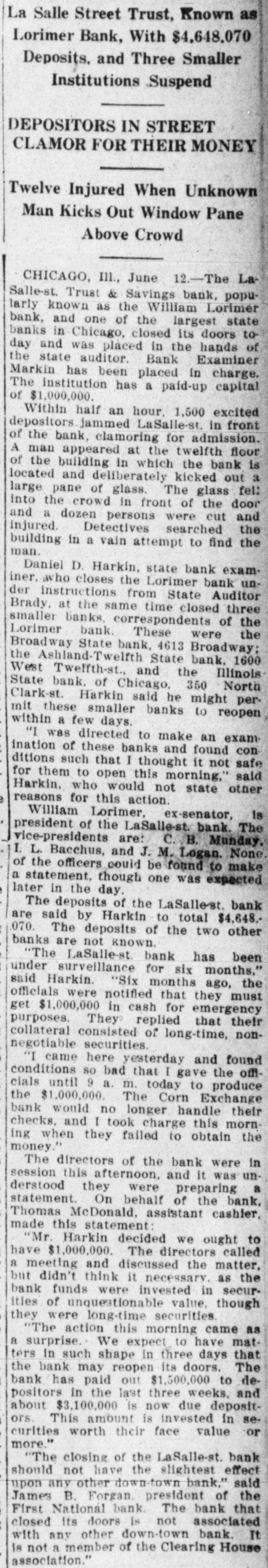 La Salle Street Trust, Known as Lorimer Bank, With $4,648,070 Deposits. and Three Smaller Institutions Suspend DEPOSITORS IN STREET CLAMOR FOR THEIR MONEY Twelve Injured When Unknown Man Kicks Out Window Pane Above Crowd CHICAGO, Ill., June 12.-The LaSalle-st. Trust & Savings bank, popularly known as the William Lorimer bank, and one of the largest state banks in Chicago, closed its doors to day and was placed in the hands of the state auditor. Bank Examiner Markin has been placed in charge. The institution has a paid-up capital of $1,000,000. Within half an hour. 1,500 excited depositors jammed LaSalle-st. in front of the bank, clamoring for admission. A man appeared at the twelfth floor of the building in which the bank is located and deliberately kicked out a large pane of glass. The glass fel: into the crowd in front of the door and a dozen persons were cut and injured. Detectives searched the building in a vain attempt to find the man. Daniel D. Harkin, state bank examiner, who closes the Lorimer bank under instructions from State Auditor Brady, at the same time closed three smaller banks. correspondents of the Lorimer bank. These were the Broadway State bank, 4613 Broadway: the Ashland-Twelfth State bank. 1600 West Twelfth-st., and the Illinois State bank. of Chicago, 350 North Clark-st. Harkin said he might permit these smaller banks to reopen within a few days. "I was directed to make an examination of these banks and found con ditions such that I thought it not safe for them to open this morning," said Harkin, who would not state other reasons for this action. William Lorimer, ex-senator, is president of the LaSalle-st. bank. The vice-presidents are: C. B. Munday. I. L. Bacchus, and J. M. Logan. None. of the officers could be found to make a statement, though one was expected later in the day. The deposits of the LaSalle-st. bank are said by Harkin to total $4,648.070. The deposits of the two other banks are not known. "The LaSalle-st. bank has been under surveillance for six months," said Harkin. "Six months ago, the officials were notified that they must get $1,000,000 in cash for emergency purposes. They replied that their collateral consisted of long-time, nonnegotiable securities. "I came here yesterday and found conditions so bad that I gave the offlcials until 9 a. m. today to produce the $1,000,000. The Corn Exchange bank would no longer handle their checks, and I took charge this morning when they failed to obtain the money." The directors of the bank were in session this afternoon, and it was una derstood they were preparing statement. On behalf of the bank. Thomas McDonald, assistant cashier. made this statement: 'Mr. Harkin decided we ought to have $1,000,000. The directors called a meeting and discussed the matter, but didn't think it necessary. as the bank funds were invested in securities of unquestionable value. though they were long-time securities. 'The action this morning came as a surprise. We expect to have matters in such shape in three days that the The out bank bank has may paid reopen three $1,500,000 its doors. weeks. to and depositors in the last is now is seabout ors. This $3,100,000 amount invested due deposit- in curities worth their face value or more." "The closing of the LaSalle-st. bank should not have the slightest effect upon any other down-town bank," said James B. Forgan president of the First National bank The bank that closed its doors is not associated with any other down-town bank. It is not a member of the Clearing House association."