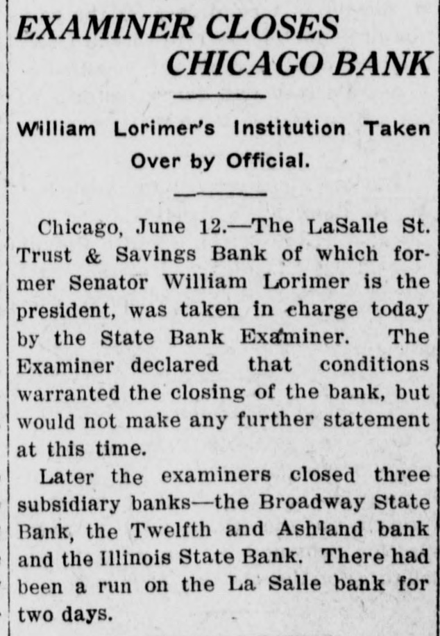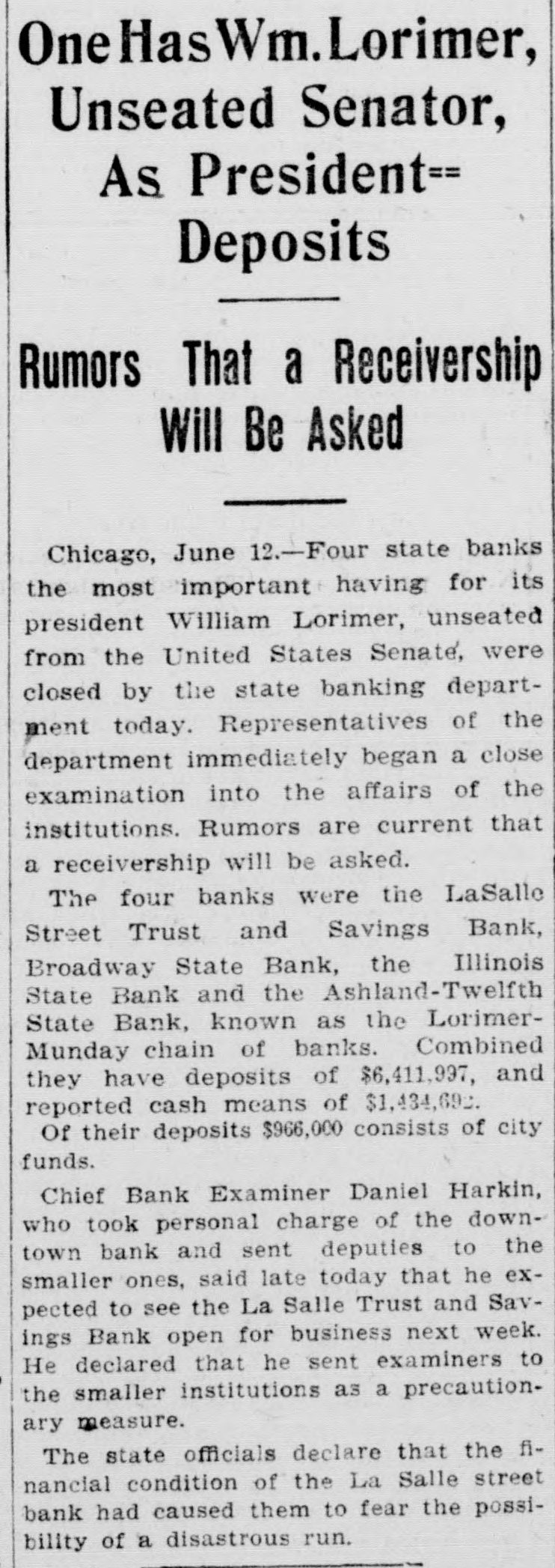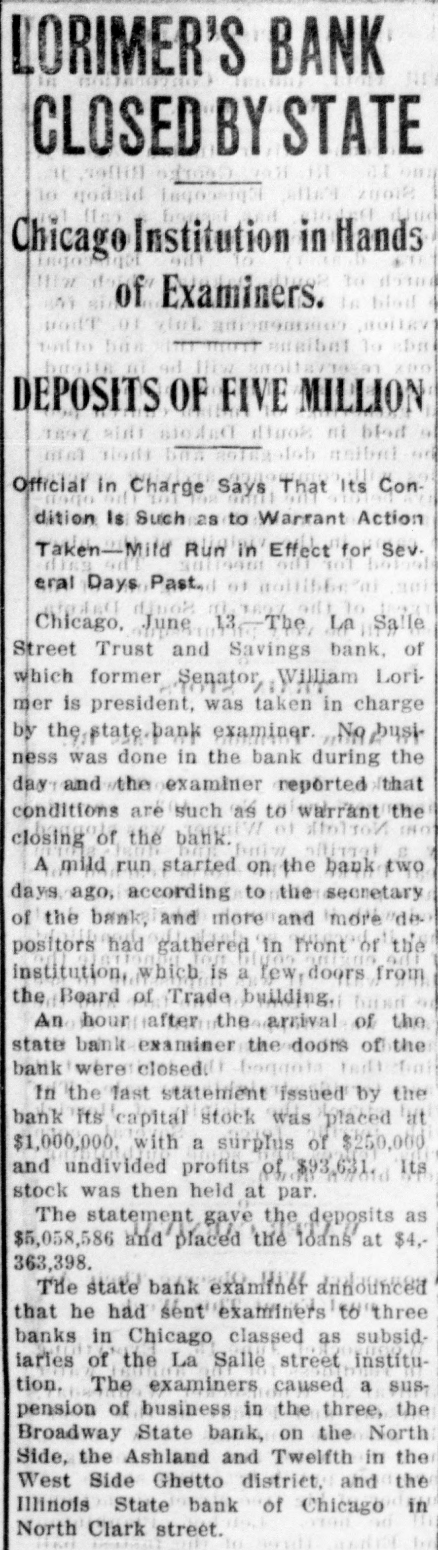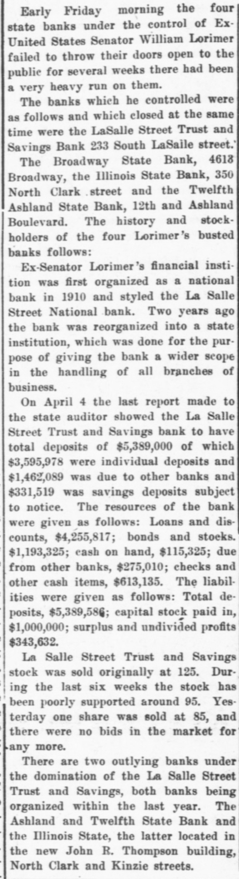 Early Friday morning the four state banks under the control of ExUnited States Senator William Lorimer failed to throw their doors open to the public for several weeks there had been a very heavy run on them. The banks which he controlled were as follows and which closed at the same time were the LaSalle Street Trust and Savings Bank 233 South LaSaile street. The Broadway State Bank, 4618 Broadway, the Illinois State Bank, 350 North Clark street and the Twelfth Ashland State Bank, 12th and Ashland Boulevard. The history and stockholders of the four Lorimer's busted banks follows: Ex-Senator Lorimer's financial instition was first organized as a national bank in 1910 and styled the La Salle Street National bank. Two years ago the bank was reorganized into a state institution, which was done for the purpose of giving the bank a wider scope in the handling of all branches of business. On April 4 the last report made to the state auditor showed the La Salle Street Trust and Savings bank to have total deposits of $5,389,000 of which $3,595,978 were individual deposits and $1,462,089 was due to other banks and $331,519 was savings deposits subject to notice. The resources of the bank were given as follows: Loans and discounts, $4,255,817; bonds and stocks. $1,193,325; cash on hand, $115,325; due from other banks, $275,010; checks and other cash items, $613,135. The liabilities were given as follows: Total deposits, $5,389,586; capital stock paid in, $1,000,000; surplus and undivided profits $343,632. La Salle Street Trust and Savings stock was sold originally at 125. During the last six weeks the stock has been poorly supported around 95. Yesterday one share was sold at 85, and there were no bids in the market for any more. There are two outlying banks under the domination of the La Salle Street Trust and Savings, both banks being organized within the last year. The Ashland and Twelfth State Bank and the Illinois State, the latter located in the new John R. Thompson building, North Clark and Kinzie streets.