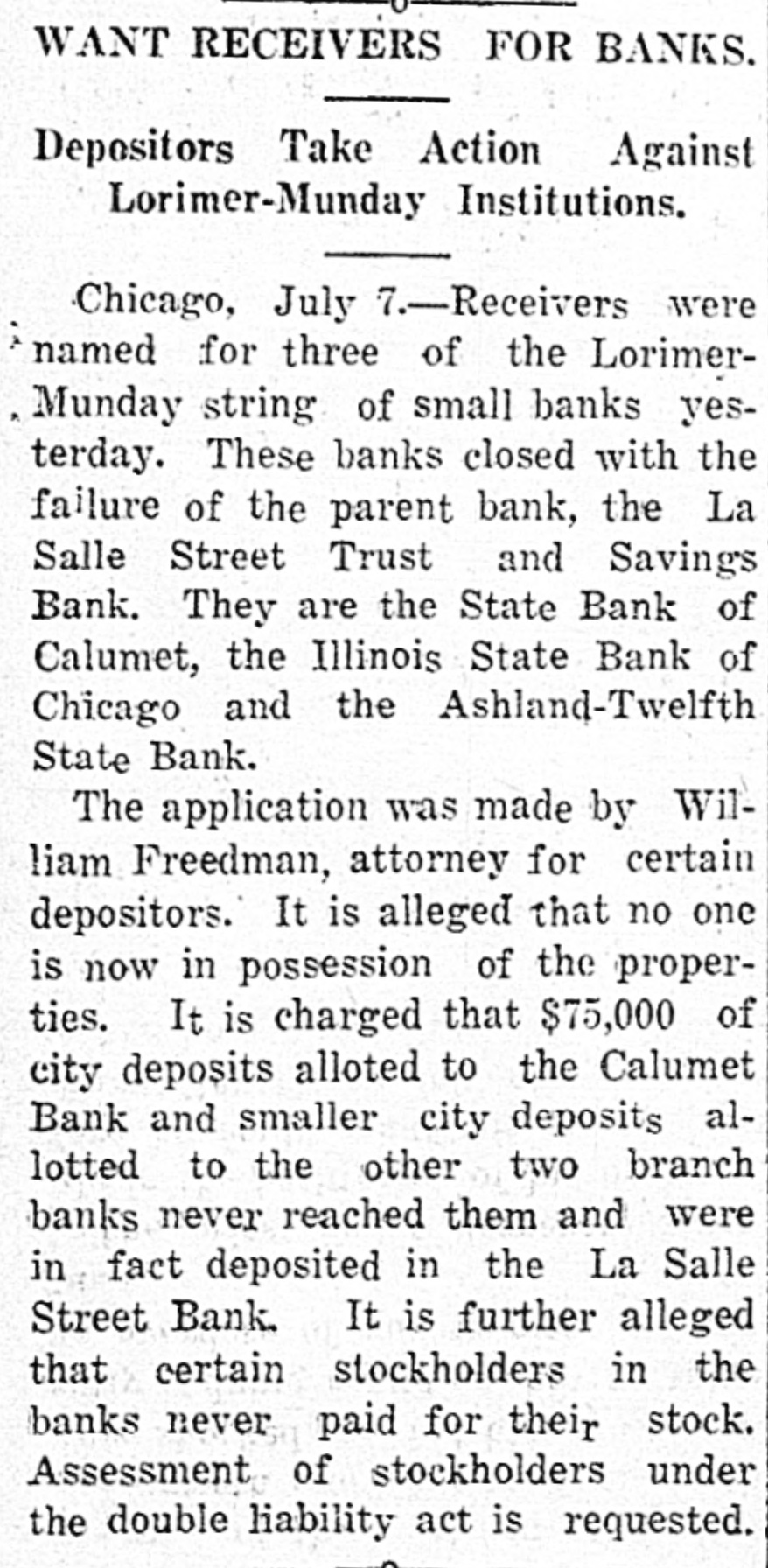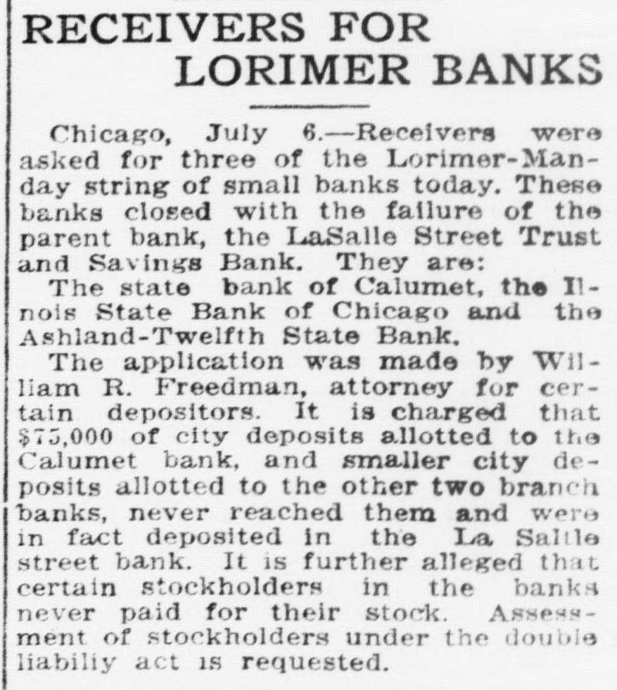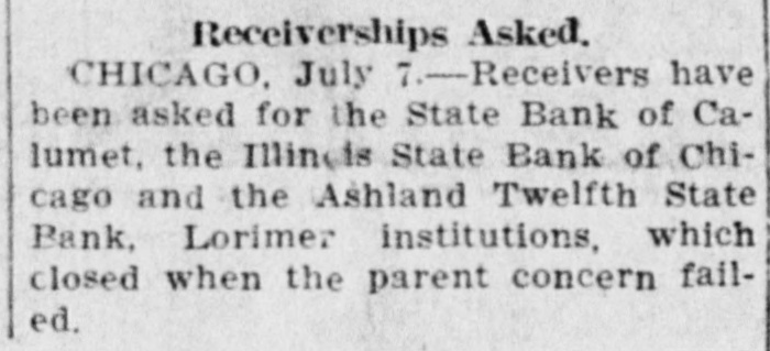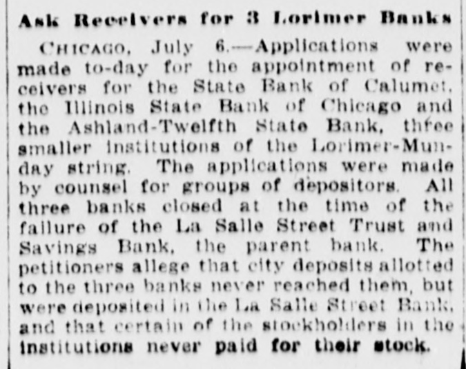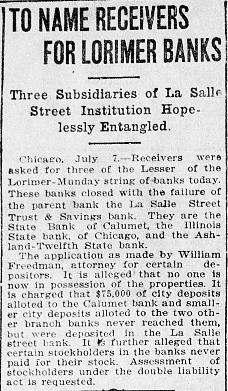 Early Friday morning the four state banks under the control of ExUnited States Senator William Lorimer failed to throw their doors open to the public for several weeks there had been a very heavy run on them. The banks which he controlled were as follows and which closed at the same time were the LaSalle Street Trust and Savings Bank 233 South LaSaile street. The Broadway State Bank, 4618 Broadway, the Illinois State Bank, 350 North Clark street and the Twelfth Ashland State Bank, 12th and Ashland Boulevard. The history and stockholders of the four Lorimer's busted banks follows: Ex-Senator Lorimer's financial instition was first organized as a national bank in 1910 and styled the La Salle Street National bank. Two years ago the bank was reorganized into a state institution, which was done for the purpose of giving the bank a wider scope in the handling of all branches of business. On April 4 the last report made to the state auditor showed the La Salle Street Trust and Savings bank to have total deposits of $5,389,000 of which $3,595,978 were individual deposits and $1,462,089 was due to other banks and $331,519 was savings deposits subject to notice. The resources of the bank were given as follows: Loans and discounts, $4,255,817; bonds and stocks. $1,193,325; cash on hand, $115,325; due from other banks, $275,010; checks and other cash items, $613,135. The liabilities were given as follows: Total deposits, $5,389,586; capital stock paid in, $1,000,000; surplus and undivided profits $343,632. La Salle Street Trust and Savings stock was sold originally at 125. During the last six weeks the stock has been poorly supported around 95. Yesterday one share was sold at 85, and there were no bids in the market for any more. There are two outlying banks under the domination of the La Salle Street Trust and Savings, both banks being organized within the last year. The Ashland and Twelfth State Bank and the Illinois State, the latter located in the new John R. Thompson building, North Clark and Kinzie streets.