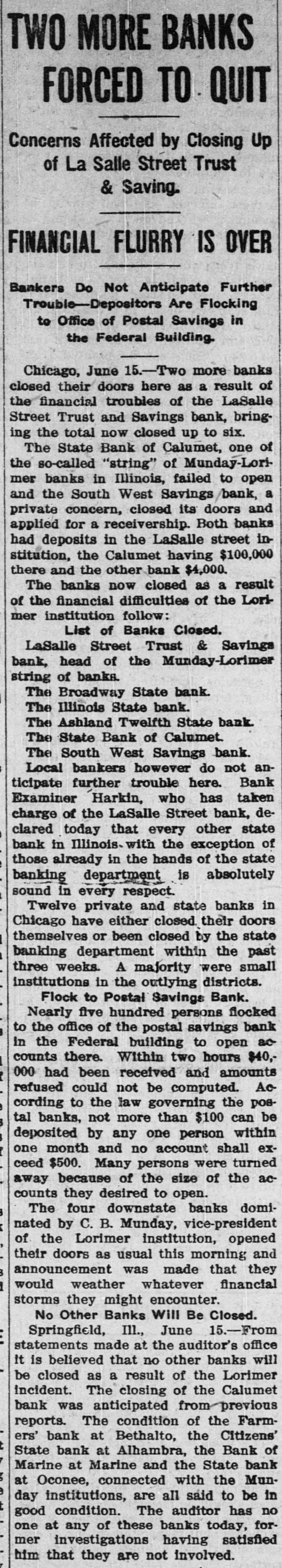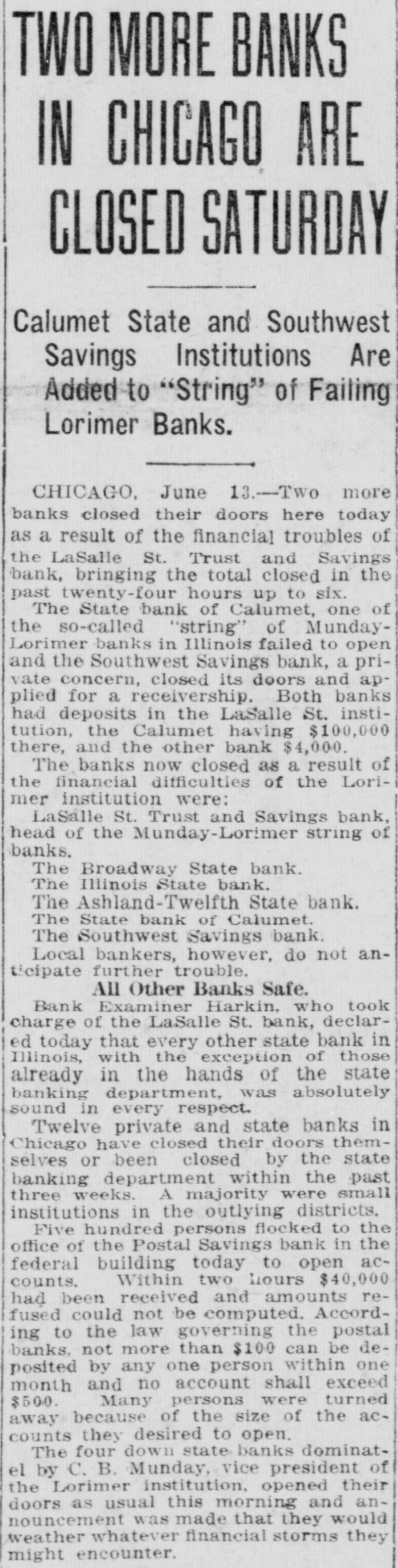 TWO MORE BANKS IN CHICAGO ARE CLOSED SATURDAY Calumet State and Southwest Savings Institutions Are Added to "String" of Failing Lorimer Banks. CHICAGO, June 13.-Two more banks closed their doors here today as a result of the financial troubles of the LaSalle St. Trust and Savings bank, bringing the total closed in the past twenty-four hours up to six. The State bank of Calumet, one of the so-called "string" of MundayLorimer banks in Illinois failed to open and the Southwest Savings bank, a private concern, closed its doors and applied for a receivership. Both banks had deposits in the LaSalle St. institution, the Calumet having $100,000 there, and the other bank $4,000. The banks now closed as a result of the financial difficulties of the Lorimer institution were: LaSalle St. Trust and Savings bank, head of the Munday-Lorimer string of banks. The Broadway State bank. The Illinois State bank. The Ashland-Twelfth State bank. The State bank of Calumet. The Southwest Savings bank. Local bankers, however, do not anticipate further trouble. All Other Banks Safe. Bank Examiner Harkin, who took charge of the LaSalle St. bank, declared today that every other state bank in Illinois, with the exception of those already in the hands of the state banking department, was absolutely sound in every respect. Twelve private and state banks in Chicago have closed their doors themselves or been closed by the state banking department within the past three weeks. A majority were small institutions in the outlying districts. Five hundred persons flocked to the office of the Postal Savings bank in the federal building today to open accounts. Within two hours $40,000 had been received and amounts refused could not be computed. According to the law governing the postal banks. not more than $100 can be deposited by any one person within one month and no account shall exceed $500. Many persons were turned away because of the size of the accounts they desired to open. The four down state banks dominatel by C. B. Munday, vice president of the Lorimer institution, opened their doors as usual this morning and announcement was made that they would weather whatever financial storms they might encounter.