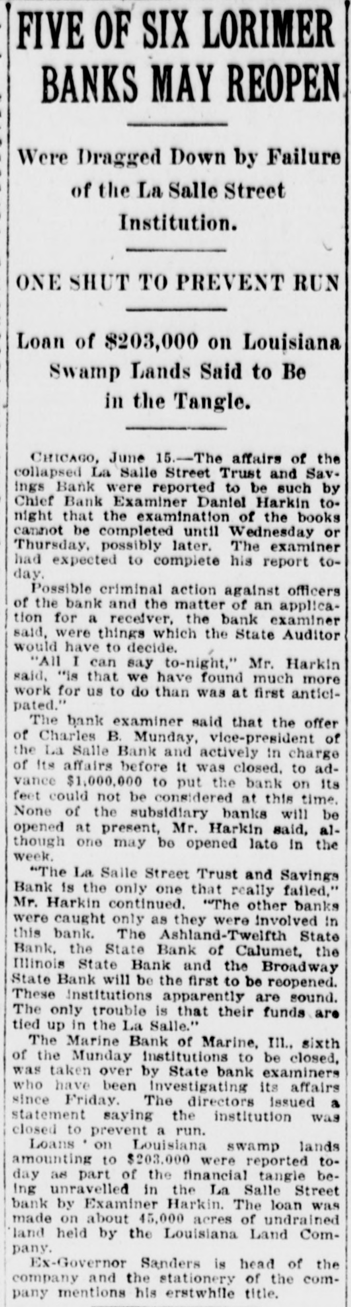 FIVE OF SIX LORIMER BANKS MAY REOPEN Were Dragged Down by Failure of the La Salle Street Institution. ONE SHUT TO PREVENT RUN Loan of $203,000 on Louisiana Swamp Lands Said to Be in the Tangle. CHICAGO, June 15.-The affairs of the collapsed La Salle Street Trust and Savings Bank were reported to be such by Chief Bank Examiner Daniel Harkin tonight that the examination of the books cannot be completed until Wednesday or Thursday, possibly later. The examiner had expected to complete his report today. Possible criminal action against officers of the bank and the matter of an application for a receiver, the bank examiner said, were things which the State Auditor would have to decide. "All I can say to-night," Mr. Harkin said, "is that we have found much more work for us to do than was at first anticlpated." The bank examiner said that the offer of Charles B. Munday, vice-president of the La Salle Bank and actively in charge of Its affairs before It was closed, to advance $1,000,000 to put the bank on its feet could not be considered at this time. None of the subsidiary banks will be opened at present, Mr. Harkin said, although one may be opened late in the week. "The La Salle Street Trust and Savings Bank is the only one that really failed," Mr. Harkin continued. "The other banks were caught only as they were involved in this bank. The Ashland-Twelfth State Bank, the State Bank of Calumet, the Illinois State Bank and the Broadway State Bank will be the first to be reopened. These Institutions apparently are sound. The only trouble is that their funds are tied up in the La Salle." The Marine Bank of Marine, III., sixth of the Munday institutions to be closed, was taken over by State bank examiners who have been Investigating its affairs since Friday. The directors issued a statement saying the institution was closed to prevent a run. Loans on Louisiana swamp lands amounting to $203,000 were reported today as part of the financial tangle beIng unravelled in the La Salle Street bank by Examiner Harkin. The loan was made on about 45,000 acres of undrained land held by the Louisiana Land Company. Ex-Governor Sanders is head of the company and the stationery of the company mentions his erstwhile title.