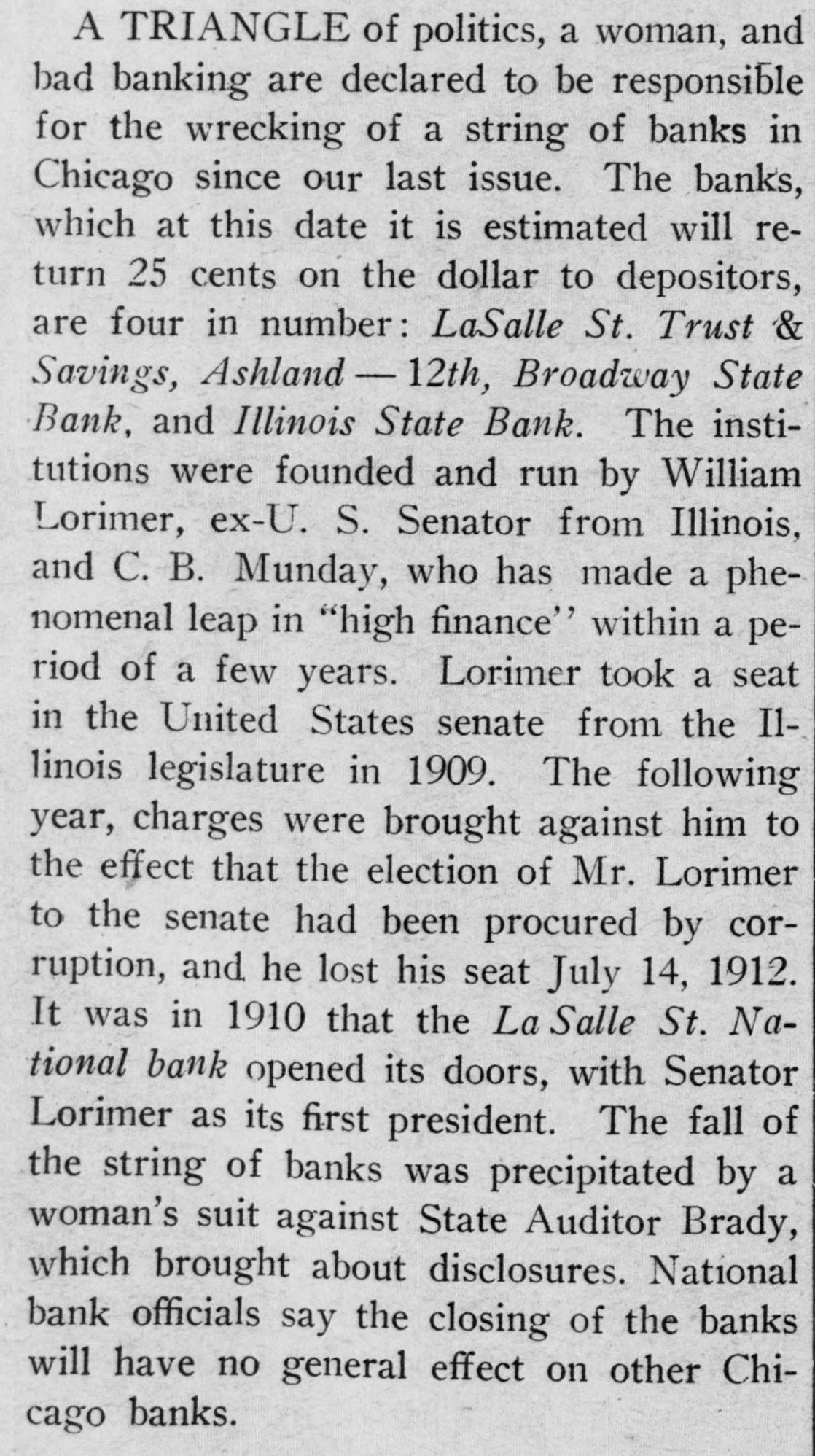 A TRIANGLE of politics, a woman, and bad banking are declared to be responsible for the wrecking of a string of banks in Chicago since our last issue. The banks, which at this date it is estimated will return 25 cents on the dollar to depositors, are four in number: LaSalle St. Trust & Savings, Ashland - 12th, Broadway State Bank, and Illinois State Bank. The institutions were founded and run by William Lorimer, ex-U. S. Senator from Illinois, and C. B. Munday, who has made a phenomenal leap in "high finance" within a period of a few years. Lorimer took a seat in the United States senate from the I1linois legislature in 1909. The following year, charges were brought against him to the effect that the election of Mr. Lorimer to the senate had been procured by corruption, and he lost his seat July 14, 1912. It was in 1910 that the La Salle St. National bank opened its doors, with Senator Lorimer as its first president. The fall of the string of banks was precipitated by a woman's suit against State Auditor Brady, which brought about disclosures. National bank officials say the closing of the banks will have no general effect on other Chicago banks.