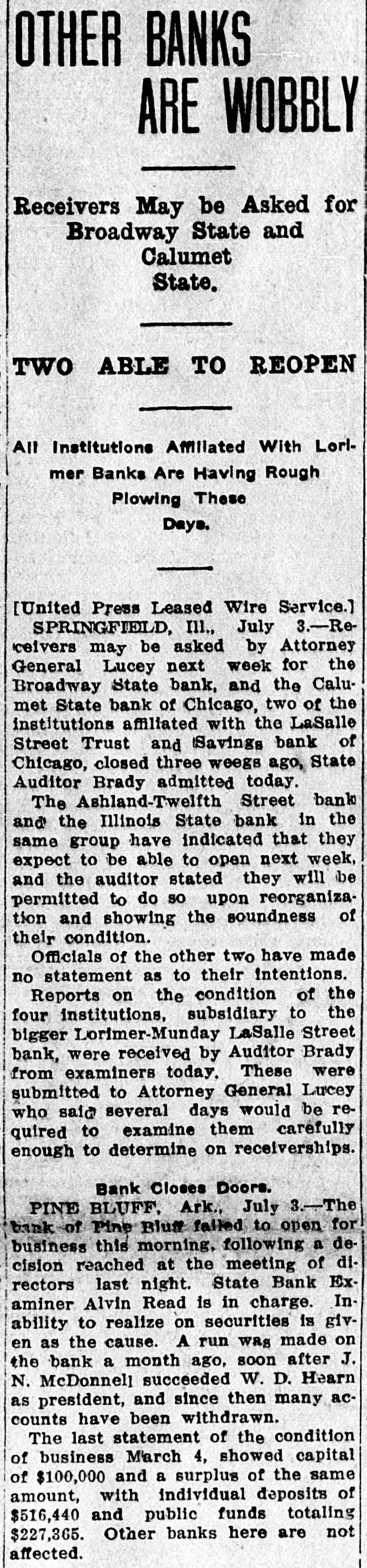 OTHER BANKS ARE WOBBLY Receivers May be Asked for Broadway State and Calumet State. TWO ABLE TO REOPEN All Institutions Affiliated With Lorimer Banks Are Having Rough Plowing These Days. [United Press Leased Wire Service.) SPRINGFIELD, III., July 3.-Receivers may be asked by Attorney General Lucey next week for the Broadway State bank, and the Calumet State bank of Chicago, two of the institutions affiliated with the LaSalle Street Trust and Savings bank of Chicago, closed three weegs ago, State Auditor Brady admitted today. The Ashland-Twelfth Street bank and the Illinois State bank in the same group have indicated that they expect to be able to open next week, and the auditor stated they will be permitted to do so upon reorganization and showing the soundness of their condition. Officials of the other two have made no statement as to their intentions. Reports on the condition of the four institutions, subsidiary to the bigger Lorimer-Munday LaSalle Street bank, were received by Auditor Brady from examiners today. These were submitted to Attorney General Lucey who said several days would be required to examine them carefully enough to determine on receiverships. Bank Closes Doors. PINE BLUFF, Ark., July 3.-The bank of Pine Bluff failed to open for business this morning, following a decision reached at the meeting of directors last night. State Bank Examiner Alvin Read is in charge. Inability to realize on securities is given as the cause. A run WAS made on the bank a month ago, soon after J. N. McDonnell succeeded W. D. Hearn as president, and since then many accounts have been withdrawn. The last statement of the condition of business March 4, showed capital of $100,000 and a surplus of the same amount, with individual deposits of $516,440 and public funds totaling $227,365. Other banks here are not affected.
