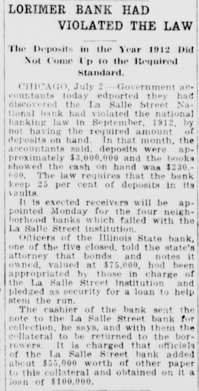 LORIMER BANK HAD VIOLATED THE LAW The Deposits in the Year 1912 Did Not Come Up to the Required Standard. CHICAGO, July 2 Government accountants today edported they had discovered the La Salle Street National bank had violated the national banking law in September, 1912, by not having the required amount of deposits on hand. In that month, the accountants said. deposits were approximately $3,000,000 and the books showed the cash on hand was $230.000. The law requires that the bank keep 25 per cent of deposits in its vaults. It is exected receivers will be appointed Monday for the four neighborhood banks which falled with the La Salle Street institution. Officers of the Illinois State bank, one of the five closed, told the state's attorney that bonds and notes it owned, valued at $75,000. hod been appropriated by those in charge of the La Salle Street institution and pledged as security for a loan to help stem the run. The cashier of the bank sent the note to the La Salle Street bank for collection, he says, and with them the collateral to be returned to the borrowers. It is charged that officials of the La Salle Street bank added about $55,000 worth of other paper to this collateral and obtained on it a loan of $100,000.