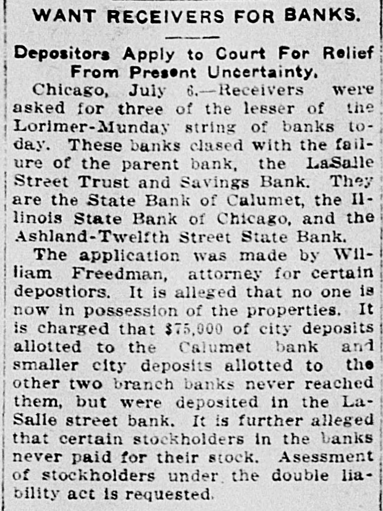 WANT RECEIVERS FOR BANKS. Depositors Take Action Against Lorimer-Munday Institutions. Chicago, July 7.-Receivers were named for three of the LorimerMunday string of small banks yesterday. These banks closed with the failure of the parent bank, the La Salle Street Trust and Savings Bank. They are the State Bank of Calumet, the Illinois State Bank of Chicago and the Ashland-Twelfth State Bank. The application was made by William Freedman, attorney for certain depositors. It is alleged that no one is now in possession of the properties. It is charged that $75,000 of city deposits alloted to the Calumet Bank and smaller city deposits allotted to the other two branch banks never reached them and were in fact deposited in the La Salle Street Bank. It is further alleged that certain stockholders in the banks never paid for their stock. Assessment of stockholders under the double liability act is requested.