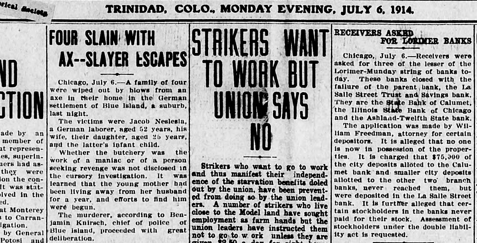 rical TRINIDAD, COLO., MONDAY EVENING, JULY 6. 1914. RECEIVERS ASKED FOR LORIMER BANKS FOUR SLAIN WITH STRIKERS WANT Chicago, July 6.-Receivers were asked for three of the lesser of the AX--SLAYER ESCAPES Lorimer-Munday string of banks today. These banks closed with the Chicago, July 6.-A family of four ND TO WORK BUT failure of the parent bank, the La were wiped out by blows from an Salle Street Trust and Savings bank. axe in their home in the German They are the State Bank of Calumet, settlement of Blue Island, a suburb, the Illinois State Bank of Chicago last night. SAYS CTION UNION and the Ashland-Twelfth State bank. The victims were Jacob Neslesia, The application was made by Wila German laborer, aged 52 years, his ade by an liam Freedman, attorney for certain wife, their daughter, aged 25 years, member of depositors. It is alleged that no one and the latter's infant child. NO at represenis now in possession of the properWhether the butchery was the les, superinties. It is charged that $75,000 of work of a maniac or of a person ners had asthe city deposits alloted to the CaluStrikers who want to go to work seeking revenge was not disclosed in they were met bank and smaller city deposits and thus manifest their independthe cursory investigation. It was on the conallotted to the other two branch ence of the starvation benefits doled learned that the young mother had It was statbanks, never reached them, but out by the union, have been preventbeen living away from her husband lved in the were deposited in the La Salle Street ed from doing so by the union leadfor a year, and efforts to find him ed. bank. It is further alleged that cerers. A number of strikers who live were begun. at Monterey tain stockholders in the banks never close to the Model land have sought The murderer, according to Ben, to Carranpaid for their stock. Assessment of employment as farm hands but the jamin Knirsch, chief of police of igation. stockholders under the double liabilunion leaders have instructed them Blue Island, proceeded with great by General ity act is requested. not to go to W ork unless they are deliberation. given $0.50 e des for niche Potosi and