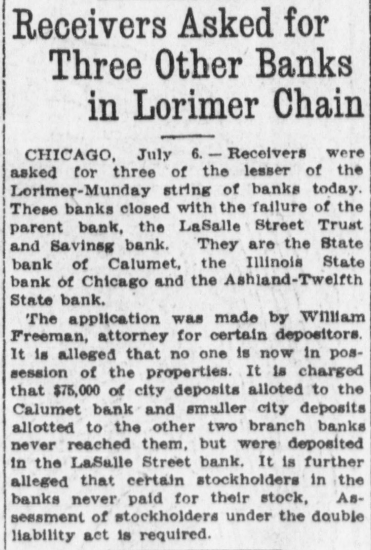 Receivers Asked for Three Other Banks in Lorimer Chain CHICAGO, July 6. Receivers were asked for three of the lesser of the Lorimer-Munday string of banks today. These banks closed with the failure of the parent bank, the LaSalle Street Trust and Savinsg bank. They are the State bank of Calumet, the Illinois State bank of Chicago and the Ashland-Twelfth State bank. The application was made by William Freeman, attorney for certain depositors. It is alleged that no one is now in possession of the properties. It is charged that $75,000 of city deposits alloted to the Calumet bank and smaller city deposits allotted to the other two branch banks never reached them, but were deposited in the LaSalle Street bank. It is further alleged that certain stockholders in the banks never paid for their stock, Assessment of stockholders under the double liability act is required.