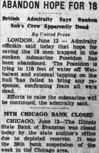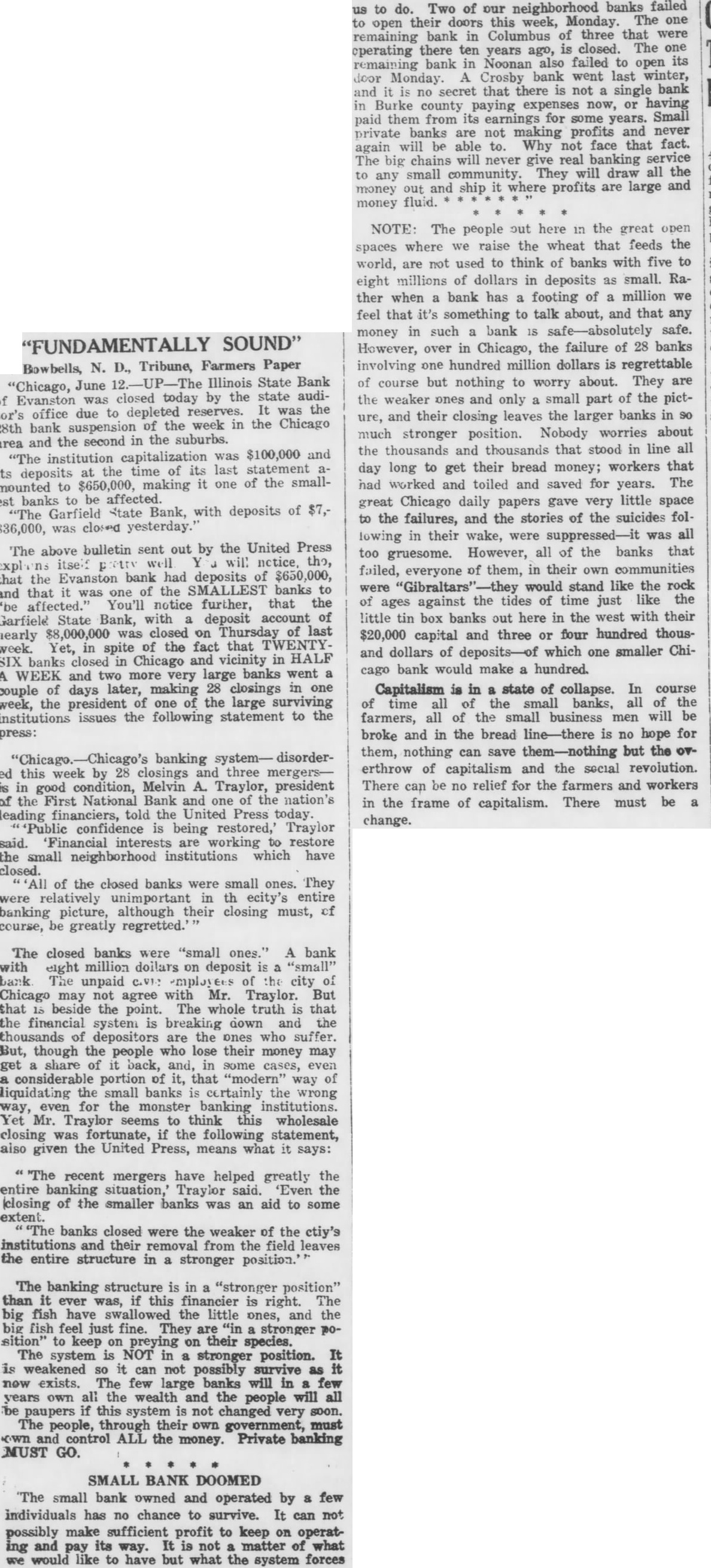 NOTE: The people here the great open spaces where we raise the wheat that feeds the world, are used to think of banks with five to eight millions of dollars in deposits small. Rather when bank has footing of million we feel that it's something to talk about, and that any money in such bank safe-absolutely safe. However, over in Chicago, the failure of 28 banks involving hundred million dollars is regrettable of course but nothing to worry about. They are the weaker ones only small part of the picture, their closing leaves the larger banks in SO much stronger position. Nobody worries about the thousands and thousands that stood in line all long to their bread workers that day get money; had worked toiled and saved for years. The great Chicago daily papers gave very little space to the failures, and the stories of the suicides following in their wake, were was all too gruesome. However, all of the banks that failed, everyone of them, in their own communities were "Gibraltars" would stand like the rock of ages against the tides of time just like the little tin box banks out here in the west with their $20,000 capital and three or four hundred thousand dollars of deposits-of which one smaller Chicago bank would make hundred.