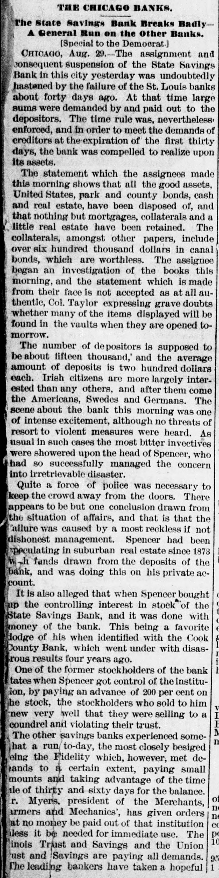 THE CHICAGO BANKS. The State Savings Bank Breaks BadlyA General Run on the Other Banks. [Special to the Democrat.] CHICAGO, Aug. 29.-The assignment and consequent suspension of the State Savings Bank in this city yesterday was undoubtedly hastened by the failure of the St. Louis banks about forty days ago. At that time large sums were demanded by and paid out to the depositors. The time rule was, nevertheless, enforced, and in order to meet the demands of creditors at the expiration of the first thirty days, the bank was compelled to realize upon its assets. The statement which the assignees made this morning shows that all the good assets, United States, park and county bonds, cash and real estate, have been disposed of, and that nothing but mortgages, collaterals and a little real estate have been retained. The collaterals, amongst other papers, include over six hundred thousand dollars in canal bonds, which are worthless. The assignee began an investigation of the books this morning, and the statement which is made from their face is not accepted as at all authentic, Col. Taylor expressing grave doubts whether many of the items displayed will be found in the vaults when they are opened tomorrow. The number of depositors is supposed to be about fifteen thousand,' and the average amount of deposits is two hundred dollars each. Irish citizens are more largely interested than any others, and after them come the Americans, Swedes and Germans. The scene about the bank this morning was one of intense excitement, although no threats of resort to violent measures were heard. As usual in such cases the most bitter invectives were showered upon the head of Spencer, who had so successfully managed the concern into irretrievable disaster. Quite a force of police was necessary to keep the crowd away from the doors. There appears to be but one conclusion drawn from the situation of affairs, and that is that the failure was caused by a most reckless if not dishonest management. Spencer had been peculating in suburban real estate since 1873 h fands drawn from the deposits of the bank, and was doing this on his private account. It is also alleged that when Spencer bought up the controlling interest in stock of the State Savings Bank, and it was done with money of the bank. This being a favorite dodge of his when identified with the Cook County Bank, which went under with disasrous results four years ago. One of the former stockholders of the bank tates when Spencer got control of the instituion, by paying an advance of 200 per cent on he stock, the stockholders who sold to him new very well that they were selling to a coundrel and violating their trust. The other savings banks experienced somehat a run to-day, the most closely besiged eing the Fidelity which, however, met dehands to a certain extent, paying small mounts and taking advantage of the time tle of thirty and sixty days for the balance. of r. Myers, president of the Merchants, armers and Mechanics', has given orders né at no money be paid out of that institution cc pe less it be needed for immediate use. The 10 inois Triast and Savings and the Union ust and Savings are paying all demands. 95 1 The leading bankers have taken a hopeful