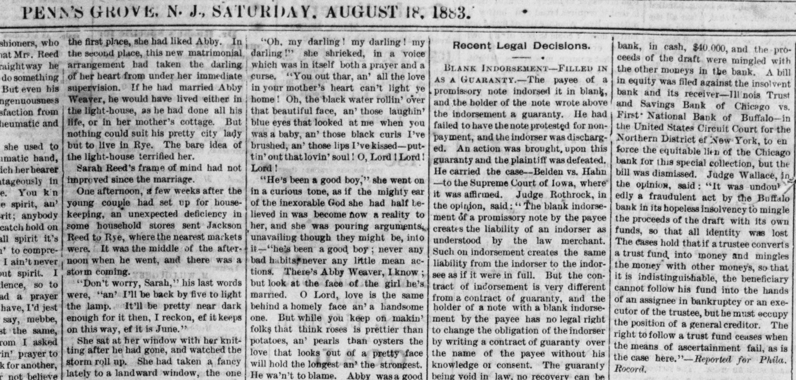 PENNS GROVE. N. J., SATURDAY, AUGUST 18, 1883. the first place, she had liked Abby. In "Oh, my darling 1 my darling ! my shioners, who Recent Legal Decisions. bank, in cash, $40.000, and the prothe second place, this new matrimonial darling she shrieked, in a voice Mrs. Reed ceeds of the draft were mingled with arrangement had taken the darling which was in itself both a prayer and a raightway he BLANK INDORSEMENT-FILLED IN the other moneys in the bank. A bill of her heart from under her immediate curse. "You out thar, an' all the love something AS A GUARANTY.-The payee of a in equity was filed against the insolvent supervision. If he had married Abby But even his in your mother's heart can't light ye promissory note indorsed it in blank, bank and its receiver—Ill'nois Trust Weaver, he would have lived either in home Oh, the black water rollin' over ngenuousness and the holder of the note wrote above and Savings Bank of Chicago vs. the light-house, as he had done all his sfaction from that beautiful face, an' those laughin' the indorsement a guaranty. He had First* National Bank of Buffalo-in life, or in her mother's cottage. But heumatic and blue eyes that looked at me when you failed to have the note protested for nonthe United States Circuit Court for the nothing could suit his pretty city lady was a baby, an' those black curls I've payment, and the indorser was dischargNorthern District ef New York, to en but to live in Rye. The bare idea of to used she brushed, an' those lips I've kissed-puted. An action was brought. upon this force the equitable lien of the Chicago the light-house terrified her. tin' out that lovin' soul : O, Lord Lord hand, guaranty and the plaintiff was defeated. bank for this special collection, but the Sarah Reed's frame of mind had not Lord I hearer He carried the case-Belden vs. Hahn bill was dismissed. Judge Wallace, in improved since the marriage. "He's been a good boy," she went on tageously in -to the Supreme Court of Iowa, where the opinion, said: "It was undou' One afternoon, a few weeks after the kin You in a curious tone, as if the mighty ear it was affirmed. Judge Rothrock, in edly a fraudulent act by the Buffalo of the inexorable God she had half bean' young couple had set up for housespirit, the opinion, said: The blank indorsebank in its hopeless insolvency to mingle keeping, an unexpected deficiency in lieved in was become now a reality to anybody ment of a promissory note by the payee the proceeds of the draft with its own some household stores sent Jackson catch hold on her, and she was pouring arguments, creates the liability of an indorser as funds, so that all identity was lost it's Reed to Rye, where the nearest markets unavailing though they might be, into spirit understood by the law merchant. The cases hold that if a trustee converts were. It was the middle of the afterit-"he's been a good boy; never any to compreSuch on indorsement creates the same a trust fund into money and mingles noon when he went, and there was a I ain't never bad habits," never any little mean acliability from the indorser to the indorthe money with other moneys, So that I storm coming. tions. There's Abby Weaver, Iknow; spirit. see as if it were in full. But the conit is indistinguishable, the beneficiary "Don't worry, Sarah," his last words but look at the face of the girl he's dence, SO to tract of indorsement is very different cannot follow his fund into the hands a were, "an' I'll be back by five to light married. O Lord, love is the same prayer from a contract of guaranty, and the of an assignee in bankruptcy or an exethe lamp. It'll be pretty near dark I'd behind a homely face an' a handsome holder of a note with a blank indorsejest have, cutor of the trustee, but he must occupy enough for it then, I reckon, ef it keeps one. But while you keep on makin' mebbe, ment by the payee has no legal right say, the position of a general creditor. The on this way, ef it is June.' folks that think roses is prettier than to change the obligation of the indorser the same, right to follow a trust fund ceases when She sat at her window with her knitasked potatoes, an' pearls than oysters the I by writing a contract of guaranty over the means of ascertainment fail, as is ting after he had gone, and watched the to love that looks out of a pretty face the name of the payee without his prayer the case here."-Reported for Phila. storm roll up. She had taken a fancy for will hold the longest an' the strongest. another, knowledge or consent. The guaranty Rocord. lately to a landward window, the one He wa'n't to blame. Abby wasa good believe being void in law. no recovery can be not
