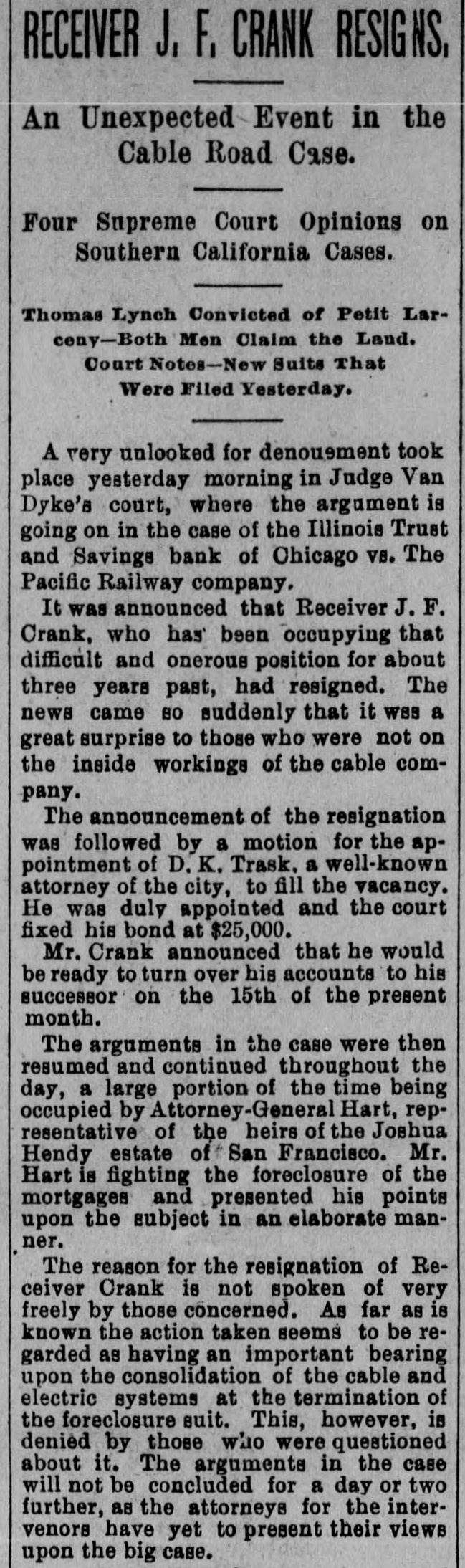 RECEIVER J, F, CRANK RESIGNS, An Unexpected Event in the Cable Road Case. Four Supreme Court Opinions on Southern California Cases. Thomas Lynch Convicted of Petit Larceny-Both Mon Claim the Land. Court Notes-New Suits That Were Filed Yesterday. A very unlooked for denouement took place yesterday morning in Judge Van Dyke's court, where the argument is going on in the case of the Illinois Trust and Savings bank of Chicago VS. The Pacific Railway company. It was announced that Receiver J. F. Crank, who has been occupying that difficult and onerous position for about three years past, had resigned. The news came SO suddenly that it was a great surprise to those who were not on the inside workings of the cable company. The announcement of the resignation was followed by a motion for the appointment of D. K. Trask. a well-known attorney of the city, to fill the vacancy. He was duly appointed and the court fixed his bond at $25,000. Mr. Crank announced that he would be ready to turn over his accounts to his successor on the 15th of the present month. The arguments in the case were then resumed and continued throughout the day, a large portion of the time being occupied by Attorney-General Hart, representative of the heirs of the Joshua Hendy estate of San Francisco. Mr. Hart is fighting the foreclosure of the mortgages and presented his points upon the subject in an elaborate manner. The reason for the resignation of Receiver Crank is not spoken of very freely by those concerned. As far as is known the action taken seems to be regarded as having an important bearing upon electric the systems consolidation at the of termination the cable and of the foreclosure suit. however, is were case denied about it. by The those arguments who This, in questioned the will not be concluded for a day or two further, as the attorneys for the intervenors have yet to present their views upon the big case.