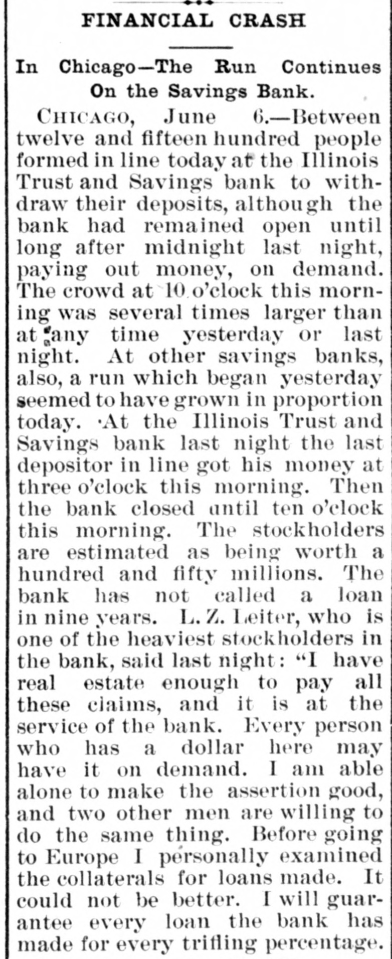 FINANCIAL CRASH In Chicago-The Run Continues On the Savings Bank. CHICAGO, June 6.-Between twelve and fifteen hundred people formed in line today at the Illinois Trust and Savings bank to withdraw their deposits, although the bank had remained open until long after midnight last night, paying out money, on demand. The crowd at 10.o'clock this morning was several times larger than at any time yesterday or last night. At other savings banks, also, a run which began yesterday seemed to have grown in proportion today. .At the Illinois Trust and Savings bank last night the last depositor in line got his money at three o'clock this morning. Then the bank closed until ten o'clock this morning. The stockholders are estimated as being worth a hundred and fifty millions. The bank has not called a loan in nine years. L.Z. Leiter, who is one of the heaviest stockholders in the bank, said last night: "I have real estate enough to pay all these claims, and it is at the service of the bank. Every person who has a dollar here may have it on demand. I am able alone to make the assertion good, and two other men are willing to do the same thing. Before going to Europe I personally examined the collaterals for loans made. It could not be better. I will guarantee every loan the bank has made for every trifling percentage.