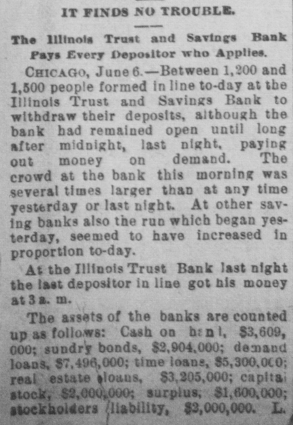 IT FINDS NO TROUBLE. The Illinois Trust and Savings Bank Pays Every Depositor who Applies. CHICAGO, June 6.-Between 1,200 and 1,500 people formed in line to-day at the Illinois Trust and Savings Bank to withdraw their deposits, although the bank had remained open until long after midnight, last night, paying out money on demand. The crowd at the bank this morning was several times larger than at any time yesterday or last night. At other saving banks also the run which began yesterday, seemed to have increased in proportion to-day. At the Illinois Trust Bank last night the last depositor in line got his money at 3a. m. The assets of the banks are counted up as follows: Cash on bank, $3,609, 000; sundry bonds, $2,904,000; demand loans, $7,496,000; time loans, $5,300,000; real estate aloans, $3,205,000; capital stock, $2,000,000; surplus, $1,600,000; stockholders liability, $3,000,000. L.