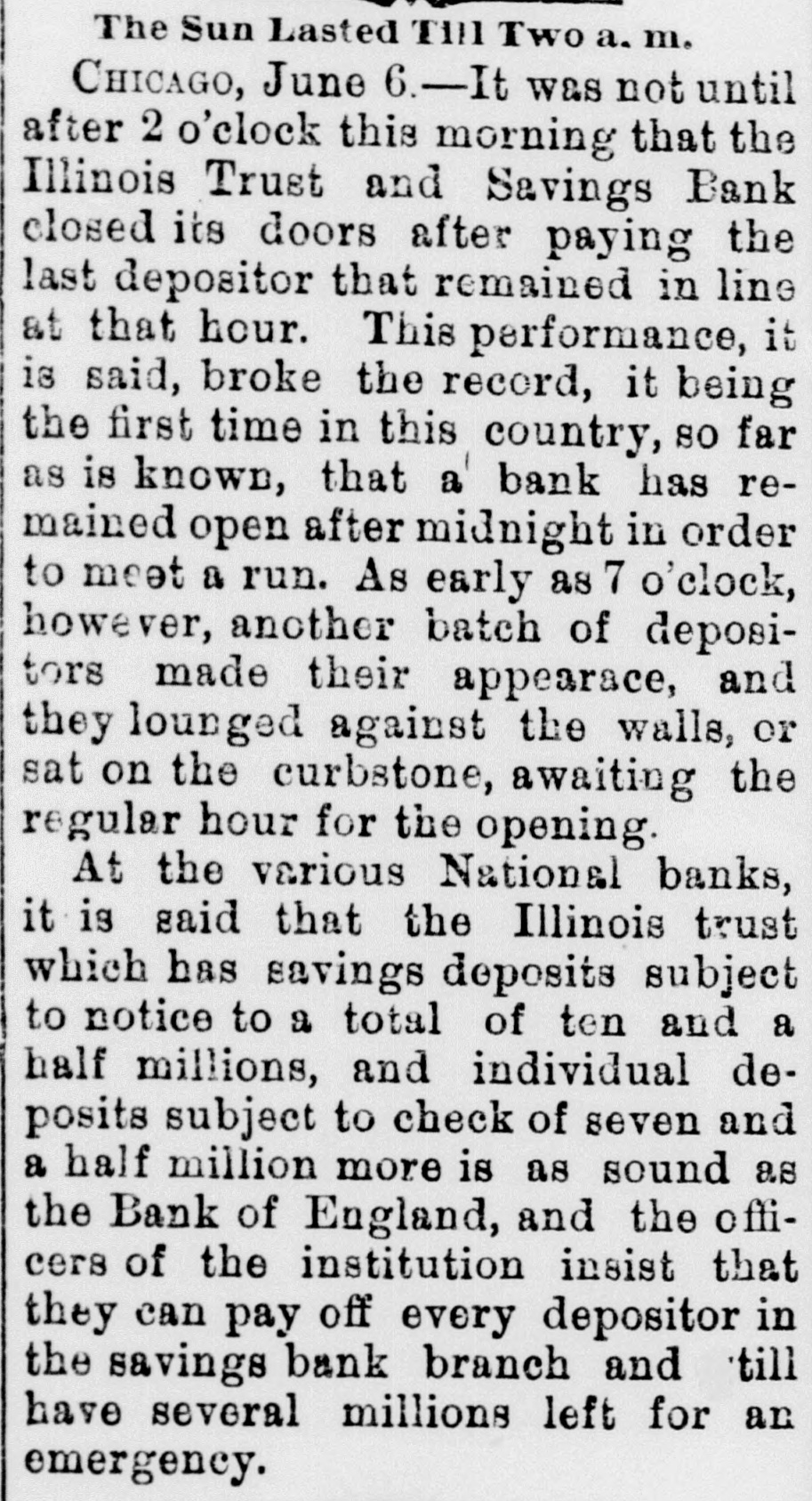 The Sun Lasted Till Two a. m. CHICAGO, June 6.-It was not until after 2 o'clock this morning that the Illinois Trust and Savings Bank closed its doors after paying the last depositor that remained in line at that hour. This performance, it is said, broke the record, it being the first time in this country, so far as is known, that a bank has remained open after midnight in order to meet a run. As early as 7 o'clock, however, another batch of depositors made their appearace, and they lounged against the walls, or sat on the curbstone, awaiting the regular hour for the opening. At the various National banks, it is said that the Illinois trust which has savings deposits subject to notice to a total of ten and a half millions, and individual deposits subject to check of seven and a half million more is as sound as the Bank of England, and the officers of the institution insist that they can pay off every depositor in the savings bank branch and till have several millions left for an emergency.
