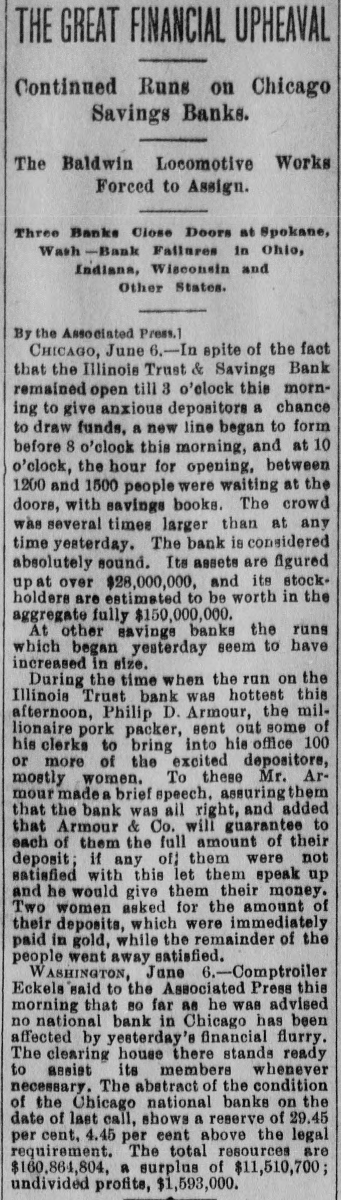 THE GREAT FINANCIAL UPHEAVAL Continued Runs on Chicago Savings Banks. The Baldwin Locomotive Works Forced to Assign. Three Banks Close Doors at Spokane, Wash -Bank Failures in Ohio, Indiana, Wisconsin and Other States. By the Associated Press. CHICAGO, June 6.-In spite of the fact that the Illinois Trust & Savings Bank remained open till 3 o'clock this morning to give anxious depositors a chance to draw funds, a new line began to form before 8 o'clock this morning, and at 10 o'clock, the hour for opening, between 1200 and 1500 people were waiting at the doors, with savings books. The crowd was several times larger than at any time yeaterday. The bank is considered absolutely sound. Its assets are figured upat over $28,000,000, and its stockholders are estimated to be worth in the aggregate fully $150,000,000. At other savings banks the runs which began yesterday seem to have increased in size. During the time when the run on the Illinois Trust bank was hottest this afternoon, Philip D. Armour, the millionaire pork packer, sent out some of his clerks to bring into his office 100 or more of the excited depositore, mostly women. To these Mr. Armour madea brief speech. assuring them that the bank was all right, and added that Armour & Co. will guarantee to each of them the full amount of their deposit; if any of them were not satisfied with this let them speak up and he would give them their money. Two women asked for the amount of their deposits, which were immediately paid in gold, while the remainder of the people went away satisfied. WASHINGTON, Jane 6.-Comptroiler Eckels said to the Associated Press this morning that 80 far as he was advised no national bank in Chicago has been affected by yesterday's financial flurry. The clearing house there stands ready to assist its members whenever necessary. The abstract of the condition of the Chicago national banks on the date of last call, shows a reserve of 29.45 per cent, 4.45 per cent above the legal requirement. The total resources are $160,864,804, R surplus of $11,510,700; undivided profits, $1,593,000.