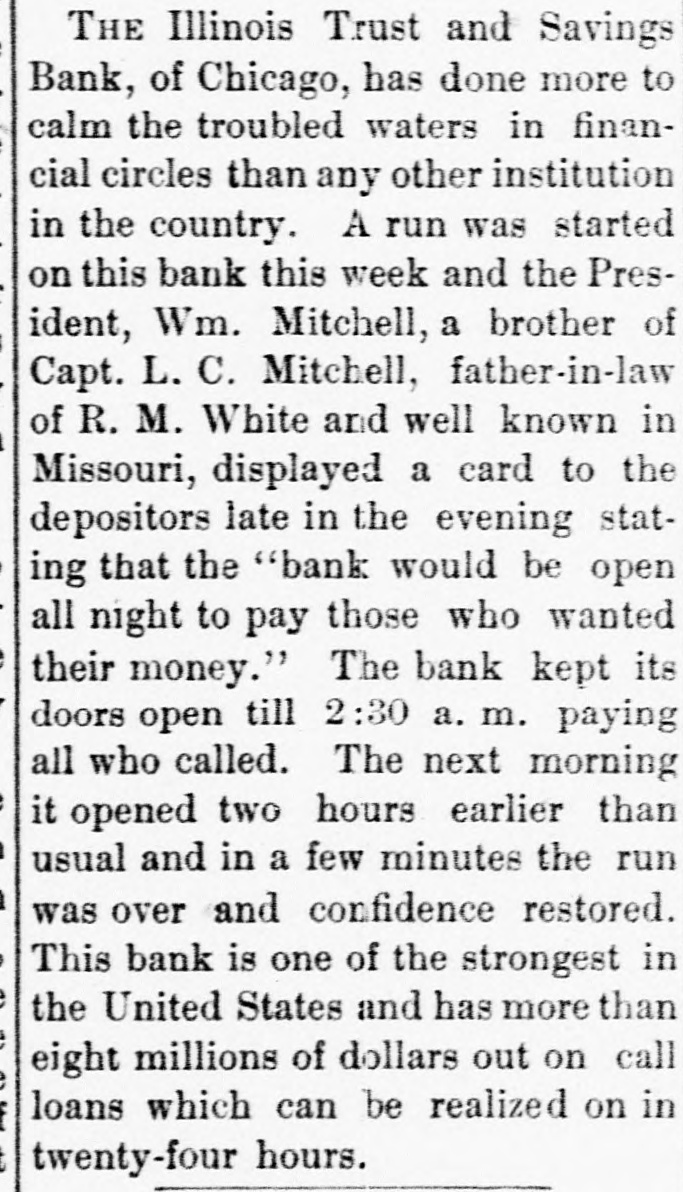 THE Illinois Trust and Savings Bank, of Chicago, has done more to calm the troubled waters in financial circles than any other institution in the country. A run was started on this bank this week and the President, Wm. Mitchell, a brother of Capt. L. C. Mitchell, father-in-law of R. M. White and well known in Missouri, displayed a card to the depositors late in the evening stating that the "bank would be open all night to pay those who wanted their money." The bank kept its doors open till 2:30 a. m. paying all who called. The next morning it opened two hours earlier than usual and in a few minutes the run was over and confidence restored. This bank is one of the strongest in the United States and has more than eight millions of dollars out on call loans which can be realized on in twenty-four hours.