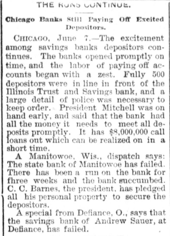 THE RUNS CONTINUE. Chicago Banks Still Paying Off Excited Depositors. CHICAGO, June 7.-The excitement among savings banks depositors continues. The banks opened promptly on time, and the labor of paying off accounts began with a zest. Fully 500 depositors were in line in front of the Illinois Trust and Savings bank, and a large detail of police was necessary to keep order. President Mitchell was on hand early, and said that the bank had all the money it needs to meet all deposits promptly. It has $8,000,000 call loans out which can be realized on in a short time. A Manitowoe, Wis., dispatch says: The state bank of Manitowoe has failed. There has been a run on the bank for fhree weeks and the bank succumbed. C. C. Barnes, the president. has pledged all his personal property to secure the depositors. A special from Defiance, O., says that the savings bank of Andrew Sauer, at Defiance, has failed.