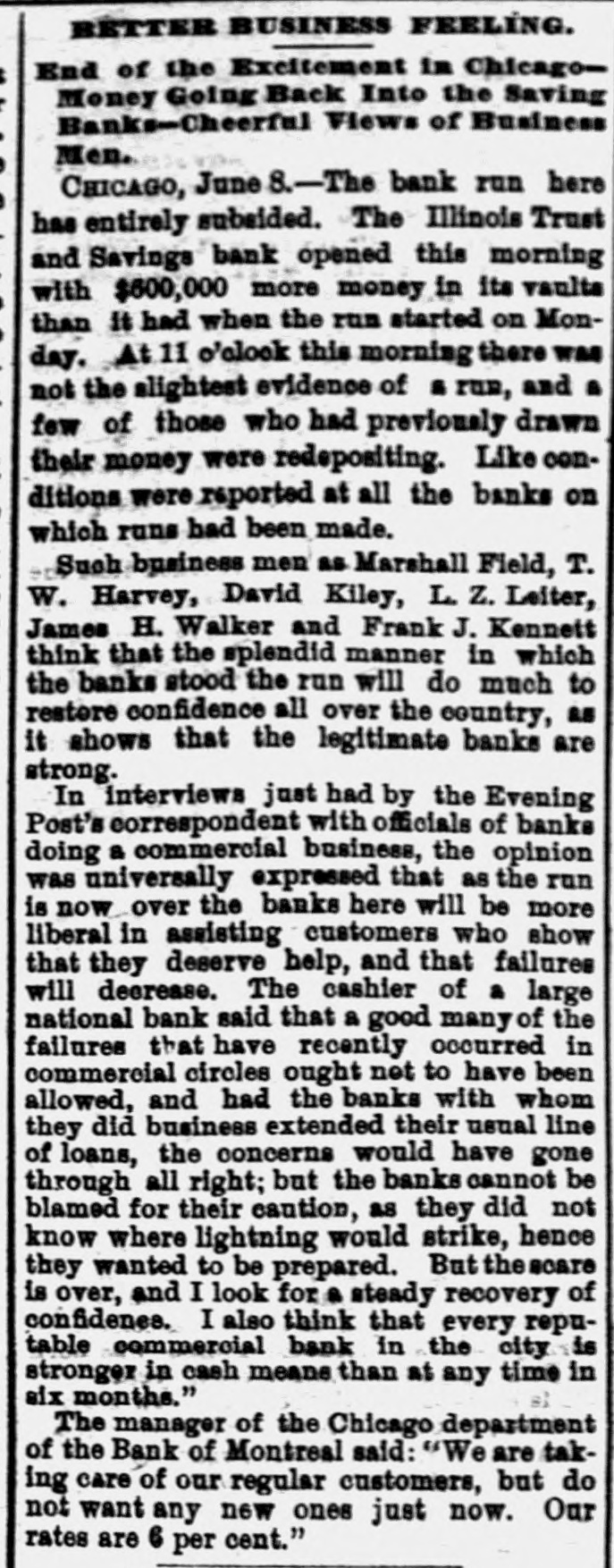 BETTER BUSINESS FEELING. End of the Excitement in ChicagoMoney Going Back Into the Saving Banks-Cheerful Views of Business Men. CHICAGO, June 8.-The bank run here has entirely subsided. The Illinois Trust and Savings bank opened this morning with $600,000 more money in its vaulta than it had when the run started on Monday. At 11 o'clock this morning there was not the slightest evidence of a run, and a few of those who had previously drawn their money were redepositing. Like conditions were reported at all the banks on which runs had been made. Such business men as Marshall Field, T. W. Harvey, David Kiley, L. Z. Leiter, James H. Walker and Frank J. Kennett think that the splendid manner in which the banks stood the run will do much to restore confidence all over the country, as it shows that the legitimate banks are strong. In interviews just had by the Evening Post's correspondent with officials of banks doing a commercial business, the opinion was universally expressed that as the run is now over the banks here will be more liberal in assisting customers who show that they deserve help, and that failures will decrease. The cashier of a large national bank said that a good many of the failures that have recently occurred in commercial circles ought net to have been allowed, and had the banks with whom they did business extended their usual line of loans, the concerns would have gone through all right; but the banks cannot be blamed for their caution, as they did not know where lightning would strike, hence they wanted to be prepared. But the scare is over, and I look for a steady recovery of confidence. I also think that every reputable commercial bank in the city is stronger in cash means than at any time in six months." The manager of the Chicago department of the Bank of Montreal said: "We are taking care of our regular customers, but do not want any new ones just now. Our rates are 6 per cent."