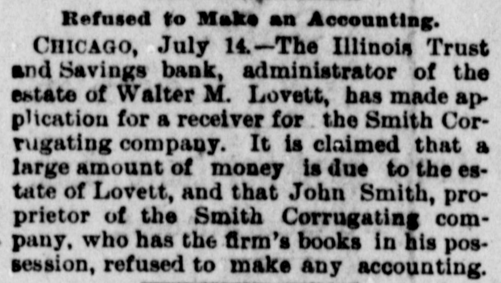 Refused to Make an Accounting. CHICAGO, July 14.-The Illinois Trust and Savings bank, administrator of the estate of Walter M. Lovett, has made application for a receiver for the Smith Corrugating company. It is claimed that a large amount of money is due to the estate of Lovett, and that John Smith, proprietor of the Smith Corrugating company, who has the firm's books in his possession, refused to make any accounting.