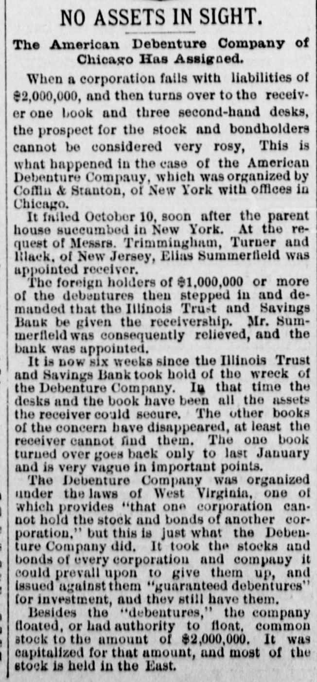 NO ASSETS IN SIGHT. The American Debenture Company of Chicago Has Assigned. When a corporation fails with liabilities of $2,000,000, and then turns over to the receiver one book and three second-hand desks, the prospect for the stock and bondholders cannot be considered very rosy, This is what happened in the case of the American Debenture Company, which was organized by Coffin & Stanton, of New York with offices in Chicago. It failed October 10, soon after the parent house succumbed in New York. At the request of Messrs. Trimmingham, Turner and Rlack, of New Jersey, Elias Summerfield was appointed receiver. The foreign holders of $1,000,000 or more of the debentures then stepped in and demanded that the Illinois Trust and Savings Bank be given the receivership. Mr. Summerfield was consequently relieved, and the bank was appointed. It is now six weeks since the Illinois Trust and Savings Bank took hold of the wreck of the Debenture Company. In that time the desks and the book have been all the assets the receiver could secure. The other books of the concern have disappeared, at least the receiver cannot find them. The one book turned over goes back only to last January and is very vague in important points. The Debenture Company was organized under the laws of West Virginia, one of which provides "that one corporation cannot hold the stock and bonds of another corporation." but this is just what the Debenture Company did. It took the stocks and bonds of every corporation and company it could prevall upon to give them up, and issued against them "guaranteed debentures" for investment, and they still have them. Besides the "debentures," the company floated, or had authority to float, common stock to the amount of $2,000,000. It was capitalized for that amount, and most of the stock is held in the East.