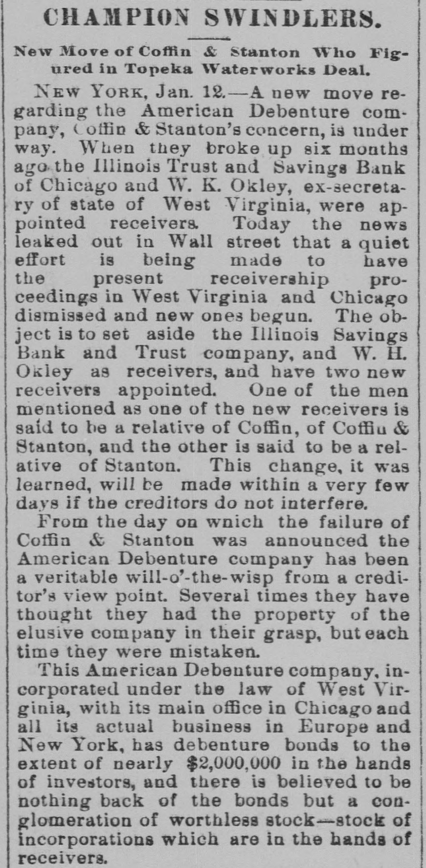 CHAMPION SWINDLERS. New Move of Coffin & Stanton Who Figured in Topeka Waterworks Deal. NEW YORK, Jan. 12.-A new move regarding the American Debenture company, Coffin & Stanton's concern, is under way. When they broke up six months ago the Illinois Trust and Savings Bank of Chicago and W. K. Okley, ex-secretary of state of West Virginia, were appointed receivers. Today the news leaked out in Wall street that a quiet effort is being made to have the present receivership proceedings in West Virginia and Chicago dismissed and new ones begun. The object is to set aside the Illinois Savings Bank and Trust company, and W. H. Okley as receivers, and have two new receivers appointed. One of the men mentioned as one of the new receivers is said to be a relative of Coffin, of Coffiu & Stanton, and the other is said to be a relative of Stanton. This change, it was learned, will be made within a very few days if the creditors do not interfere. From the day on wnich the failure of Coffin & Stanton was announced the American Debenture company has been a veritable will-o'-the-wisp from a creditor's view point. Several times they have thought they had the property of the elusive company in their grasp, but each time they were mistaken. This American Debenture company, incorporated under the law of West Virginia, with its main office in Chicago and all its actual business in Europe and New York, has debenture bonds to the extent of nearly $2,000,000 in the hands of investors, and there is believed to be nothing back of the bonds but a conglomeration of worthless stock-stock of incorporations which are in the hands of receivers.
