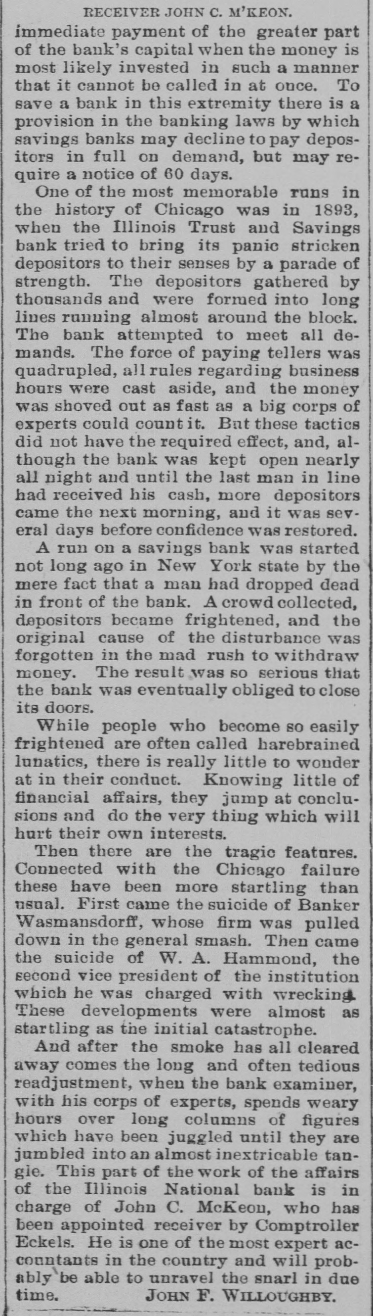 And after the smoke has all cleared away comes the long and often tedious readjustment, when the bank examiner, with his corps of experts, spends weary hours over long columns of figures which have been juggled until they are jumbled into an almost inextricable tangle. This part of the work of the affairs of the Illinois National bank is in charge of John C. McKeon, who has been appointed receiver by Comptroller Eckels. He is one of the most expert accountants in the country and will probably be able to unravel the snarl in due time.