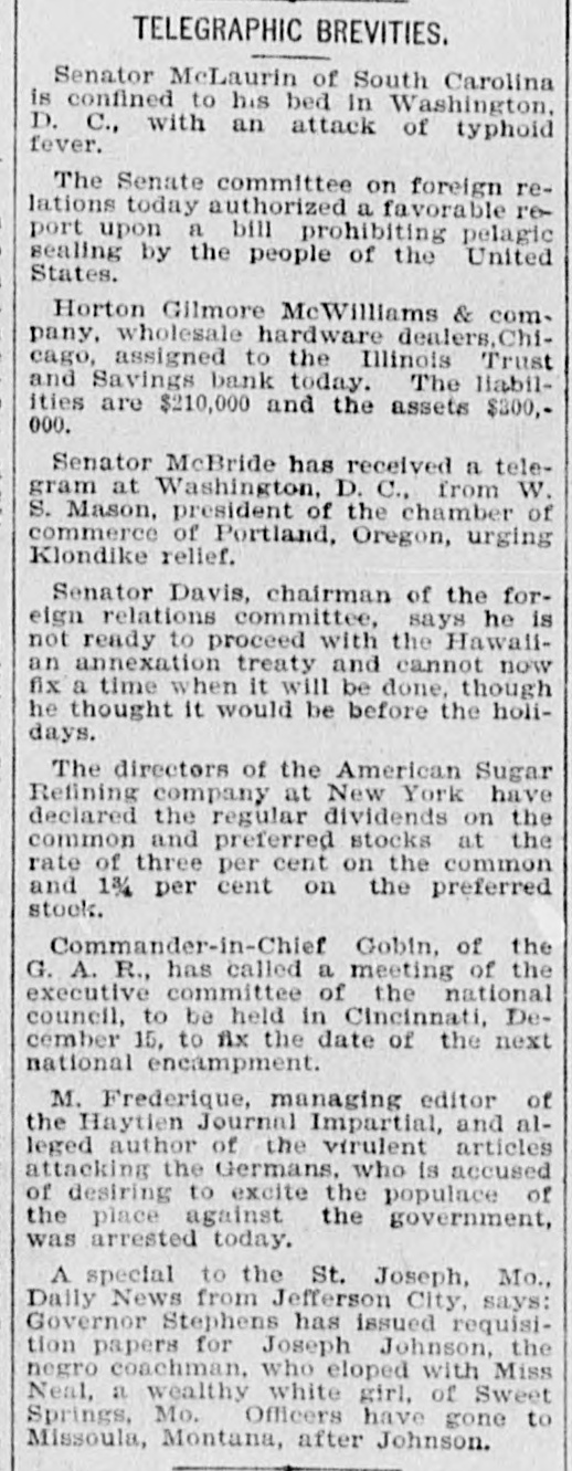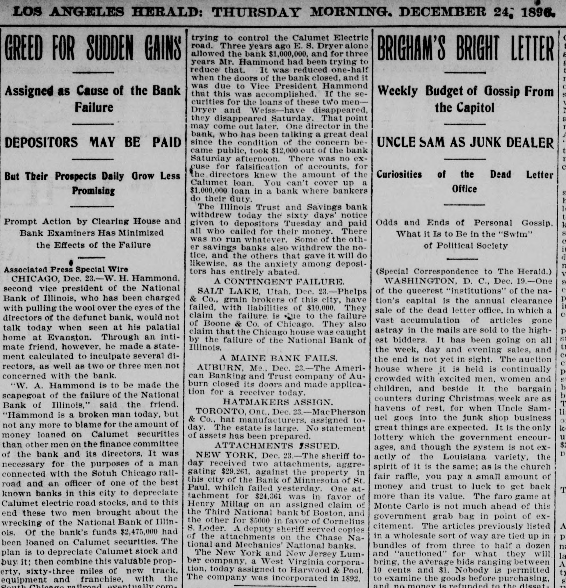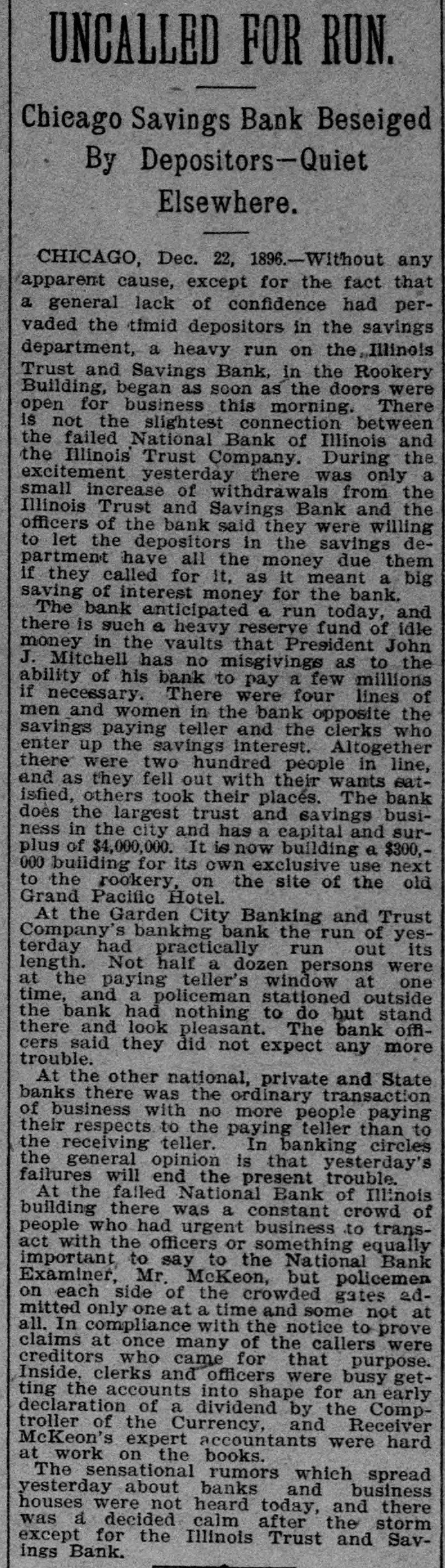 The @uhita Daily Lagle: Mednesday Morning, December 23, 1996. ficers declined to make any payment on terested. The property involved is estitime deposits unless given sixty days' BUTCHERS ON TRIAL mated at from $1,350,000t 0 $1,500,000 in SECOND 0 notice. They said this was not because value. It is located in the Yakima valthey were not prepared to pay all deley, east of the Cascade mountains. positors in full, but because they wished Thirty thousand acres of land were to avoid embarrassment to smaller STAMBOULOFF'S MURDERERS FACE UGARTRUST FIR bought from the Northern railroad and bankers who might not be prepared to a main canal, with laterals and ditches THEIR CRIME. AT THE A pay all their depositors at once, and who of a length of 320 miles, were built at a might be placed in an embarrassing pocost of $700,000. From time to time land. sition. The stronger banks were paying water and water rights were sold. An all demands for time deposits. In Evidence is Introduced a Remarkable issue of $450,000 in bonds was made. seWho Pay no Attenti ILLINOIS TRUST AND SAVINGS. cured by mortgage, in which the Safe Letter Written by the Premier Months the Sugar People, Deposit and Trust company was named There was a slight run on the Illinois Before His Assassination, Showing That Woolson Spice c as trustee. The hard times came on Trust and Savings bank shortly after it He Knew What Kind of a Volcano He Schulz could not raise money to comopened this morning, the similarity of its They've Got Their name and that of the National Bank of plete his scheme, suit for foreclosure Was Standing on-Story of the Horrible Don't Propose to was brought by the trustees, receivers Illinois having led some depositors to beMurder Briefly Retold-How a Com. lieve that the former was embarrassed. were appointed, of whom Paul Schulz cept Upon the Alt was one, and soon after he committed During the run in 1891 President John J. panion of His Was Killed by Being MisSaint Patrick in Mitchell of the Illinois Trust, gave orsuicide, under sensational circumstances. taken for Him. Snake Campaign-1 During the intervals receiver's certifiders to pay all depositors who called for cates to the amount of $250,000 were istheir money and was criticized by other (Copyrighted 1896 by the Associated Press. New York. Dec. sued, and it is believed that the holders bankers for doing SO. This morning, as Sofia, Bulgaria, Dec. 22.-The trial of that the American soon as it became evident that there was of those and bondholders were interested the persons accused of the murder of exin the reorganization plan, in which the pany intend forcing likely to be a crowd in the bank. instrucPremier Stambouloff, who was stabbed tions were given the tellers to serve the fee trade. the anno Safe Deposit and Trust company has in the streets of this city in July, 1895, taken the initiative. The London and customary sixty-day notice, but to pay to the trade by the S San Francisco bank and the electric corall depositors who could show that they resulting in his death on July 10 of that a further reduction wanted $100 of their money for a legitiporation of Boston are also largely conyear, was formally opened in the court pound in the price of cerned as holders of bonds and certifimate purpose. The result was that the house, before a mixed tribunal, yestercates. son Spice company score or more of people who had lined up day and was continued today. This makes a tot at the paying teller's window soon disM'KINLEYS RETURN TO CANTON The accused are: Boni Georgeff, aged cent since the pure appeared. Before the close of banking sed 34, a former servant of Major Panitza; Carrying Trunkloads of Inaugural Gear hours, the excitement had completely interest in the spice The With Them. died out. The giving of the notice was Atzoff, a Macedonian, aged 33, the gar people. Thus the sanctioned by the clearing house comChicago, Dec. 22.-President-elect Mccoachman who drove Stambouloff from have not met the re ghmittee, and the object was, the Illinois Kinley left for Canton shortly after 10 the Union club to the scene of the crime; ndis manifested by the Trust being the strongest savings bank o'clock tonight. He left the home of Mr. Naum Tuffektchieff, an employe in the of course the latter fir in the city, to give the smaller ones the McWilliams at 9:30 o'clock, and in combuilding department of the ministry of hat The feeling in the pany with his wife, Mr. and Mrs. Mcopportunity to point to its action as an public works here, and brother of Dimad excuse for giving the notice themselves, Williams and Captain Heisland, was the reduction of on itri Tuffeketchieff, who died in prison, as his which they did, and thus effectually driven to the depot. Ahead of them went merely preliminary is asserted, as a result of tortures instopped a run. a baggage wagon loaded with six trunks one. Speculation wa flicted by the direct orders of the late The Illinois Trust and Savings bank is everyone of them heavier than when the day as to what mea prime minister. insaid to have $9,000,000 in cash on hand McKinley party brought them to Chiwill adopt to counte Dimitri Tuffeketchieff was accused of at and was today loaning money instead of, cago. From the president-elect down to coffee made by the complicity in the murder of M. Beltas in 1893, calling loans in to meet the Mrs. McKinley's maid, every one of the The report circula cheffe. the minister of finance. who was demands of the savings depositors. party had some new clothes. In one people do not intend assassinated in the street in the presThe American Brewing, Malting and trunk was the gown which Mrs. McKinnently in the coffee ence of M. Stambouloff, for whom he the Elevator company, the George A. Weisse lew will wear at the inaugural, and in the prospects seeme was mistaken, on March 28, 1891. vas another was a new suit for Mr. McKinMalting and Elevator company and Arbuckles would gift The court house was strongly guarded ley. her George A. We