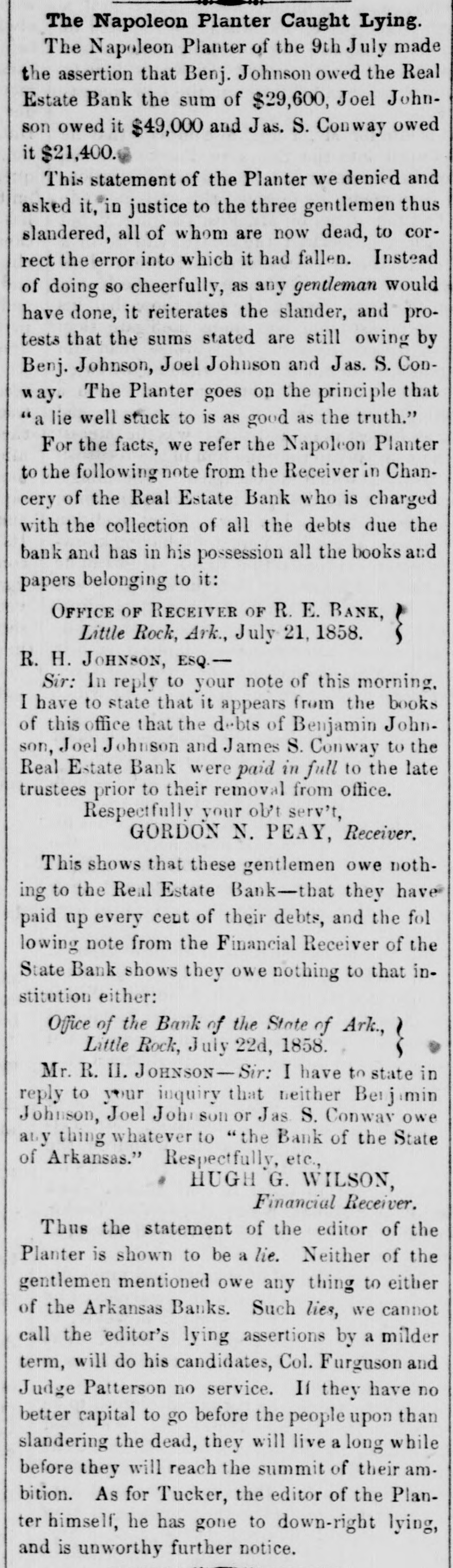 The Napoleon Planter Caught Lying. The Napoleon Planter of the 9th July made the assertion that Benj. Johnson owed the Real Estate Bank the sum of $29,600, Joel Johnson owed it $49,000 and Jas. S. Conway owed it $21,400 This statement of the Planter we denied and asked it, in justice to the three gentlemen thus slandered, all of whom are now dead, to correct the error into which it had fallen. Instead of doing so cheerfully, as any gentleman would have done, it reiterates the slander, and protests that the sums stated are still owing by Benj. Johnson, Joel Johnson and Jas. S. Conway. The Planter goes on the principle that "a lie well stuck to is as good as the truth." For the facts, we refer the Napoleon Planter to the following note from the Receiver in Chancery of the Real Estate Bank who is charged with the collection of all the debts due the bank and has in his possession all the books and papers belonging to it: OFFICE OF RECEIVER OF R. E. BANK, Little Rock, Ark., July 21, 1858. R. H. JOHNSON, ESQ.Sir: In reply to your note of this morning. I have to state that it appears from the books of this office that the debts of Benjamin Johnson, Joel Johnson and James S. Conway to the Real Estate Bank were paid in full to the late trustees prior to their removal from office. Respectfully your ob't serv't, GORDON N. PEAY, Receiver. This shows that these gentlemen owe nothing to the Real Estate Bank-that they have paid up every cent of their debts, and the fol lowing note from the Financial Receiver of the State Bank shows they owe nothing to that institution either: Office of the Bank of the State of Ark., Little Rock, July 22d, 1858. 5 Mr. R. II. JOHNSON-Sir: I have to state in reply to your inquiry that neither Benjamin Johnson, Joel John son or Jas. S. Conway owe any thing whatever to "the Bank of the State of Arkansas." Respectfully, etc., HUGH G. WILSON, Financial Receiver. Thus the statement of the editor of the Planter is shown to be a lie. Neither of the gentlemen mentioned owe any thing to either of the Arkansas Banks. Such lies, we cannot call the editor's lying assertions by a milder term, will do his candidates, Col. Furguson and Judge Patterson no service. If they have no better capital to go before the people upon than slandering the dead, they will live a long while before they will reach the summit of their ambition. As for Tucker, the editor of the Planter himself, he has gone to down-right lying, and is unworthy further notice.