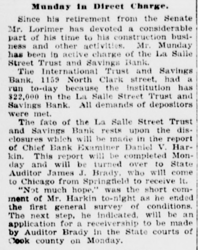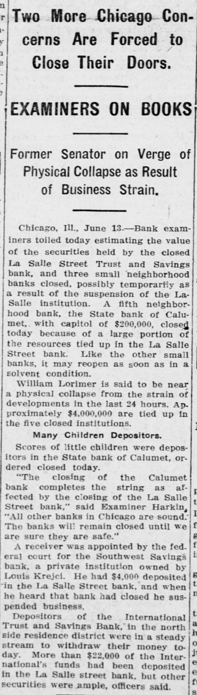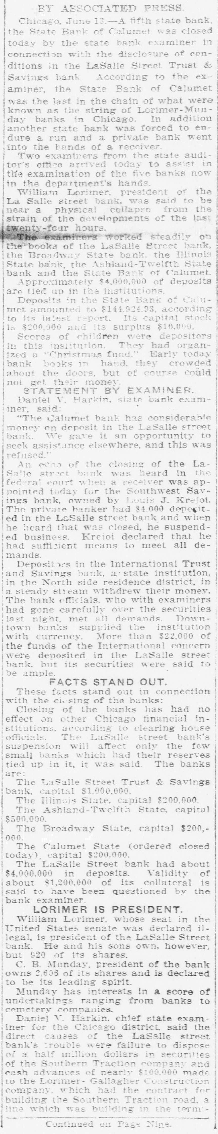BY ASSOCIATED PRESS Chicago, June 13.-A fifth state bank, the State Bank of Calumet was closed today by the state bank examiner in connection with the disclosure of conditions in the LaSalle Street Trust & Savings bank According to the examiner, the State Bank of Calumet was the last in the chain of what were known as the string of Lorimer-Munday banks in Chicago. In addition another state bank was forced to endure a run and a private bank went into the bands of a receiver Two examiners from the state audiin tor's office arrived today to assist the examination of the five banks now in the department's hands. William Lorimer, president of the Salle street bank, was said to be near a La physical collapse from the strain of the developments of the last twenty-four hours. The examiners worked steadily on the books of the LaSalle Street bank, the Broadway State bank. the Illinois State bank, the Ashland-Twelth State bank and the State Bank of Calumet. Approximately $4,000,000 of deposits tied up in the institutions, are Deposits in the State Bank 0.5 Calumet amounted to $144,924.93 according stock to its latest report. Its capital is $200,000 and its surplus $10,000. Scores of children were depositors this institution. They had organized in a "Christmas fund. Early today bank books in hand. they crowded about the doors, but of course could not get their money STATEMENT BY EXAMINER. Daniel V. Harkin, state bank examiner, said: "The Calumet bank has considerable money on deposit in the LaSalle street bank. We gave it an opportunity to seek assistance elsewhere, and this was refused." An ecno of the closing of the LaSalle street bank was heard in the federal court when a receiver was appointed today for the Southwest Savings bank, owned by Louis J. Krejoi. The private banker had $4.000 deposited in the LaSalle street bank and when he heard that was closed, he suspended business Krejoi declared that he had sufficient means to meet all demands. Depositors in the International Trust Savings bank, a state institution, in and in the North side residence district, a steady stream withdrew their money. The bank officials. who with examiners had gone carefully over the securities last night, met all demands. Downbanks supplied the institution with town currency. More than $22,000 of the funds of the International concern were deposited in the LaSalle street bank. but its securities were said to be ample. FACTS STAND OUT. These facts stand out in connection with the closing of the banks: Closing of the banks has had no effect on other Chicago financial institutions, according to clearing house officials. The LaSalle street bank's suspension will affect only the few small banks which had their reserves tied up in it, it was said The banks are: The LaSalle Street Trust & Savings bank, capital $1.000,000. The Illinois State, capital $200,000. The Ashland-Twelfth State, capital $500,000. The Broadway State, capital $200,000. The Calumet State (ordered closed today), capital $200,000. The LaSaile Street bank had about $4,000,000 in deposits. Validity of about $1,200,000 of its collateral is said to have been questioned by the bank examiner. LORIMER IS PRESIDENT. William Lorimer. whose seat in the United States senate was declared illegal, is president of the LaSalle Street bank. He and his sons own, however, but 920 of its shares. C. B. Munday, president of the bank owns 2.606 of its shares and is declared to be its leading spirit. Munday has interests in a score of undertakings ranging from banks to cemetery companies. Daniel V. Harkin. chief state examiner for the Chicago district. said the direct causes of the LaSalle street bank's crouble were failure to dispose of a half million dollars in securities of the Southern Traction company and cash advances of nearly $100,000 made the Lorimer- Gallagher Construction to company. which had the contract for building the Southern Traction road. a line which was building in the termiContinued en Page Nine.