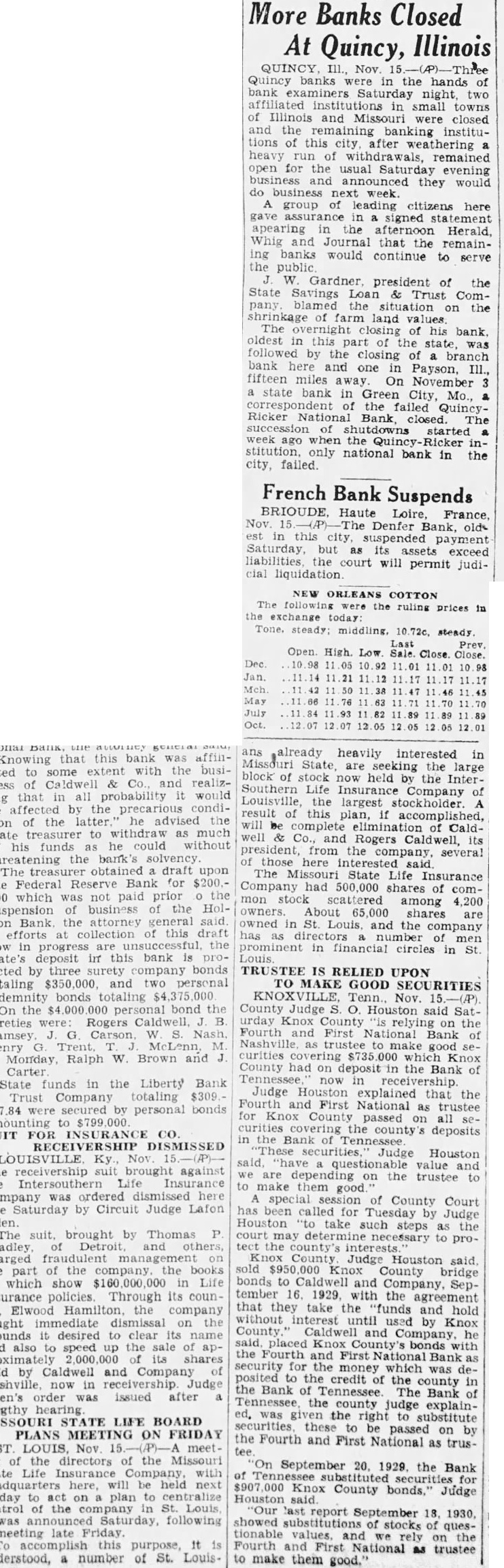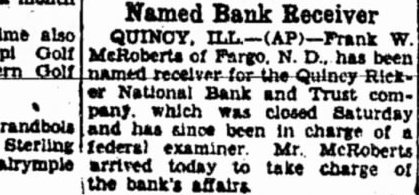 QUINCY, November Three Quincy banks were in the hands of bank examiners tonight, two affiliated institutions in small towns of Illinois and closed, and remaining banking institutions this city, after weathering heavy run of withdrawals, for the usuSaturday evening business and announced they would do business usual next The community in highly nervous state, evidenced by long lines customers waiting at windows to withdraw funds. group of leading citizens, however, gave signed pearing the afternoon HeraldWhig and Journal that the remaining banks would continue to serve public. Depositors were urged make their customary deposits essenwithdrawals without hysteria. W. Gardner, president of the State Savings Loan and Trust Company. blamed the situation on the shrinkage farm land values. Follows Failure. The closing his bank, oldest this part the state, brought the situation to crisis and was followed the closing of two branch banks here and in Payson, III., fifteen miles away. On Novembert state bank in Green City, Mo., correspondent of the QuincyRicker National closed its doors. The of started ago when the Quincy-Ricker institution, national bank in the city, The Loan and Trust Company had $6,216,000 deposits when last statement issued, and $1,000,000 capital. The South Side State Savings Bank and the Payson State Bank Payson, branches, closed during the morning.