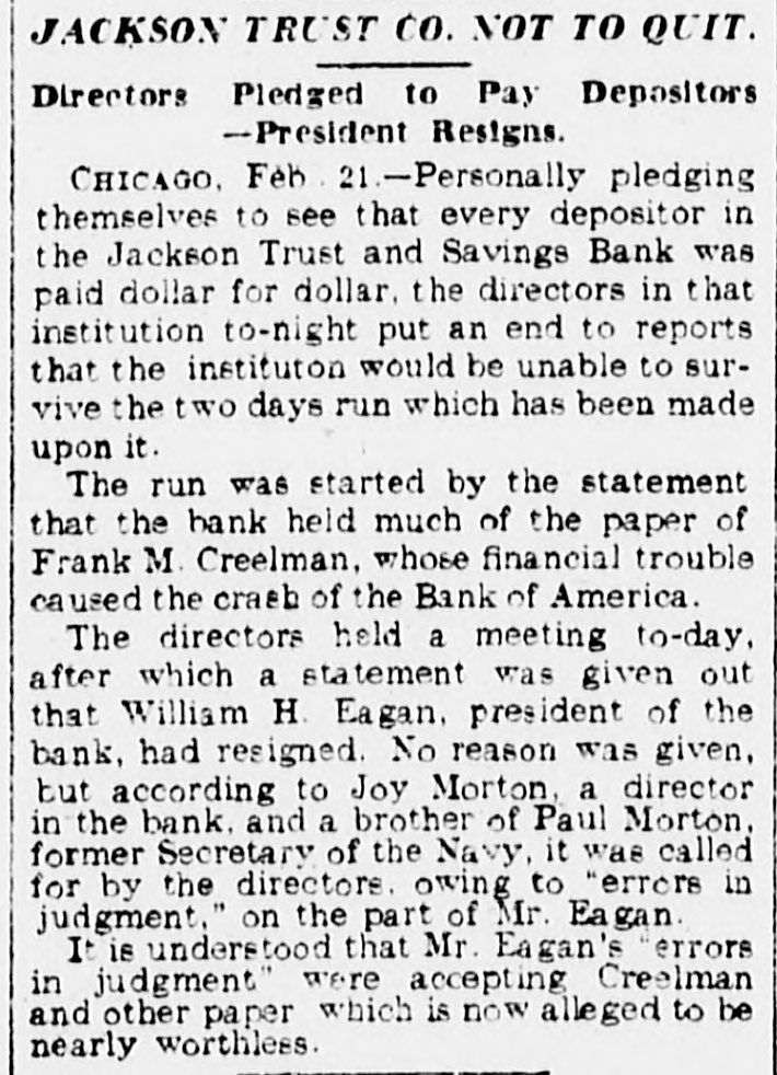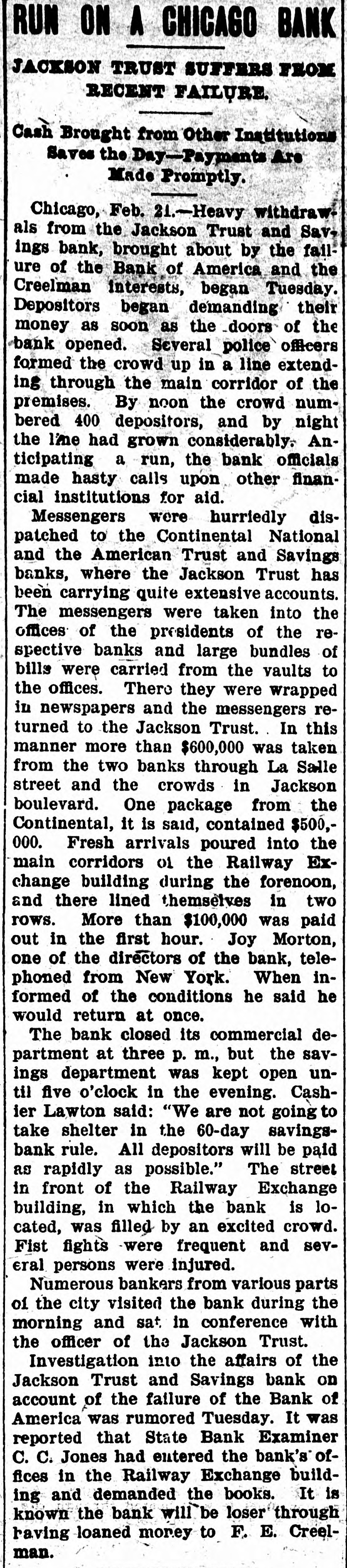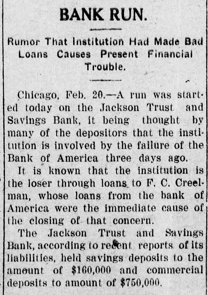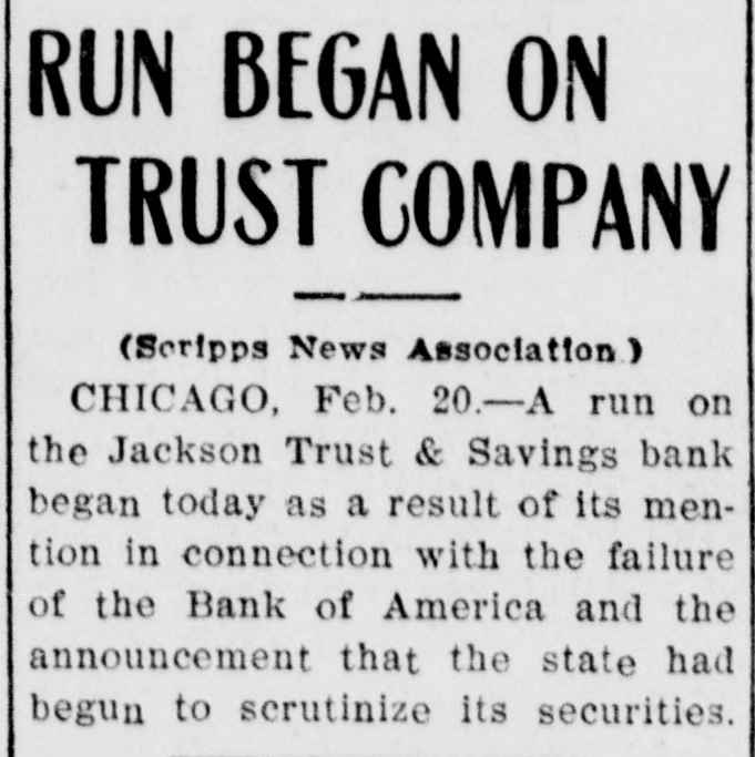 Depositors made a run on the Jackson Trust and Savings Bank of Chicago, believing it was involved by the failure of the Bank of America.