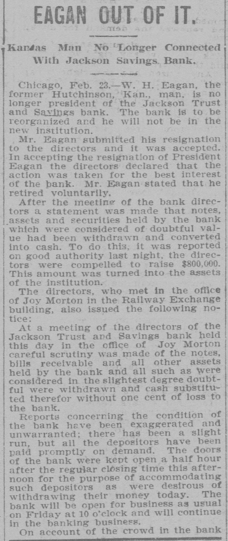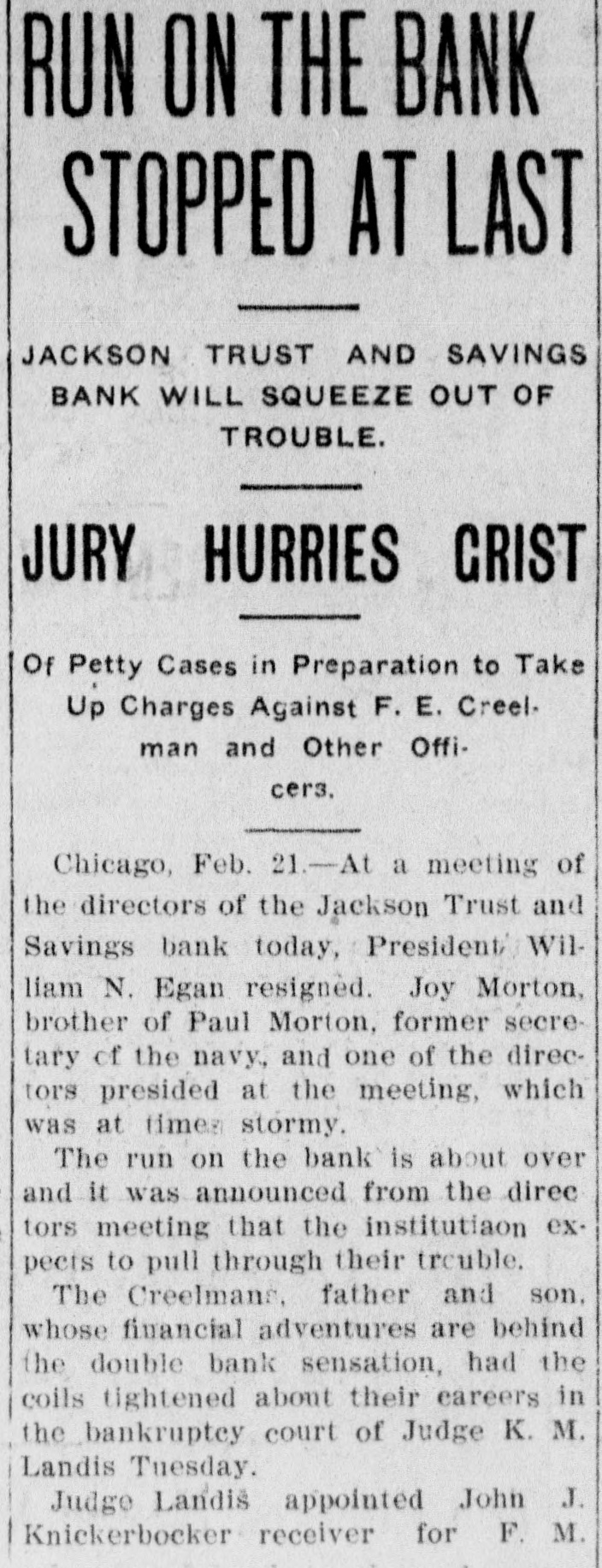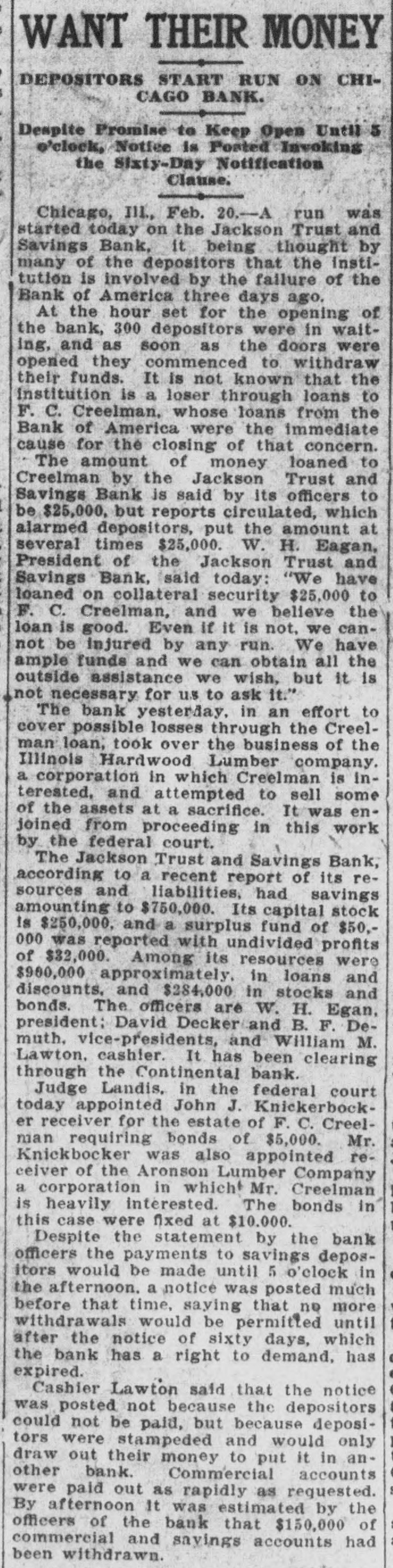 Depositors made a run on the Jackson Trust and Savings Bank of Chicago, believing it was involved by the failure of the Bank of America.