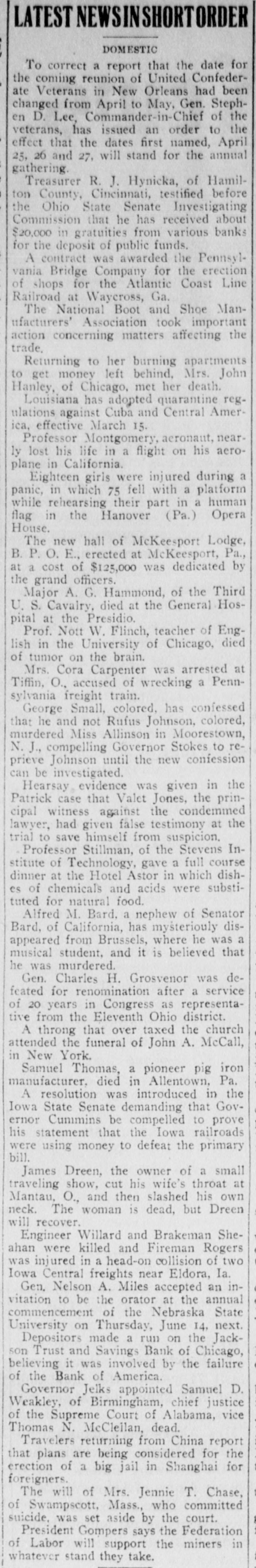 Prof. Nott W. Flinch, teacher of English in the University of Chicago, died of tumor on the brain.