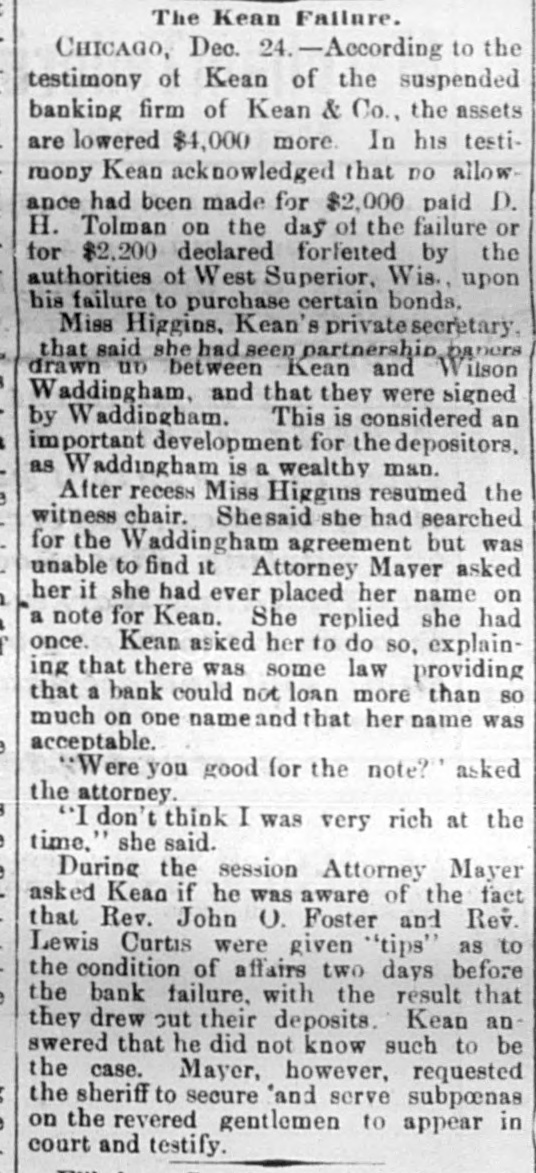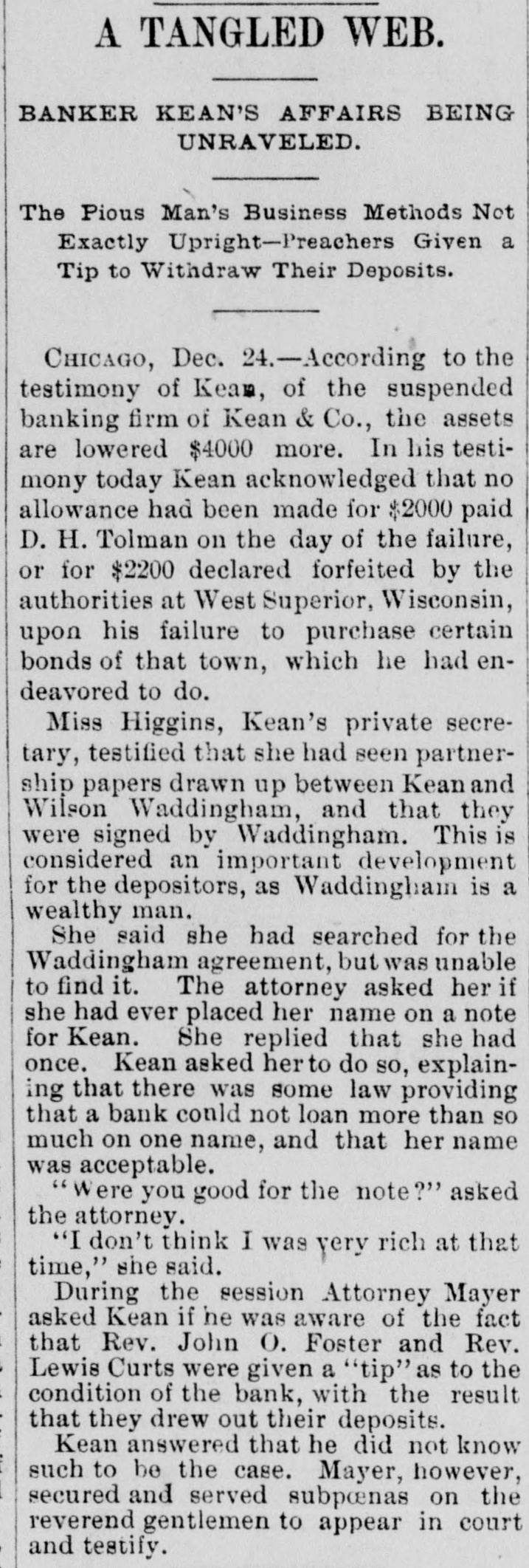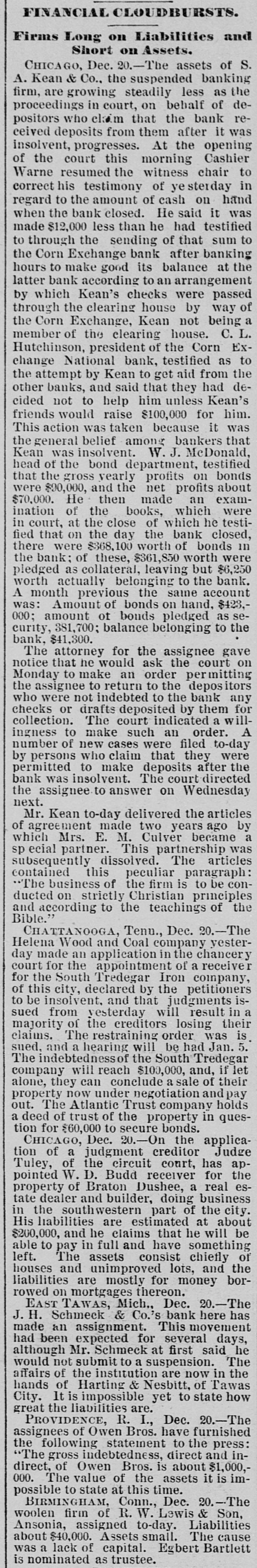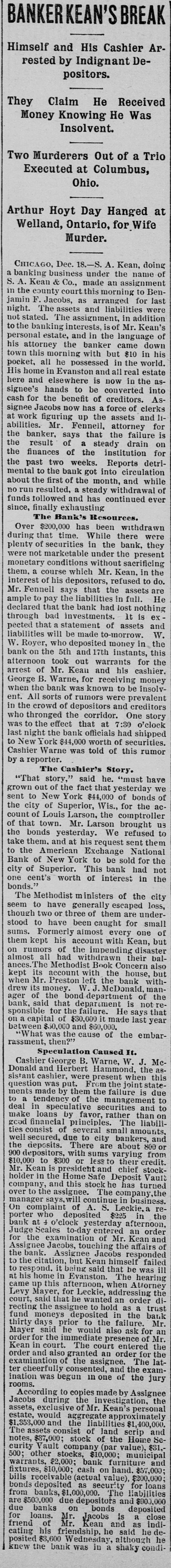 BANKERKEAN'S BREAK Himself and His Cashier De- Arrested by Indignant positors. He Claim Received They Money Knowing He Was Insolvent. Two Murderers Out of a Trio Executed at Columbus, Ohio. Arthur Hoyt Day Hanged Wife at Welland, Ontario, for Murder. doing CHICAGO, Dec. 18.-S. under A the Kean name of business assignment a banking Kean & Co., made morning an to BenS. A. county court this arranged for last jamin in the F. Jacobs, as and liabilities were night. The assets assignment, in addition Kean's not stated. The interests of Mr. of to the banking in the language personal estate, and banker came down attorney the with but $10 in his his this morning in the world. and in the pocket, town all he Evanston possessed and all real estate asbe His home in elsewhere is now converted into signee's here hands benefit to of creditors clerks Assignee cash for Jacobs the now up has the a force assets of and for 11 at work figuring Fenneil, attorney is abilities. banker, Mr. says that steady the drain failure for on the the result of a the institution the finances of weeks. Reports circulation detrithe past the two bank got into and while mental the to first of the month, withdrawal of since, about no run followed resulted. and a steady has continued ever funds finally exhausting Bank's Resources. The has been withdrawn were Over $200,000 time. While there they during that in the bank, present plenty not of marketable securities without under the sacrificing were conditions Kean. in the monetary a course which Mr. refused to do. them. of his depositors, the assets are Mr. interest Fennell says liabilities that in full. nothing He ample to that pay the the bank had lost It is exdeclared investments. and through that bad statement to-morrow. of assets W. the on bank pected liabilities will be deposited made money in this the out warrants W. Royer, who 5th and 17th instants, for the cashier. afternoon of Mr. took Kean and receiving his money was bank arrest George B. Warne, for known to be insolvwere prevalent ent. when All the sorts of rumors and creditors crowd of depositors One story in who the thronged the that corridor. at 7:30 o'clock was to the the effect bank officials had securities shipped last night $44,000 worth of rumor Cashier to New York Warne was told of this have by reporter. The Cashier's Story. "must "That out story, of the fact said $44,000 that he. vesterday of bonds we of grown New York Wis., for the acsent city to of Superior, the comptroll us the of Louis Larson brought count that town Mr. Larson We refused to of yesterday sent them Exchange the bonds them. and at his request National take to the American York to be sold for the not one Bank of New This bank had the city of cent's Superior. worth of interest in bonds. Methodist m inisters escaped of the loss, city The have generally are underseem to or three of them for small though two have been caught one of stood to Formerly almost with every Kean, but rumors sums. kept his account impending disaster withdrawn them of the their balalso on almost had Book Concern but ances The account Methodis with the bank house, with kept when its Mr Preston W left the McDonald, of man- the drew its money bond department is not reof ager of said the that department He says that bank, sponsible for the $30,000 failure. made last year on capital and $60,000. embarthen?" tween What $50, was the cause of the J. Mc rassment, Speculat Caused W. It. George B. Warne, the asand present Cashier Herbert Hammond, when this sistant Donald cashier, were From the joint is tate- due ments question made was by put them of the the manager failure and to to to tendency securities than on deal in loans specula by favor, rather The liabilimake good financial of principles. several small bankers, amounts and ties consist due to city about 800 or well the secured, deposits. with There sums are varying their credit from 900 depositors. to $300 or less to and chief stock$10,000 is president Deposit Vaul Mr. Kean the Home Safe he has turned holder in and this stock The company the over company to the assignee continue in business. remanager compla jaint of A. S. $225 Leckie. in the On who deposited vesterday afternoon, porter bank at o'clock to-day entered Kean an order and Judge Scales ination of Mr. affairs for the exam Jacobs, touc ing the responded Assignee Assignee Jacobs himself failed respond. the bank citation but Kean that be was ill Evanston to the citation it being said The hearing at to his home in afternoon, when Atrorney the came up this for Leckie, addressing an order diLevy Mayer, said that he wanted hold as trust court, the assignee to in the bank recting moneys deposit the failure Mr thirty fund days prior he would to also ask for of Mr. an The for order Mayer for said the imi mediate court presence of entered the the Kean court also granted an order The latorder and of the assignee. and the examwas ination begun ter examination cheerful consented, in one of the jury Assignee rooms. According to copies investiga made by tion, the Jacobs exclusive during the of Mr. Kean's personal ximately estate, assets, would aggregate liabilities app $1,400,000, and the Jand scrip and $1,353,000 The assets consist stock of of the Home $31, Sevalue) curity notes, $37,000 Vault company $10,000: (par municipal and 500; other $2,000; stocks, bank furniture $57,000; warrants $10,000; cash on hand, $200,000 fixtures, eivable (actual value) for loans bills deposited as security The liabilities bonds from banks, due $1,000,000. depositor and deposited $900,000 are $500,000 bonds close due banks Mr. on Jacobs is as a indifor loans. of Mr. Kean and said he defriend his friendship. he although he cating posited knew the $3,600 bank Wednesd was in shaky condi