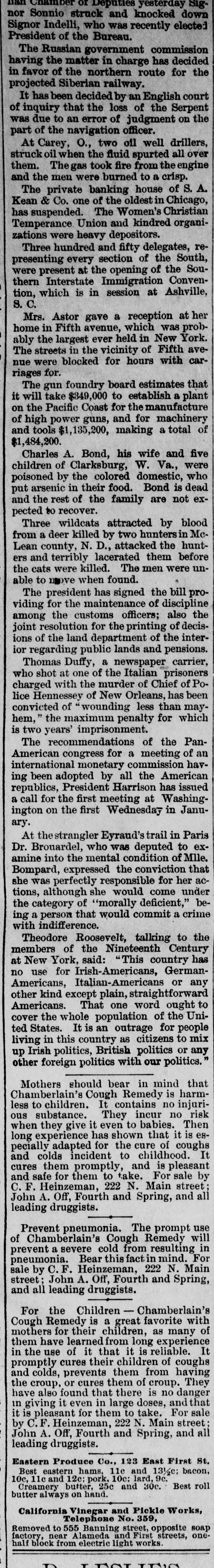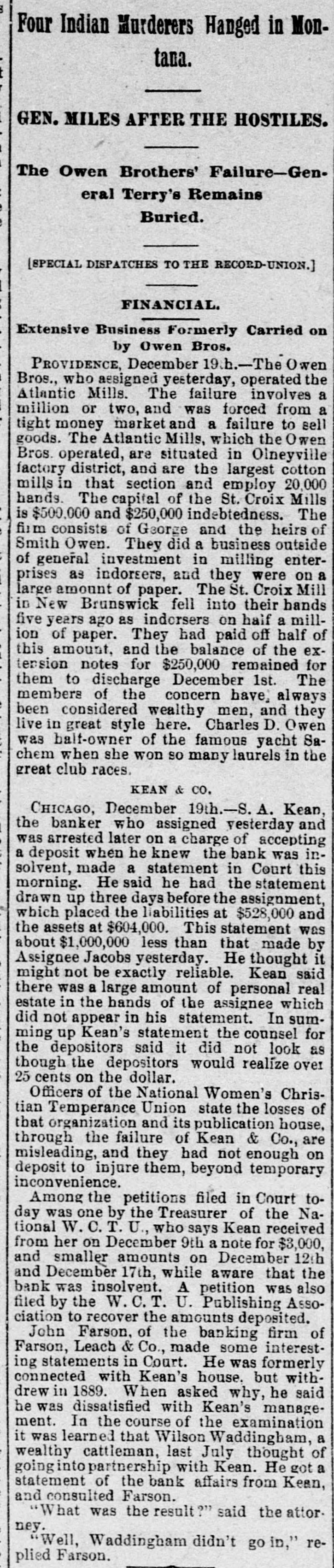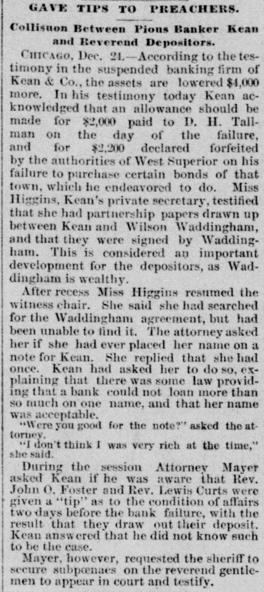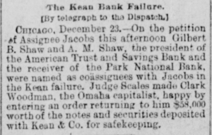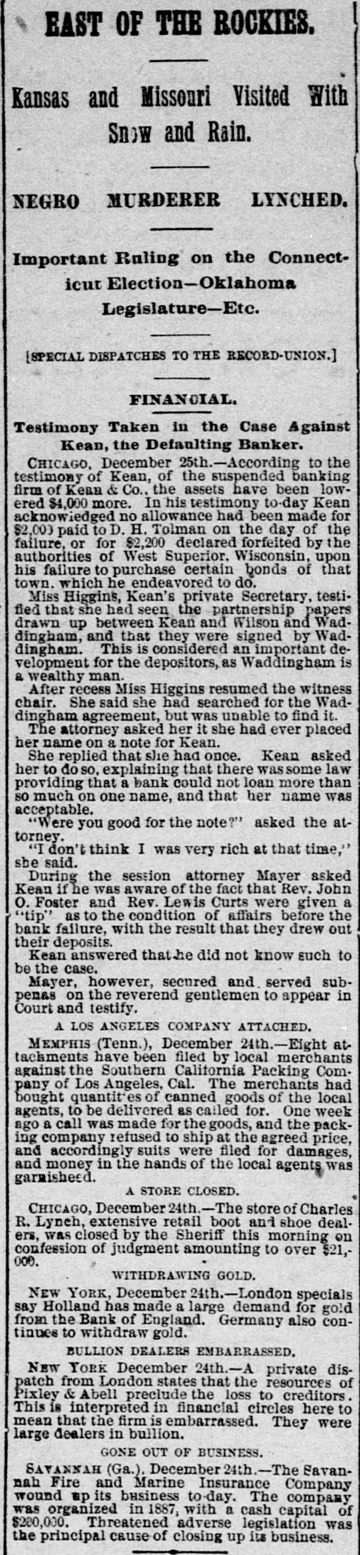 BANKERKEAN'S BREAK Himself and His Cashier De- Arrested by Indignant positors. He Claim Received They Money Knowing He Was Insolvent. Two Murderers Out of a Trio Executed at Columbus, Ohio. Arthur Hoyt Day Hanged Wife at Welland, Ontario, for Murder. doing CHICAGO, Dec. 18.-S. under A the Kean name of business assignment a banking Kean & Co., made morning an to BenS. A. county court this arranged for last jamin in the F. Jacobs, as and liabilities were night. The assets assignment, in addition Kean's not stated. The interests of Mr. of to the banking in the language personal estate, and banker came down attorney the with but $10 in his his this morning in the world. and in the pocket, town all he Evanston possessed and all real estate asbe His home in elsewhere is now converted into signee's here hands benefit to of creditors clerks Assignee cash for Jacobs the now up has the a force assets of and for 11 at work figuring Fenneil, attorney is abilities. banker, Mr. says that steady the drain failure for on the the result of a the institution the finances of weeks. Reports circulation detrithe past the two bank got into and while mental the to first of the month, withdrawal of since, about no run followed resulted. and a steady has continued ever funds finally exhausting Bank's Resources. The has been withdrawn were Over $200,000 time. While there they during that in the bank, present plenty not of marketable securities without under the sacrificing were conditions Kean. in the monetary a course which Mr. refused to do. them. of his depositors, the assets are Mr. interest Fennell says liabilities that in full. nothing He ample to that pay the the bank had lost It is exdeclared investments. and through that bad statement to-morrow. of assets W. the on bank pected liabilities will be deposited made money in this the out warrants W. Royer, who 5th and 17th instants, for the cashier. afternoon of Mr. took Kean and receiving his money was bank arrest George B. Warne, for known to be insolvwere prevalent ent. when All the sorts of rumors and creditors crowd of depositors One story in who the thronged the that corridor. at 7:30 o'clock was to the the effect bank officials had securities shipped last night $44,000 worth of rumor Cashier to New York Warne was told of this have by reporter. The Cashier's Story. "must "That out story, of the fact said $44,000 that he. vesterday of bonds we of grown New York Wis., for the acsent city to of Superior, the comptroll us the of Louis Larson brought count that town Mr. Larson We refused to of yesterday sent them Exchange the bonds them. and at his request National take to the American York to be sold for the not one Bank of New This bank had the city of cent's Superior. worth of interest in bonds. Methodist m inisters escaped of the loss, city The have generally are underseem to or three of them for small though two have been caught one of stood to Formerly almost with every Kean, but rumors sums. kept his account impending disaster withdrawn them of the their balalso on almost had Book Concern but ances The account Methodis with the bank house, with kept when its Mr Preston W left the McDonald, of man- the drew its money bond department is not reof ager of said the that department He says that bank, sponsible for the $30,000 failure. made last year on capital and $60,000. embarthen?" tween What $50, was the cause of the J. Mc rassment, Speculat Caused W. It. George B. Warne, the asand present Cashier Herbert Hammond, when this sistant Donald cashier, were From the joint is tate- due ments question made was by put them of the the manager failure and to to to tendency securities than on deal in loans specula by favor, rather The liabilimake good financial of principles. several small bankers, amounts and ties consist due to city about 800 or well the secured, deposits. with There sums are varying their credit from 900 depositors. to $300 or less to and chief stock$10,000 is president Deposit Vaul Mr. Kean the Home Safe he has turned holder in and this stock The company the over company to the assignee continue in business. remanager compla jaint of A. S. $225 Leckie. in the On who deposited vesterday afternoon, porter bank at o'clock to-day entered Kean an order and Judge Scales ination of Mr. affairs for the exam Jacobs, touc ing the responded Assignee Assignee Jacobs himself failed respond. the bank citation but Kean that be was ill Evanston to the citation it being said The hearing at to his home in afternoon, when Atrorney the came up this for Leckie, addressing an order diLevy Mayer, said that he wanted hold as trust court, the assignee to in the bank recting moneys deposit the failure Mr thirty fund days prior he would to also ask for of Mr. an The for order Mayer for said the imi mediate court presence of entered the the Kean court also granted an order The latorder and of the assignee. and the examwas ination begun ter examination cheerful consented, in one of the jury Assignee rooms. According to copies investiga made by tion, the Jacobs exclusive during the of Mr. Kean's personal ximately estate, assets, would aggregate liabilities app $1,400,000, and the Jand scrip and $1,353,000 The assets consist stock of of the Home $31, Sevalue) curity notes, $37,000 Vault company $10,000: (par municipal and 500; other $2,000; stocks, bank furniture $57,000; warrants $10,000; cash on hand, $200,000 fixtures, eivable (actual value) for loans bills deposited as security The liabilities bonds from banks, due $1,000,000. depositor and deposited $900,000 are $500,000 bonds close due banks Mr. on Jacobs is as a indifor loans. of Mr. Kean and said he defriend his friendship. he although he cating posited knew the $3,600 bank Wednesd was in shaky condi