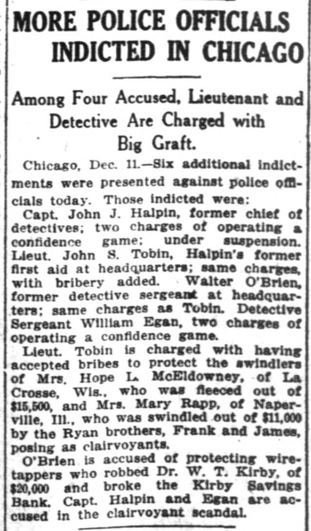 MORE POLICE OFFICIALS INDICTED IN CHICAGO Among Four Accused, Lieutenant and Detective Are Charged with Big Graft. Chicago, Dec. 11.-Six additional indictments were presented against police officials today. Those indicted were: Capt. John J. Halpin, former chief of detectives; two charges of operating a confidence game; under suspension. Lieut. John S. Tobin, Halpin's former first aid at headquarters; same charges, with bribery added. Walter O'Brien, former detective sergeant at headquarters; same charges as Tobin. Detective Sergeant William Egan, two charges of operating a confidence game. Lieut. Tobin is charged with having accepted bribes to protect the swindlers of Mrs. Hope L. McEldowney, of La Crosse, Wis., who was fleeced out of $15,500, and Mrs. Mary Rapp, of Naperville, III., who was swindled out of $11,000 by the Ryan brothers, Frank and James, posing as clairvoyants. O'Brien is accused of protecting wiretappers who robbed Dr. W. T. Kirby, of $20,000 and broke the Kirby Savings Bank. Capt. Halpin and Egan are accused in the clairvoyant scandal.
