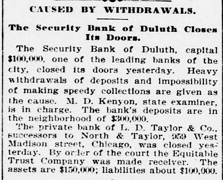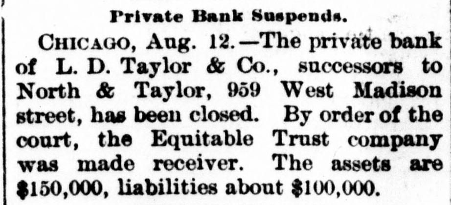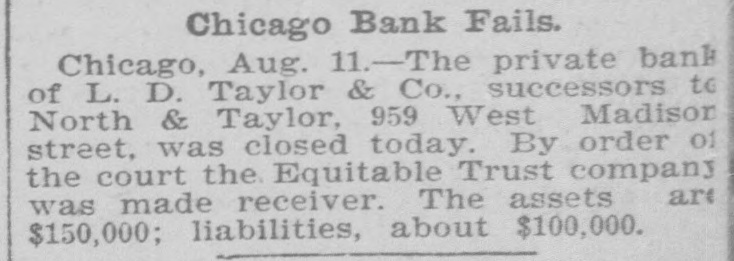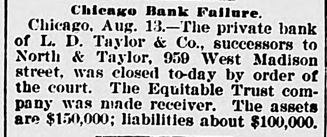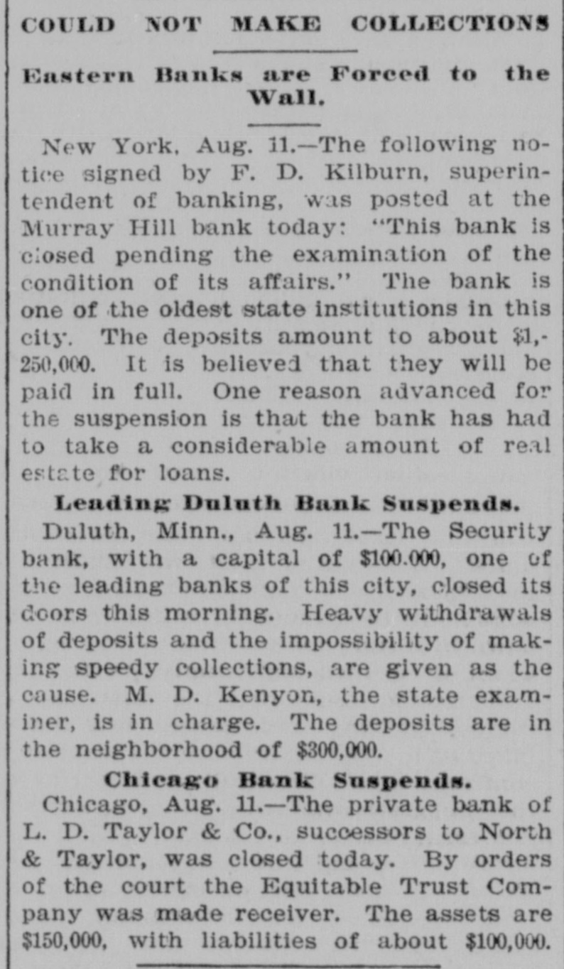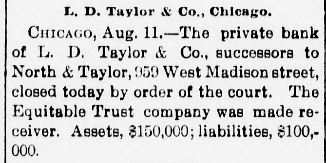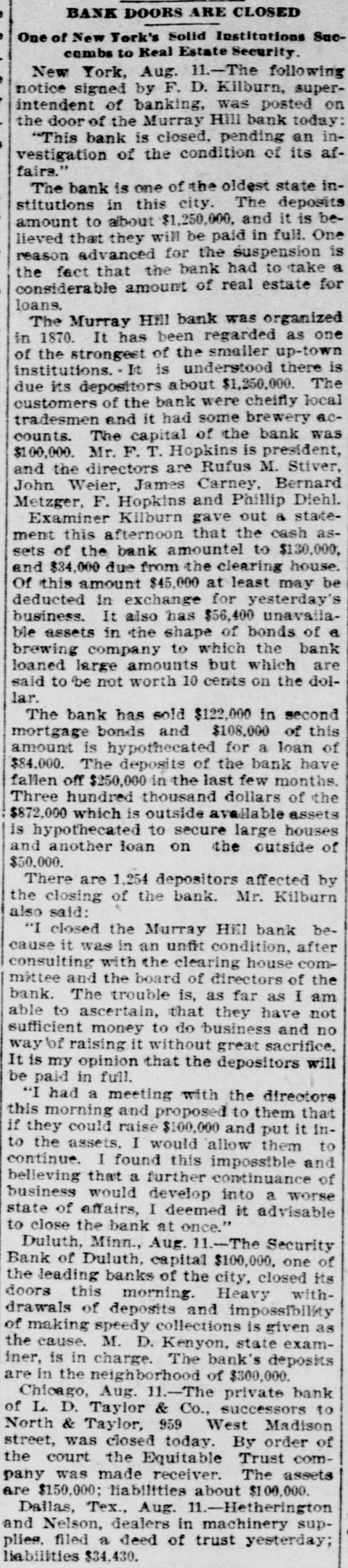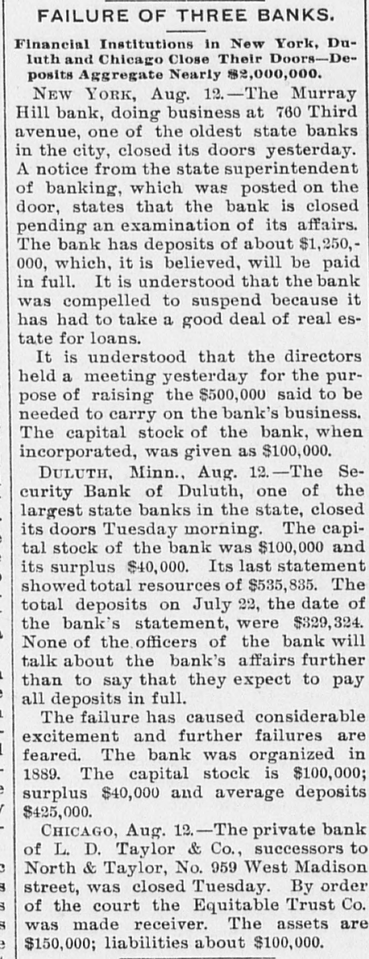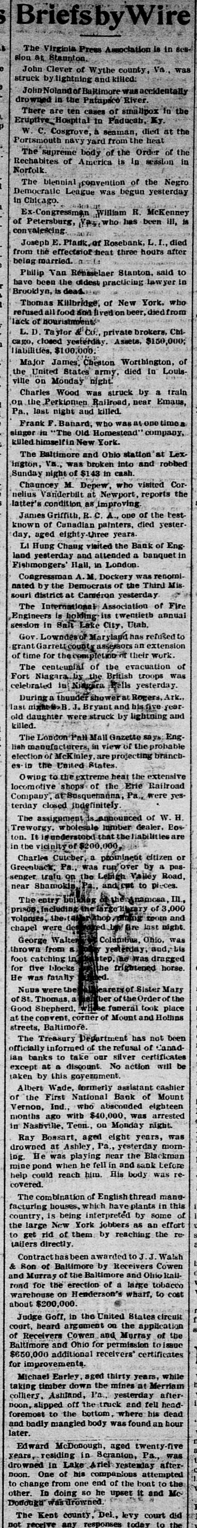 Briefs Wire The Virginia Press Association is in sesStatution 18 nots John Clever of Wythe county, Va was struck by lightning and killed. gmm drowned in the Patapaco River. em of xodillans jo sames ua) are There Eruptive_ Hospital to Paducab, Ky W C. Cosgrove, à seaman, died at the Portsmouth navy yard from the heat The supreme body of the Order of the Rechabites of America is in session in Norfolk. The biennial convention of the Negro Democratic League was begun yesterday Chicago up Congressmen William R. McKenney of 'III used say Petersburg, JO con valescing Joseph E. Plank of Rosebank, L.I., died from the effectsion heat three hours after F) being married. Philip Van Rensselaer Stanton, said to 01 Jas AMT em need DA BY SI Broophy Thomas Killbridge, of New York, who refused all food and lived on beer, died from lack of nouristment. L. D. Ta ylor & Co., private brokers, Chicago, closed yesterday. Assets, $150,000; liabilities, $100,000. Major James, Cheston Worthington, of the United States army, died in Louis14310 Aupuop uo Charles Wood was struck by a train on the Perkiomen Railroad, near Emaus, Pa., last night and killed. seam euo 10 SEM OUM Bennrd a Read PIO eq.L., If Jestings killed himselfin New York. The Baltimore and Ohio station at Lexington, Va., was broken into and robbed cash up JO 94214 Arpung Chauncey M. Depew, who visited Cornelius Vanderbilt at Newport, reports the latter's condition as improving. teat que JO eno "V 3 R secure known of Canadian painters, died yesterrears pe30 'Xup LI Hung Chang visited the Bank of England yesterday and attended a banquet in Fishmongers' Hall, in London. Congressman A.M. Dockery was renomiSIN name am JO Democrates am 4q natud souri district at Cameron yesterday The International Association of Fire [enuue sig Supplon #1 Regiseers session in Salt Lake City, Utab. Gov. Lowndesor Maryland has refused to grant Garrettcounty assessors an extension of time for the completion their work. The centennial of the evacuation of Fort Niagara by the British troops was celebrated in Niagara Falls yesterday. During a thunder shower Rogers, Ark., 1003 pue "f" 1851 old daughter were.struck by lightning and killed. The London Pall Mall Gazette says: EngJ9 Maja 115 qett election of McKinley are projecting branches in the United States o wing to the extreme heat the extensive locomotive shops of the Erie Railroad Company at Susquehanna, Pa., were yes. terday closed indefinitely H M JO insurred and Treworgy, wholesale lumber dealer. Eoston. It understood the liabilities are in the vicinity of $200 Charles Cutcher, a prominent citizen or sed B Aq SEM ""d Greenback, Road KOHEA eq) do ujen sender $10.00 07 beau The entry bujkNeg Anamosa, III., 000 jo any goals pue moos Sump (eq) chapel were by fire last night. George Walter Columbia, Ohio. was of most thrown yesterday, and, bis an SUM 100j catching passes eq horse. 1 blooks ever JOJ Junes SUM en Nums were the Hearers of Sister Mary B as JO ber of the Order of the Good Shepherd, whice funeral took place at the convent, corner of Mount and Hollins streets, Baltimore The Treasury Department has not been officially informed of the refusal of Canadian banks to take our silver certificates except at a discount. No action will be taken by this government. Albert Wade, formerly assistant cashier of the First National Bank of Mount Vernon, Ind., who absconded eighteen arrested SUM '000'0F$ quite ONE months in Nashville, Tenn., on Monday night. Ray Bossart, aged eight years, was drowned at Ashley, Pa., yesterday morning. He was playing near the Blackman mine pond when he fell in and sank before 19.1 SEM spoq SH mill reach could djay covered. The combination of English thread manufacturing houses, which have plants in this country, is being interpreted by some of the large New York jobbers as an effort -91 qui 4q them JO pm jaz 01 tailers directly. Contract has been awarded to J.J. Walsh & Son of Baltimore by Receivers Cowen and Murray of the Baltimore and Ohio RallJames B JO erection and JOJ DEOJ warehouse on Henderson's wharf, to cost 000'00% about Judge Goff, in the United States circuit court, heard argament on the application of Receivers Cowen and Murray of the Baltimore and Ohio for permission to issue $650,000 additional receivers' certificates JOJ Michael Earley, aged thirty years, while taking timber down the mines at Merriam colliery. Ashland, Pa., yesterday afternoon, slipped off the truck and fell headforemost to the bottom, where his dead moq un punoj SEM Apoq pue later. Edward McDonough, aged twenty-five years, residing in Scranton, Pa., was after-