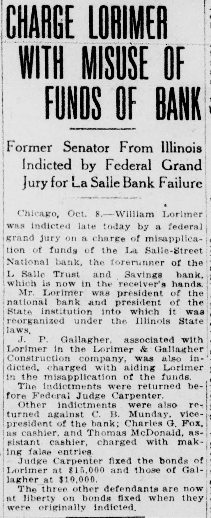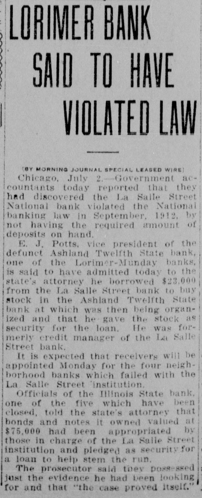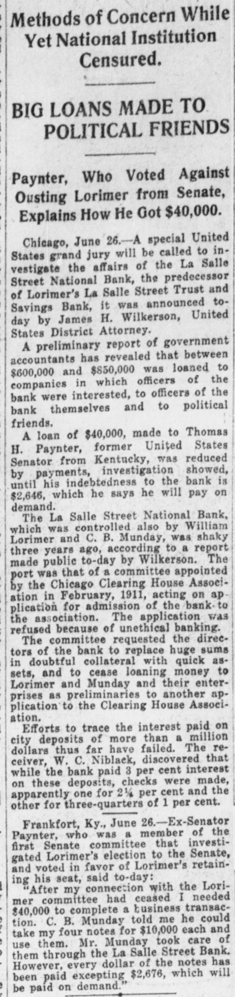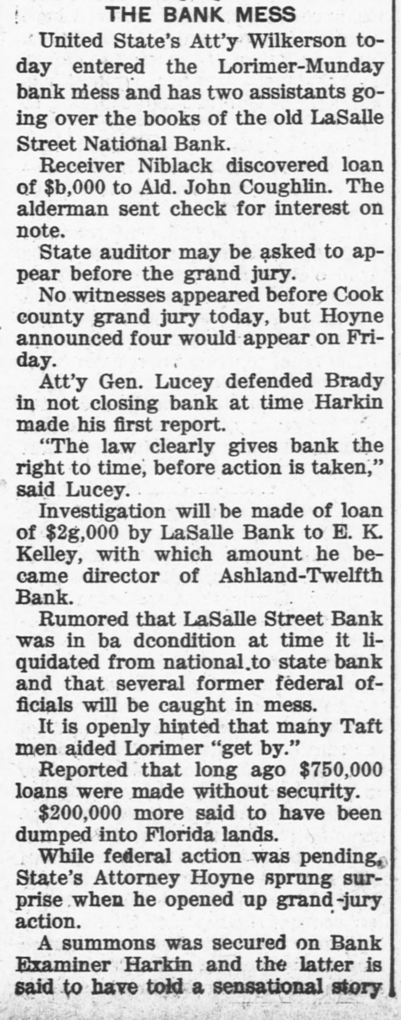 THE BANK MESS United State's Att'y Wilkerson today entered the Lorimer-Munday bank mess and has two assistants going over the books of the old LaSalle Street National Bank. Receiver Niblack discovered loan of $b,000 to Ald. John Coughlin. The alderman sent check for interest on note. State auditor may be asked to appear before the grand jury. No witnesses appeared before Cook county grand jury today, but Hoyne announced four would appear on Friday. Att'y Gen. Lucey defended Brady in not closing bank at time Harkin made his first report. "The law clearly gives bank the right to time, before action is taken," said Lucey. Investigation will be made of loan of $2g,000 by LaSalle Bank to E. K. Kelley, with which amount he became director of Ashland-Twelfth Bank. Rumored that LaSalle Street Bank was in ba dcondition at time it liquidated from national. to state bank and that several former federal officials will be caught in mess. It is openly hinted that many Taft men aided Lorimer "get by." Reported that long ago $750,000 loans were made without security. $200,000 more said to have been dumped into Florida lands. While federal action was pending, State's Attorney Hoyne sprung surprise when he opened up grand -jury action. A summons was secured on Bank Examiner Harkin and the latter is said to have told a sensational story