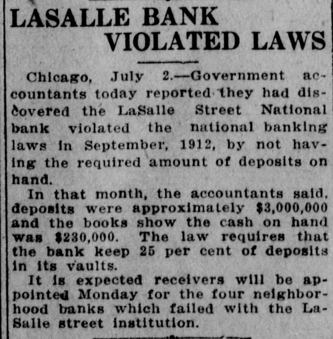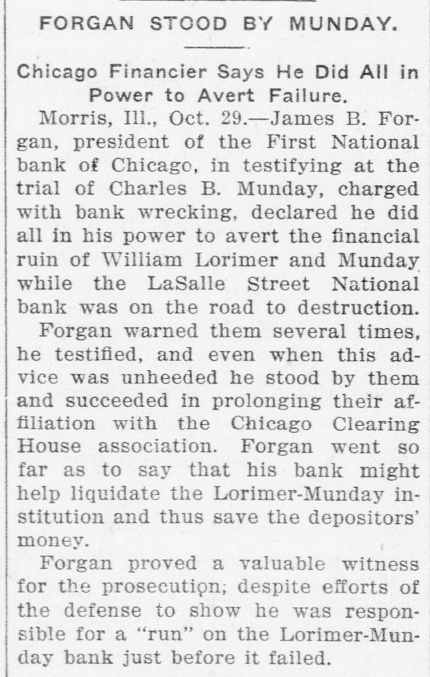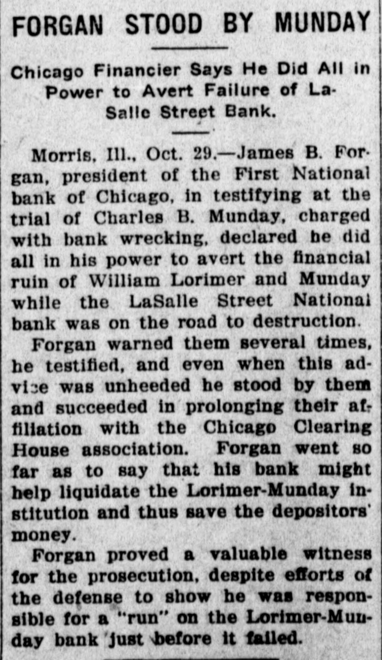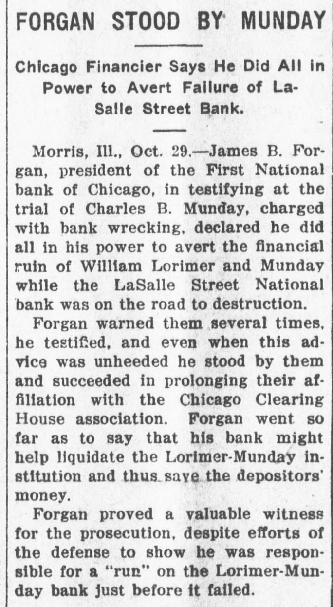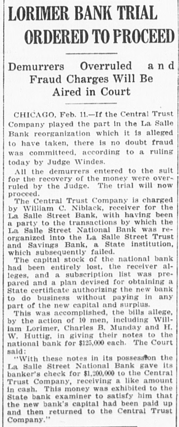 THE BANK MESS United State's Att'y Wilkerson today entered the Lorimer-Munday bank mess and has two assistants going over the books of the old LaSalle Street National Bank. Receiver Niblack discovered loan of $b,000 to Ald. John Coughlin. The alderman sent check for interest on note. State auditor may be asked to appear before the grand jury. No witnesses appeared before Cook county grand jury today, but Hoyne announced four would appear on Friday. Att'y Gen. Lucey defended Brady in not closing bank at time Harkin made his first report. "The law clearly gives bank the right to time, before action is taken," said Lucey. Investigation will be made of loan of $2g,000 by LaSalle Bank to E. K. Kelley, with which amount he became director of Ashland-Twelfth Bank. Rumored that LaSalle Street Bank was in ba dcondition at time it liquidated from national. to state bank and that several former federal officials will be caught in mess. It is openly hinted that many Taft men aided Lorimer "get by." Reported that long ago $750,000 loans were made without security. $200,000 more said to have been dumped into Florida lands. While federal action was pending, State's Attorney Hoyne sprung surprise when he opened up grand -jury action. A summons was secured on Bank Examiner Harkin and the latter is said to have told a sensational story