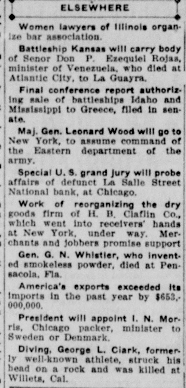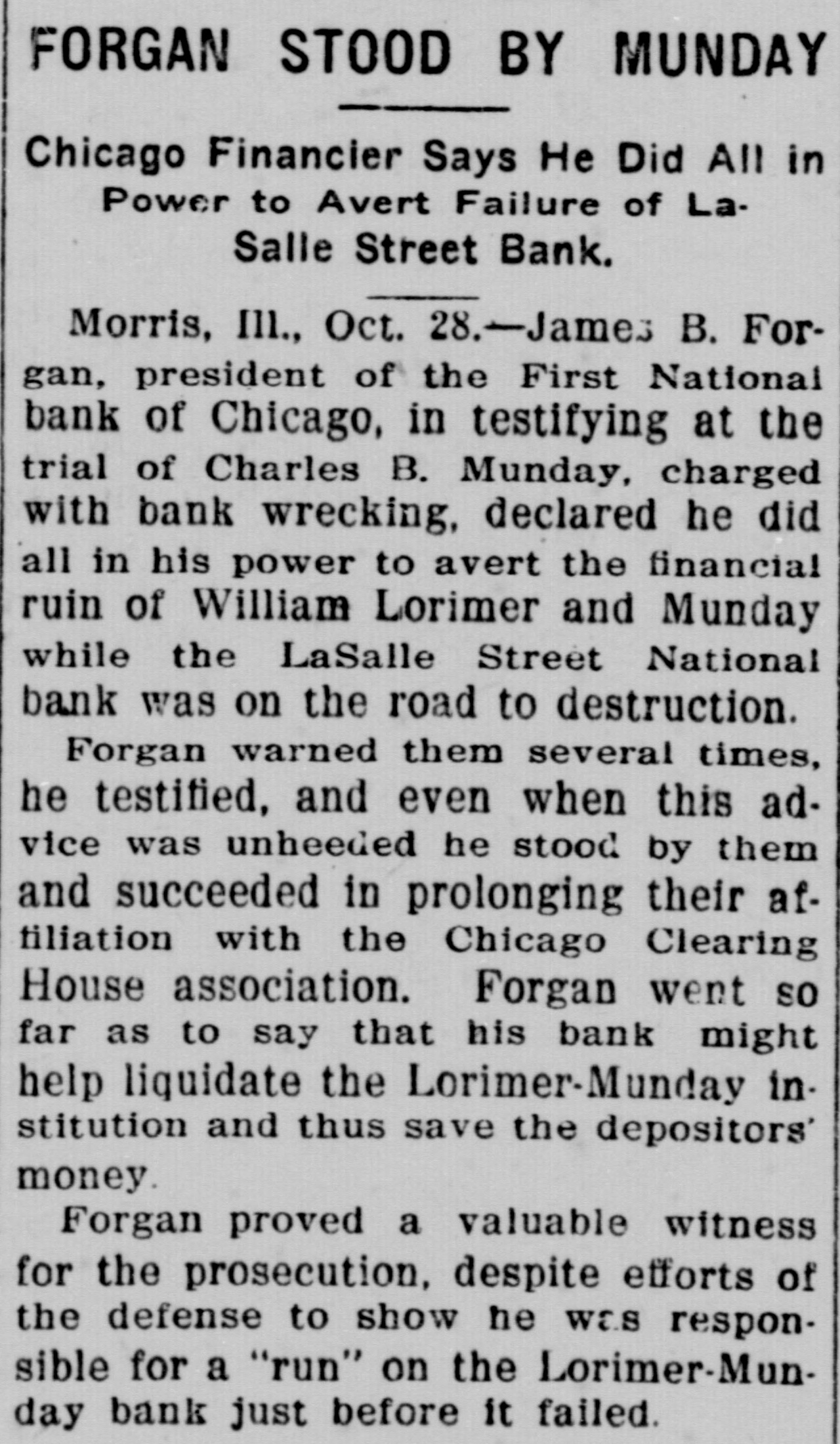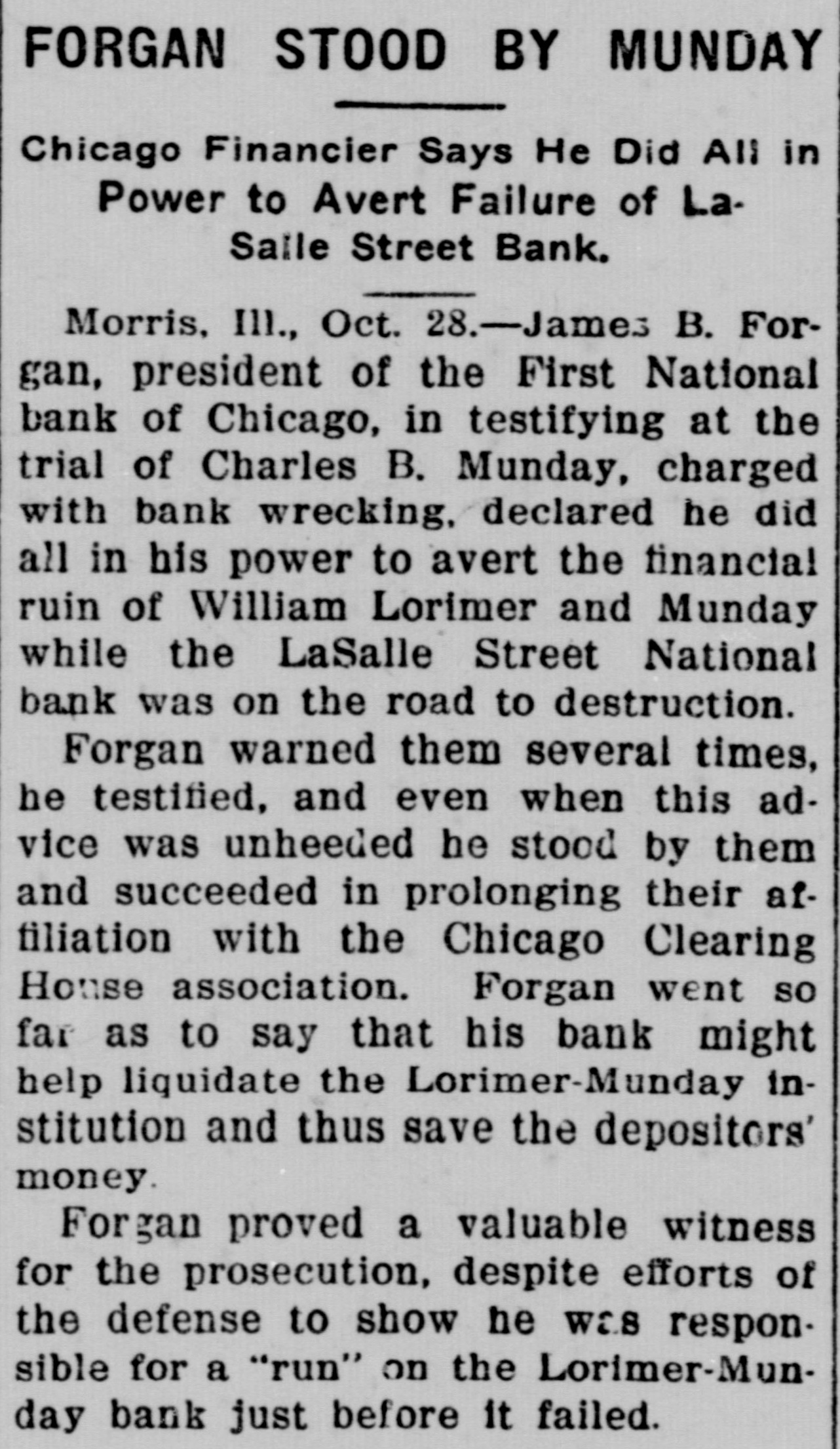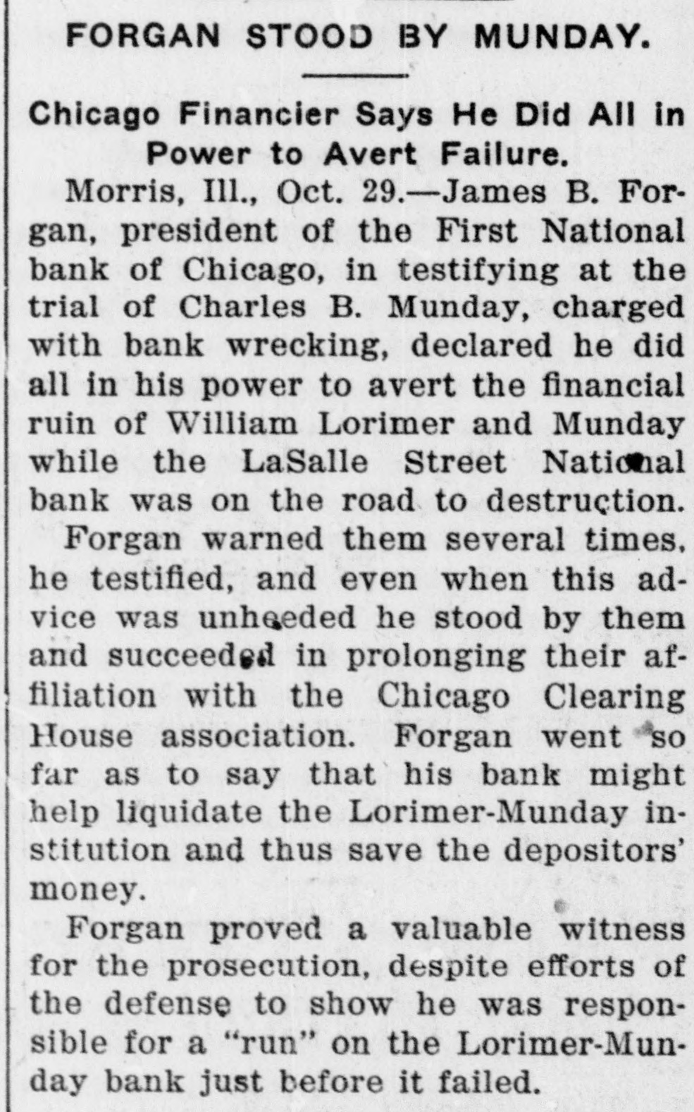 THE BANK MESS United State's Att'y Wilkerson today entered the Lorimer-Munday bank mess and has two assistants going over the books of the old LaSalle Street National Bank. Receiver Niblack discovered loan of $b,000 to Ald. John Coughlin. The alderman sent check for interest on note. State auditor may be asked to appear before the grand jury. No witnesses appeared before Cook county grand jury today, but Hoyne announced four would appear on Friday. Att'y Gen. Lucey defended Brady in not closing bank at time Harkin made his first report. "The law clearly gives bank the right to time, before action is taken," said Lucey. Investigation will be made of loan of $2g,000 by LaSalle Bank to E. K. Kelley, with which amount he became director of Ashland-Twelfth Bank. Rumored that LaSalle Street Bank was in ba dcondition at time it liquidated from national. to state bank and that several former federal officials will be caught in mess. It is openly hinted that many Taft men aided Lorimer "get by." Reported that long ago $750,000 loans were made without security. $200,000 more said to have been dumped into Florida lands. While federal action was pending, State's Attorney Hoyne sprung surprise when he opened up grand -jury action. A summons was secured on Bank Examiner Harkin and the latter is said to have told a sensational story