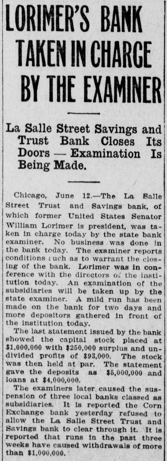 BY ASSOCIATED PRESS. Chicago, June 12.-The La Salle Street Trust and Savings Bank, organized by William Lorimer five years ago when he was United States senator from Illinois, and of which he has since been president, was closed today by the state bank examiner. While rumors of financial trouble had been whispered of late, the actual closing of the institution was a surprise. Coincident with this action examiners closed three state banks which had heavy deposits with the larger institution. No statement of what the closing of the La Salle Street Bank actually means in dollars was made by the examiner. Recent reports to the state auditor's office placed the deposits at more than $5,000,000. For the last three weeks, according to officials, there has been a mild run on the bank
