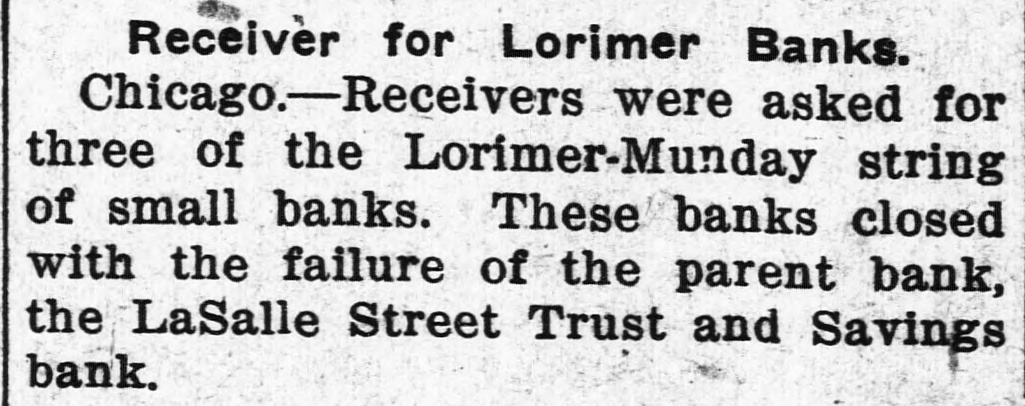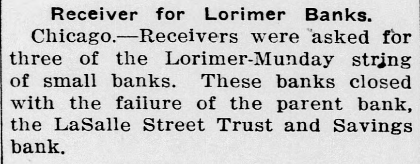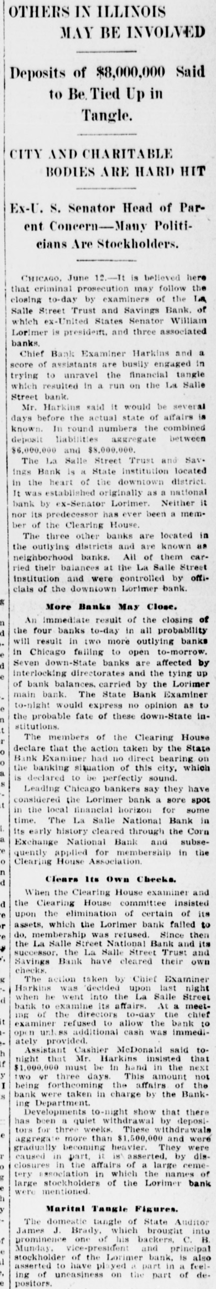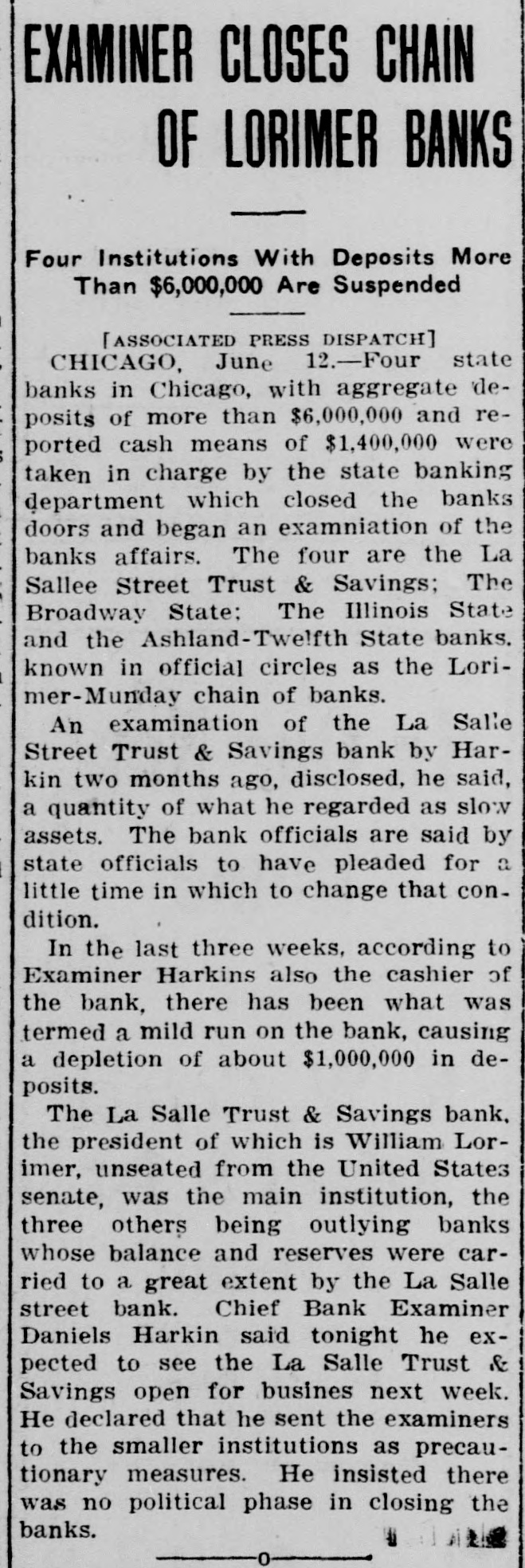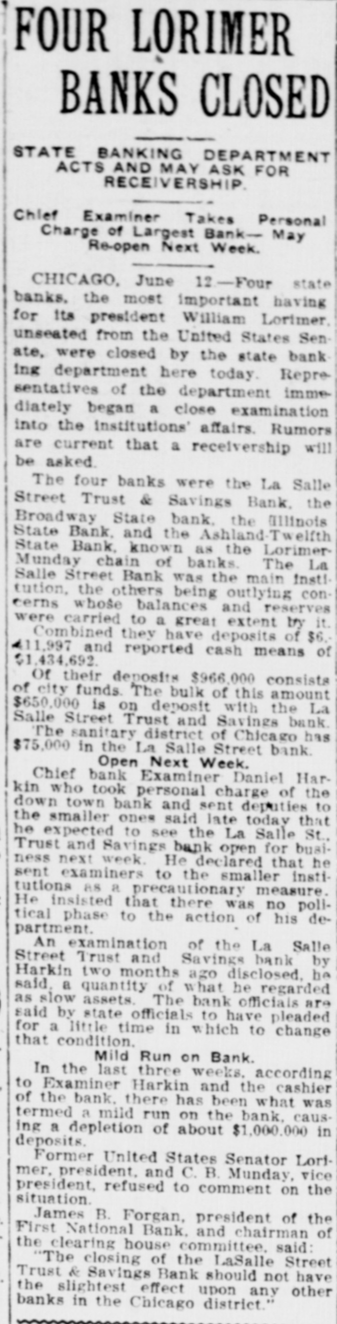 EXAMINER CLOSES CHAIN OF LORIMER BANKS Four Institutions With Deposits More Than $6,000,000 Are Suspended [ASSOCIATED PRESS DISPATCH] CHICAGO, June .-Four state banks in Chicago, with aggregate deposits of more than $6,000,000 and reported cash means of $1,400,000 were taken in charge by the state banking department which closed the banks doors and began an examniation of the banks affairs. The four are the La Sallee Street Trust & Savings; The Broadway State: The Illinois State and the Ashland-Twelfth State banks. known in official circles as the Lorimer-Munday chain of banks. An examination of the La Salle Street Trust & Savings bank by Harkin two months ago, disclosed, he said, a quantity of what he regarded as slow assets. The bank officials are said by state officials to have pleaded for a little time in which to change that condition. In the last three weeks, according to Examiner Harkins also the cashier of the bank, there has been what was termed a mild run on the bank, causing a depletion of about $1,000,000 in deposits. The La Salle Trust & Savings bank, the president of which is William Lorimer, unseated from the United States senate, was the main institution, the three others being outlying banks whose balance and reserves were carried to a great extent by the La Salle street bank. Chief Bank Examiner Daniels Harkin said tonight he expected to see the La Salle Trust & Savings open for busines next week. He declared that he sent the examiners to the smaller institutions as precautionary measures. He insisted there was no political phase in closing the banks. U